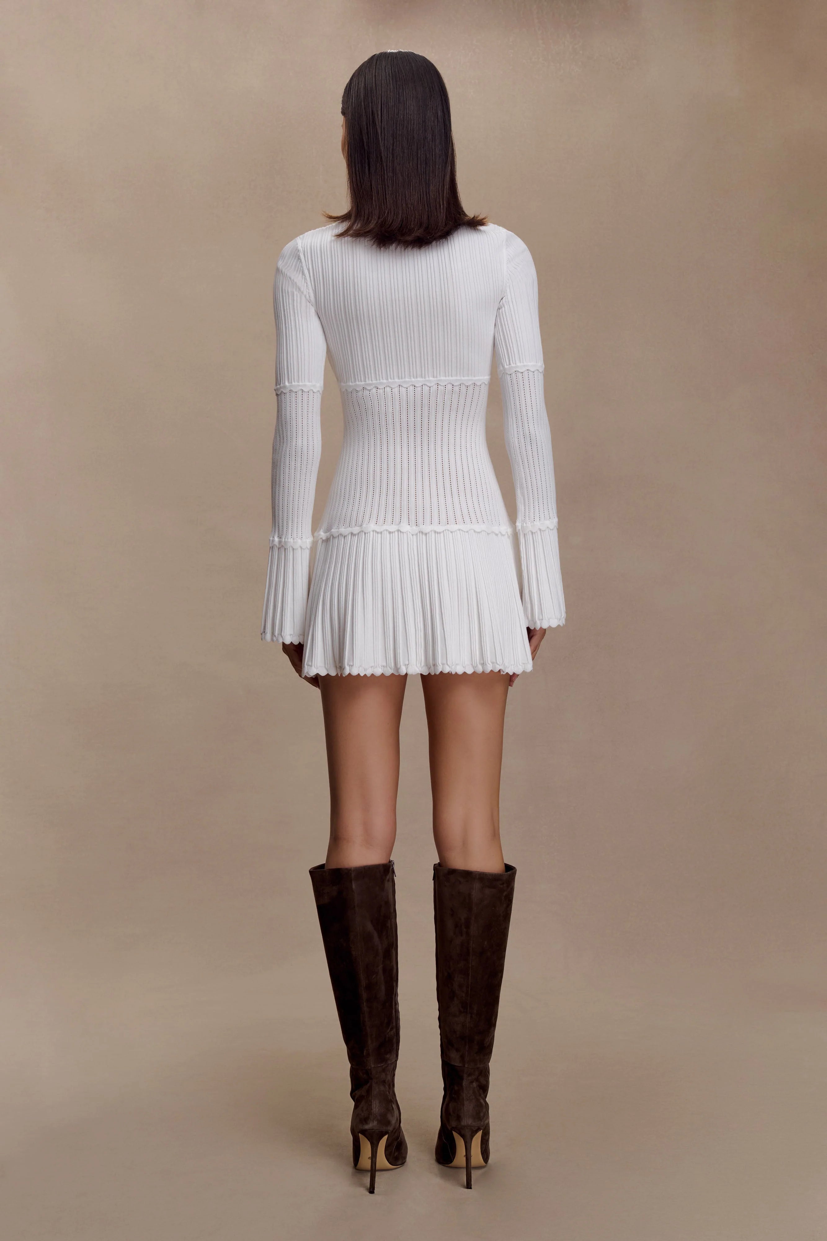 The ADENA Pointelle Knit Mini Dress is a feminine take on everyday knitwear. Crafted from pointelle knit fabrication with subtle scalloped detailing, it features a sleek turtle neckline and long sleeves for a polished finish. The fitted bodice flows into a mini-length A-line hem, balancing structure with movement. Left unlined for a lightweight feel, this dress combines softness with refined detail for effortless wear from day to night.