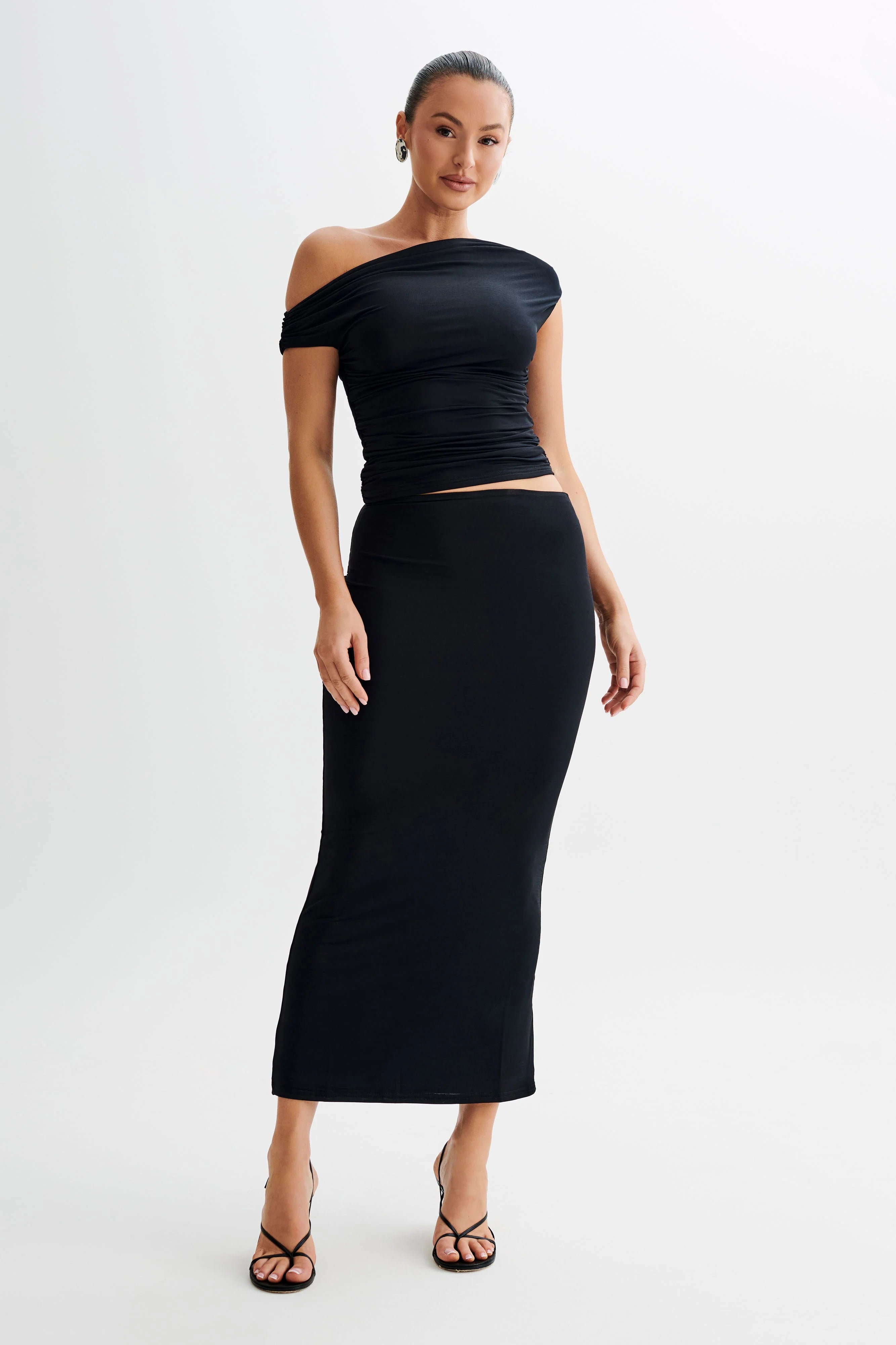 ALAYNA is an asymmetrical top with a straight-cut neckline and strategic ruching. Sewn from a custom blend of elastane and recycled nylon, its stretchy fabrication offers a fairly bodycon fit that highlights your curves. The ruching around the waist and arms further shapes and elongates the body, creating a universally flattering silhouette. Fresh and unique, this seasonal must-have can be worn as a solo feature or layered with a textured blazer.