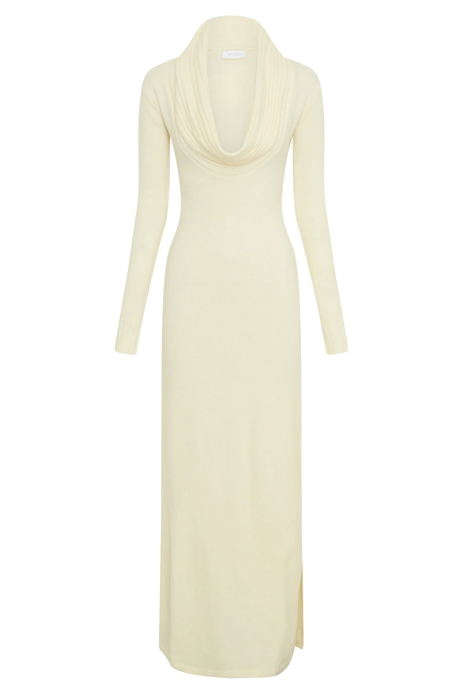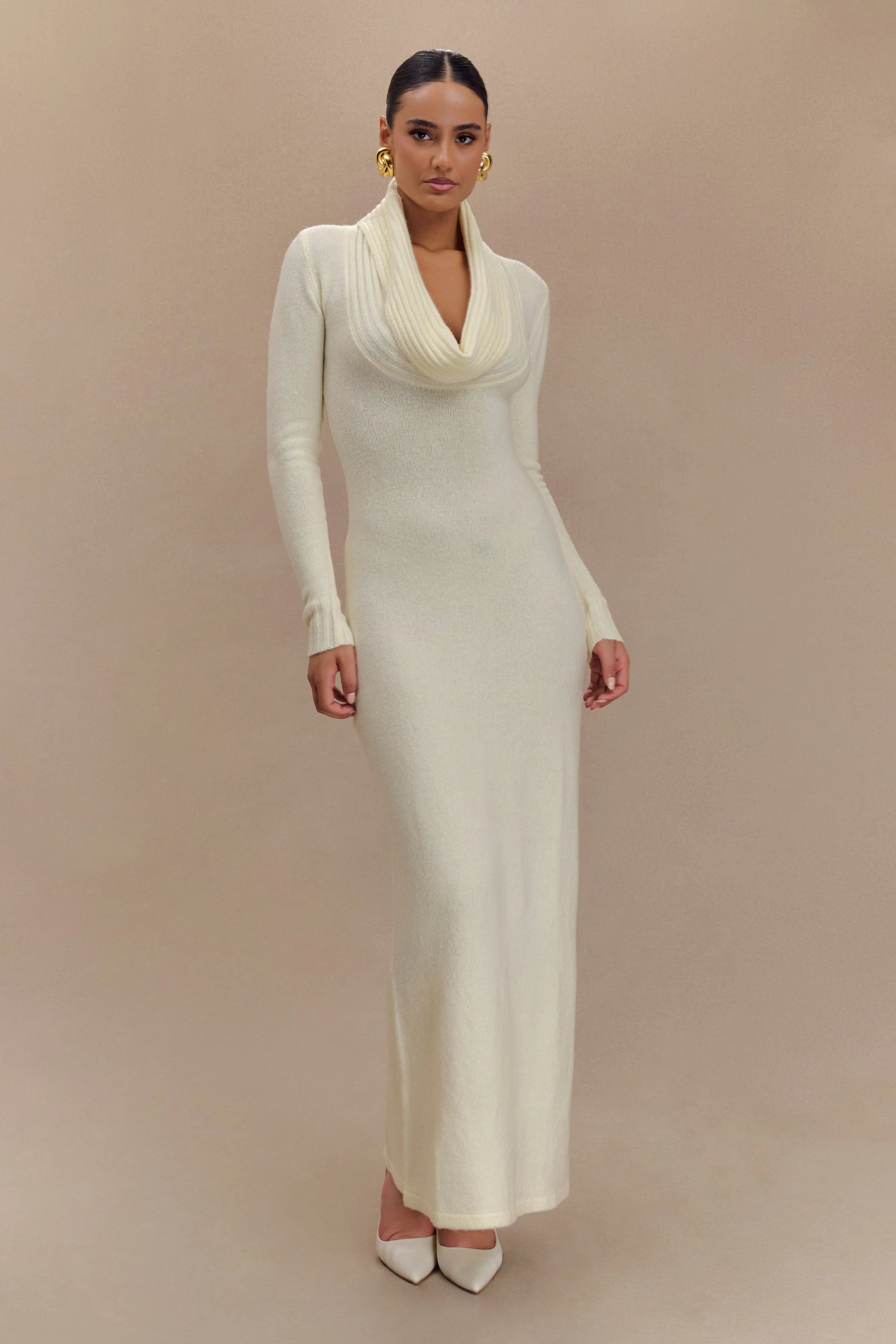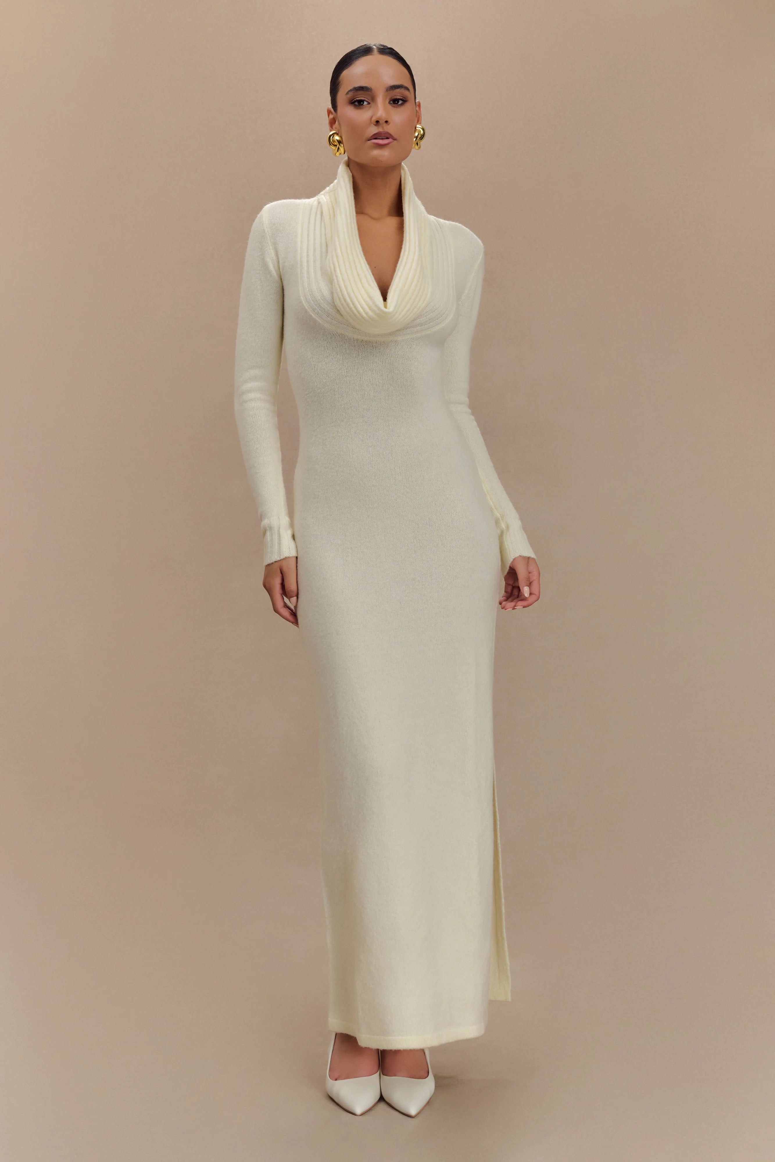 Introducing the ALESSANDRA Reversible Knit Maxi Dress, a stunning, multi-wear piece designed for the modern woman. This long sleeve dress features a striking deep plunge neckline that can be reversed for a low scoop back, offering two distinct looks in one. The cowl-shaped neckline adds a soft, draped elegance, while the bodycon fit hugs your figure in all the right places. Crafted with a ribbed overlay panel detail, it enhances the silhouette, flowing into a straight skirt shape for a sleek, elongated look. The unlined knit fabric ensures comfort and ease of movement, making this maxi dress both chic and effortless for day-to-night wear.