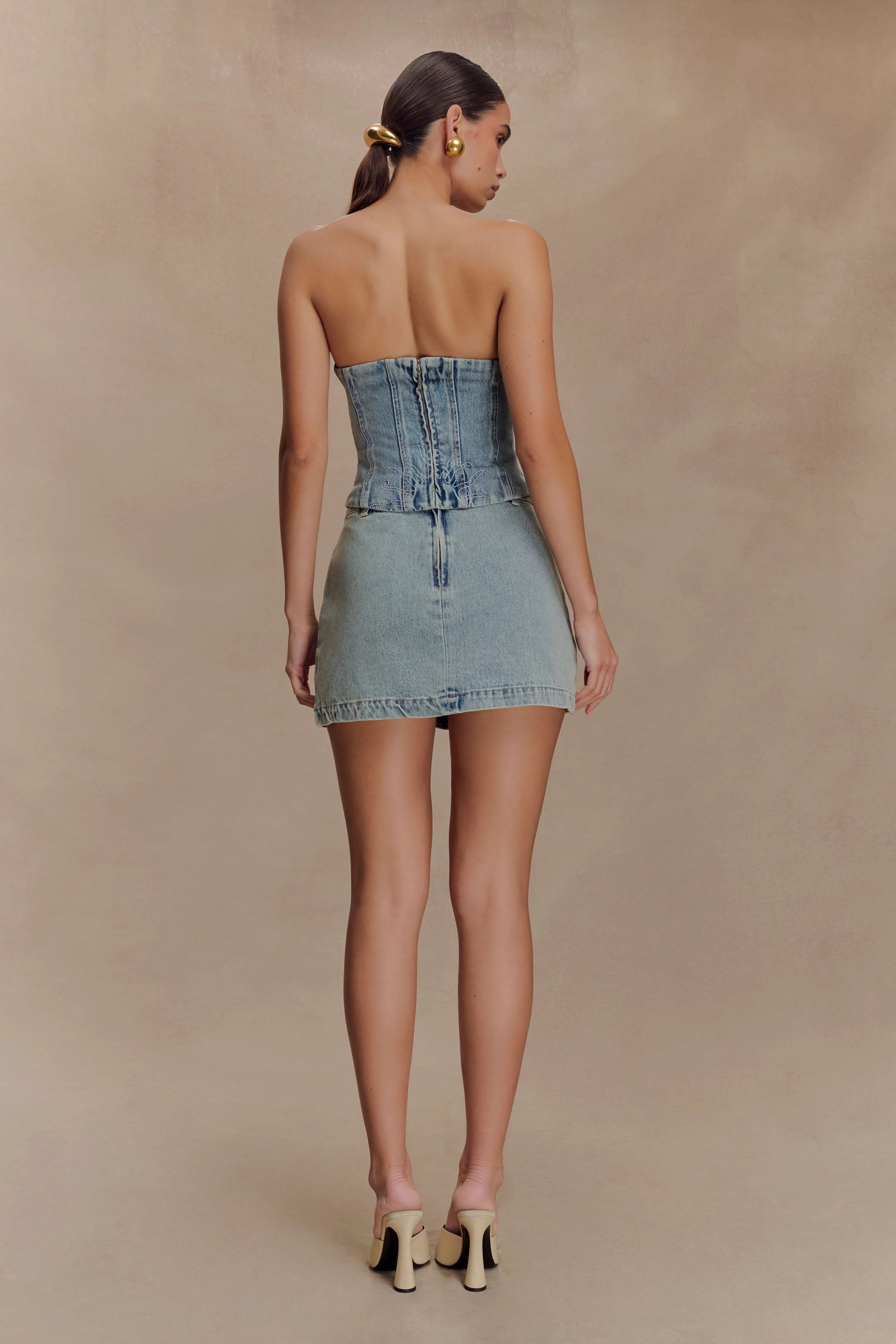 The ALESSIA Embroidered Denim Mini Skirt is a playful essential with a tailored twist. Featuring a mid-rise waistline, side zip closure, and classic belt loops, this mini silhouette is finished with rounded leg cut-out detailing for a soft sculpted look. A delicate sun embroidery adds a touch of vacation charm, making it the perfect piece for sunny getaways and warm-weather styling.