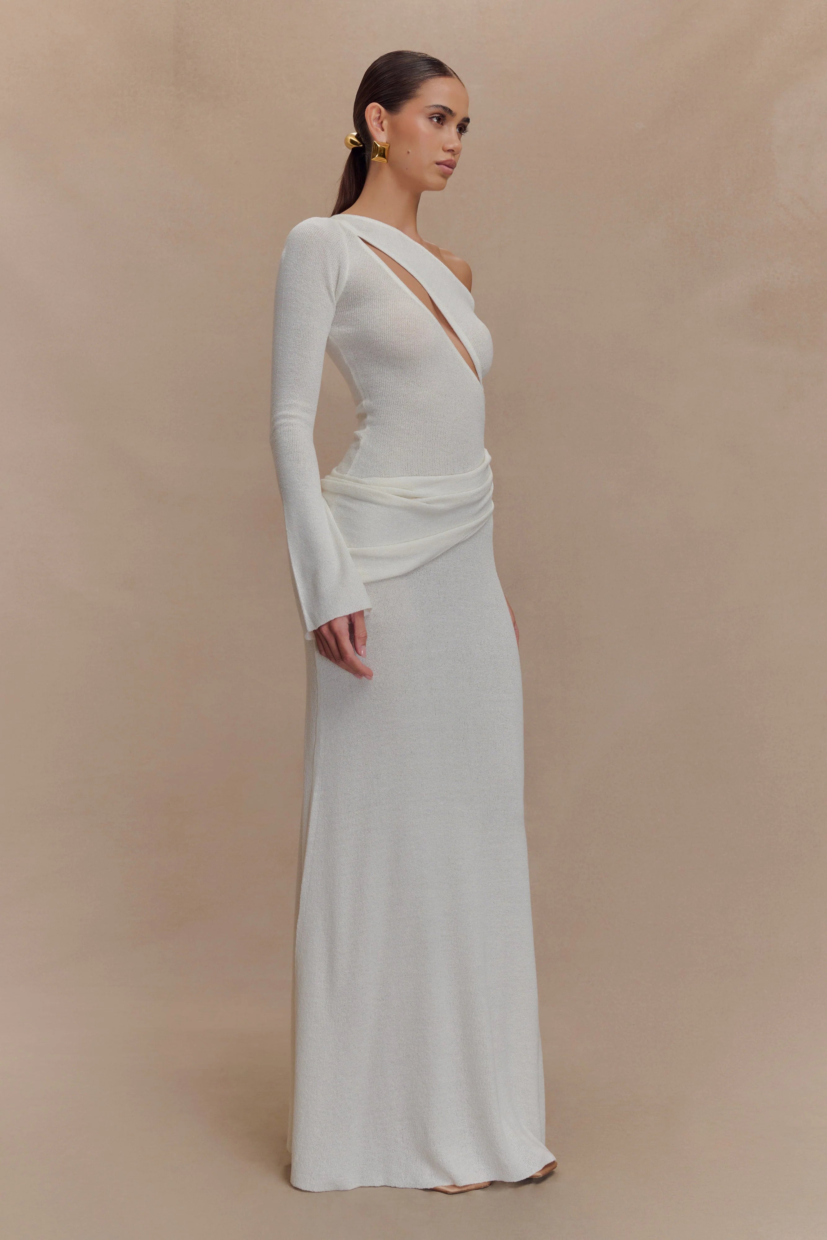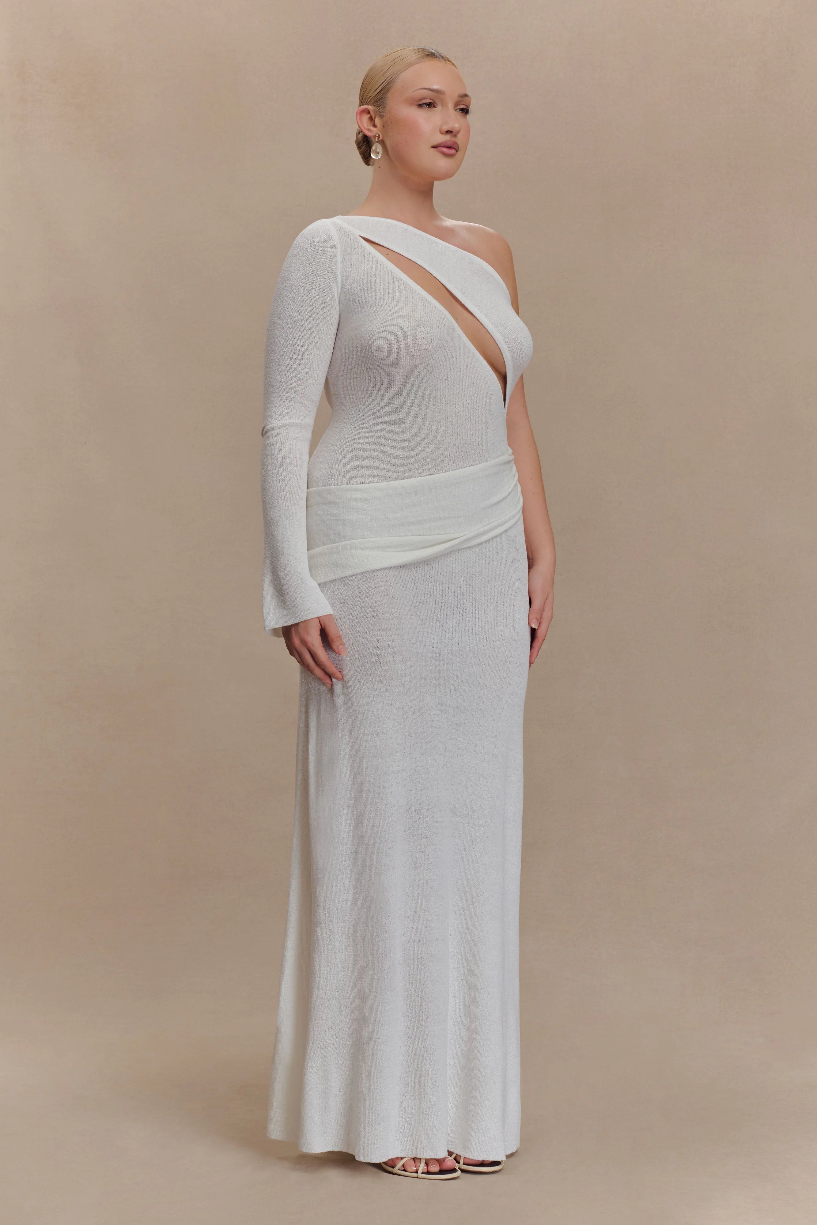 The ALEXIUS One Shoulder Knit Maxi Dress is a striking blend of modern design and comfortable knitwear. Featuring an asymmetrical neckline with a single long sleeve and front bust cutout, this fitted silhouette makes a confident statement. A gathered overlay panel drapes across the hip for added texture and movement, while the unlined knit keeps it lightweight and body-hugging. Finished in a maxi length, this dress is the perfect piece for elevated evenings, standout events, or any moment that calls for soft structure and strong style.