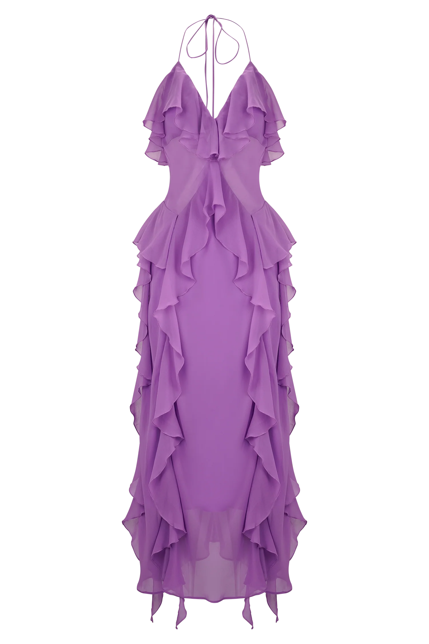 The ALEYNA Chiffon Ruffle Midi Dress is a dreamy blend of elegance and flirtation. Designed with a halter neck tie and V neckline, it skims the body in a relaxed bodycon silhouette that flatters without restriction. Sheer side panels add a soft hint of allure, while cascading ruffle details create movement and charm with every step. Partially lined for just the right amount of coverage, this dress is your go-to for romantic getaways, destination events, and moonlit dinners.