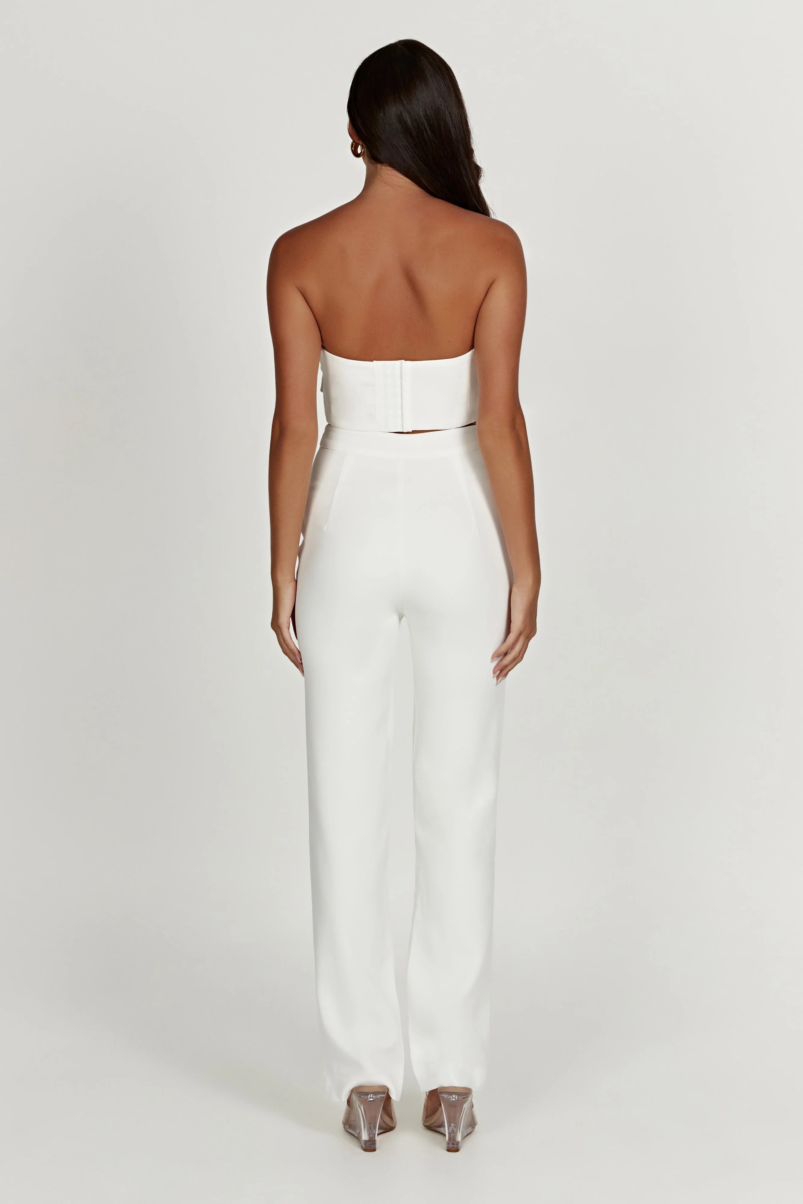 The ALLANAH Straight Leg Pants are a wardrobe staple in any hue but we’ve released them in white for brides looking for a non-traditional wedding day styling alternative. Crafted from our much-loved MESHKI crepe fabrication, these offer a full-length fit and straight leg design, while the high waist and fly closure add a formal touch. Pair with our for a season of festivities.