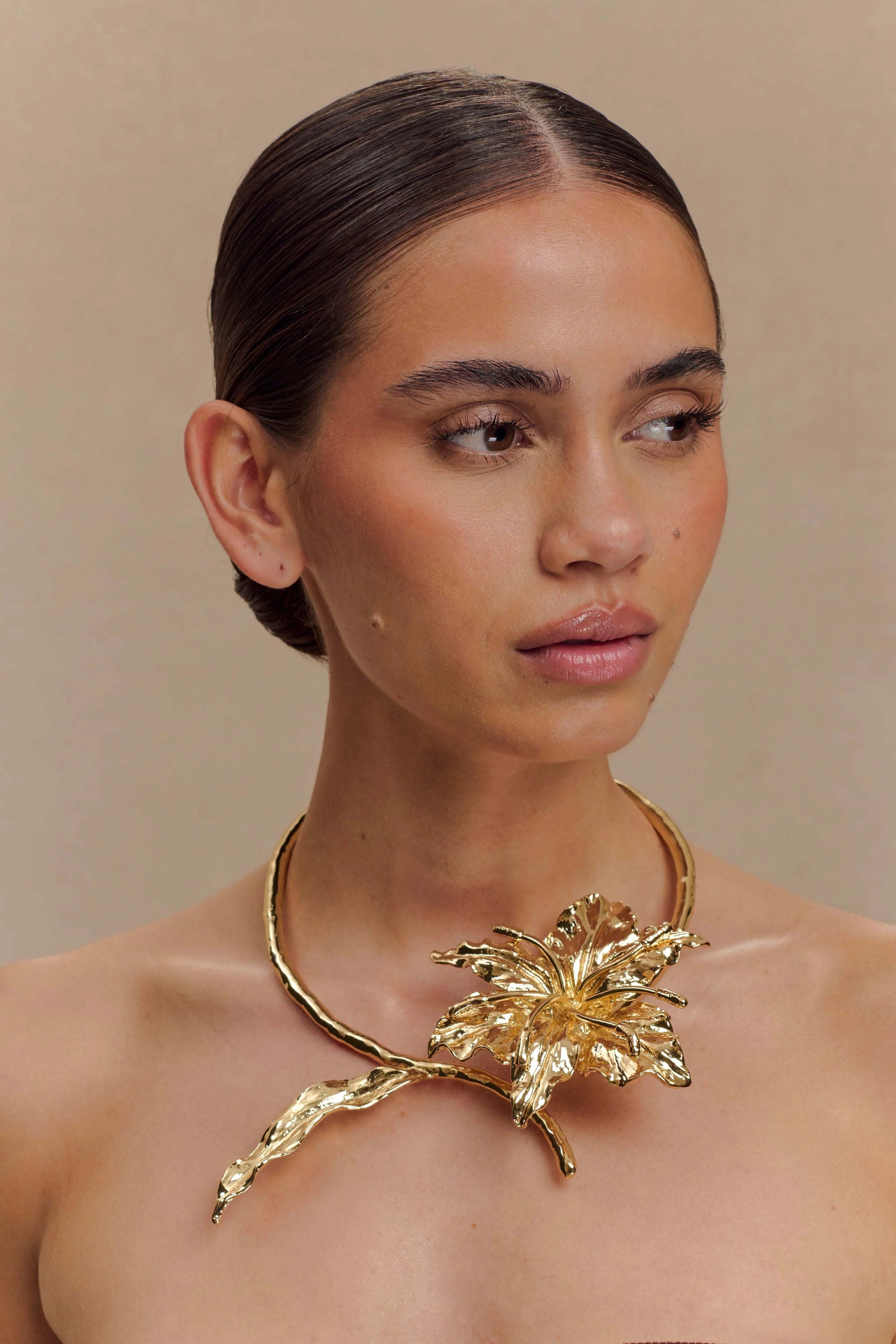 The ALLONA Floral Choker is a statement in soft elegance and sculptural detail. Designed in an intricate vine-like silhouette, this 18K gold-plated piece wraps the neckline with modern grace. Featuring a delicate lily flower detail and a secure hinge back closure, it blends romantic accents with bold impact. Whether layered or worn solo, this choker is your golden touch for events, holidays, or everyday elevation.