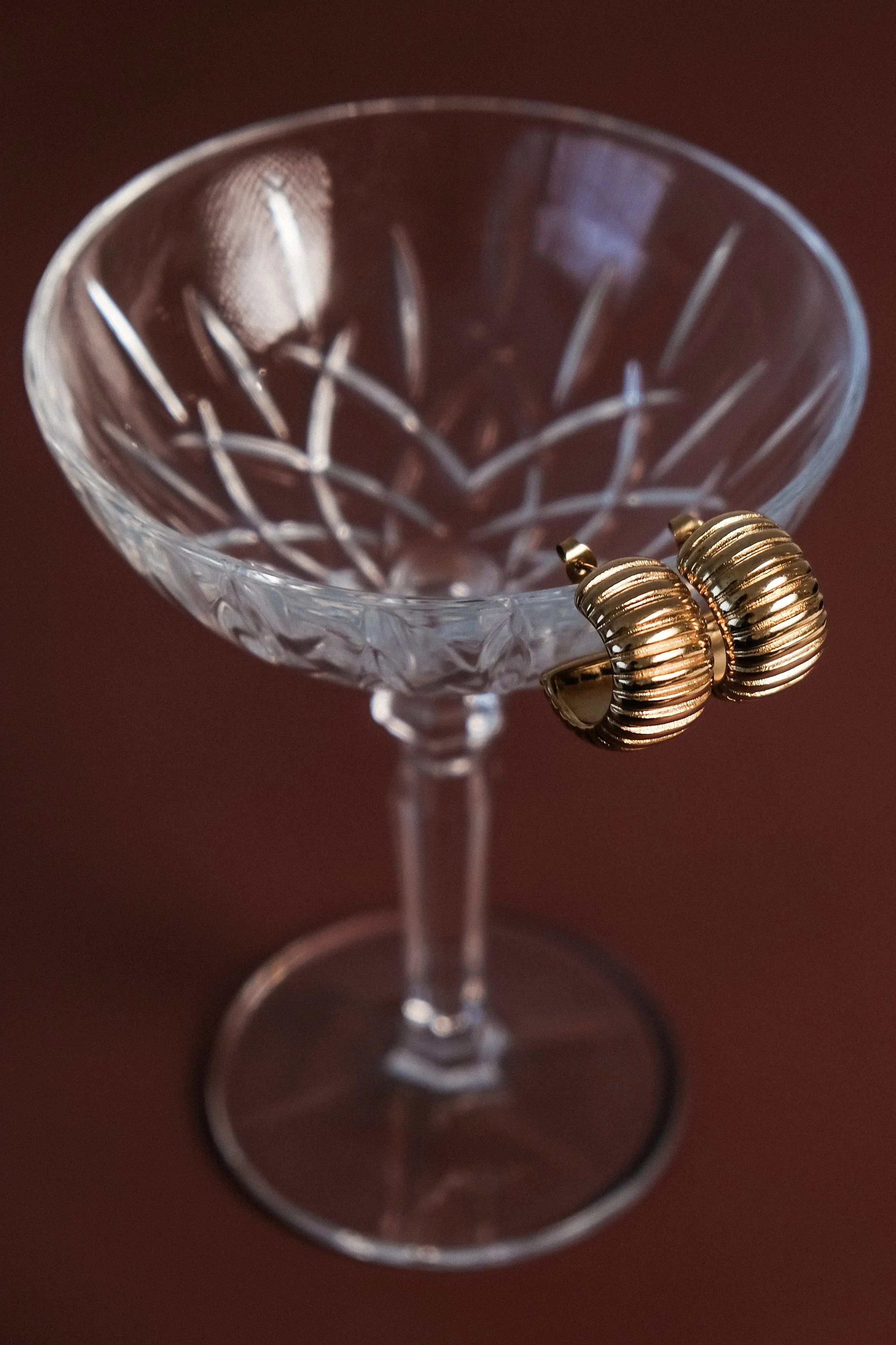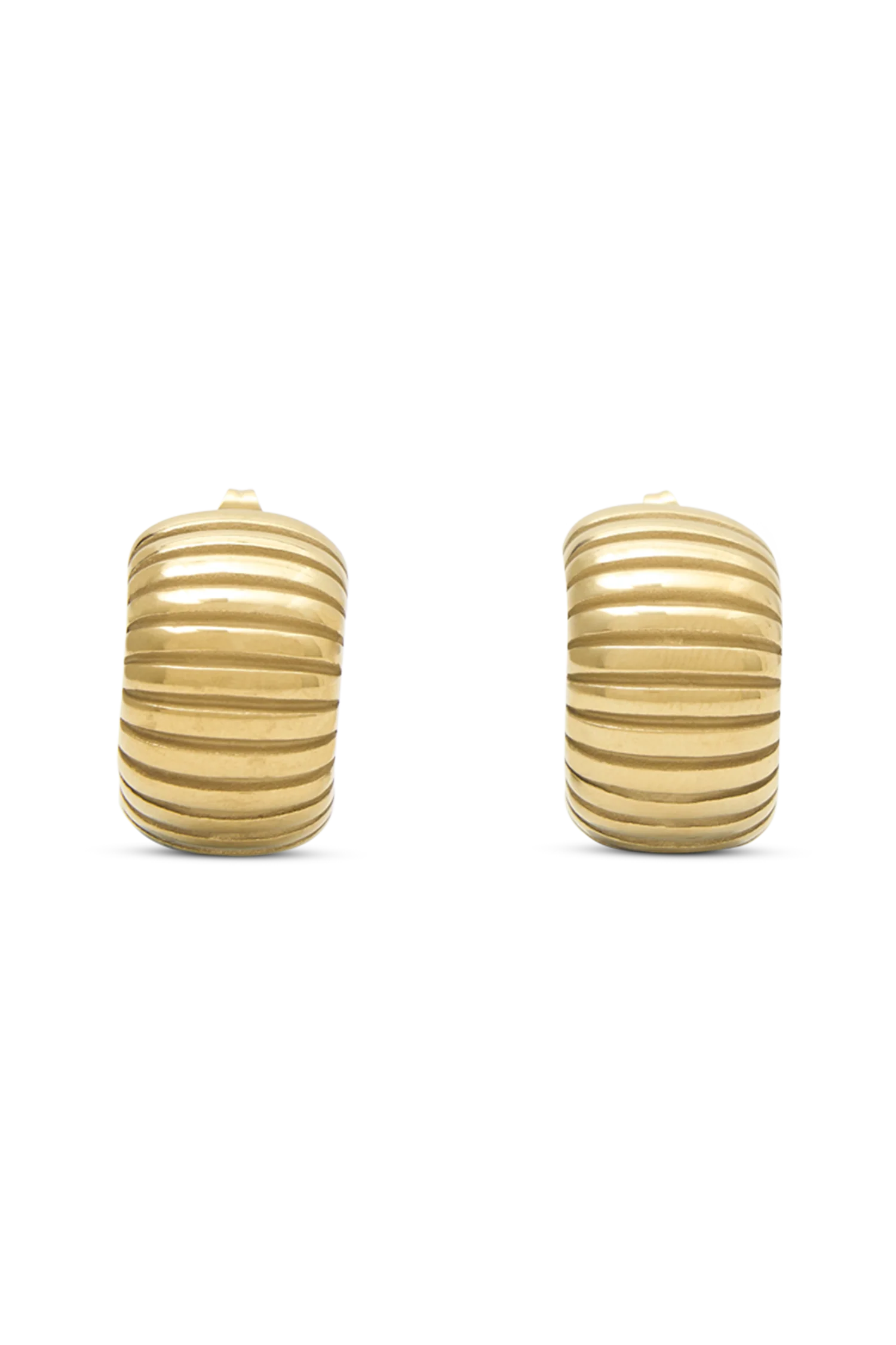 The AMELIA Textured Hoop Earrings offer a blend of timeless sophistication and contemporary design. Featuring a post stud for a secure and comfortable fit, these earrings are crafted in a half-hoop shape that elegantly frames the ear. The horizontal ribbed detailing adds a dynamic texture, enhancing the rounded silhouette. Plated in 18K gold, the Amelia Hoops exude a luxurious glow, making them a versatile accessory that effortlessly transitions from everyday wear to special occasions with effortless style.