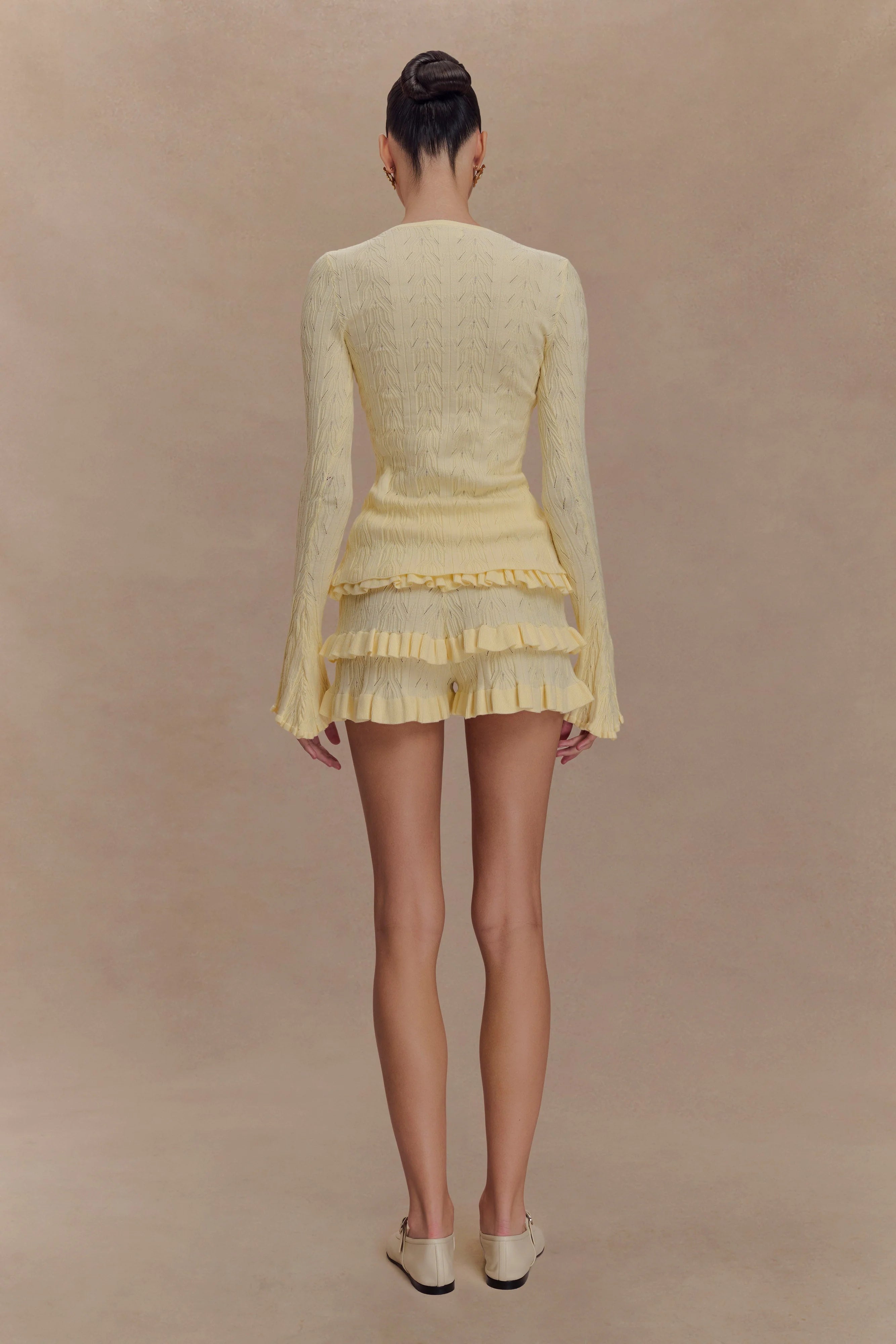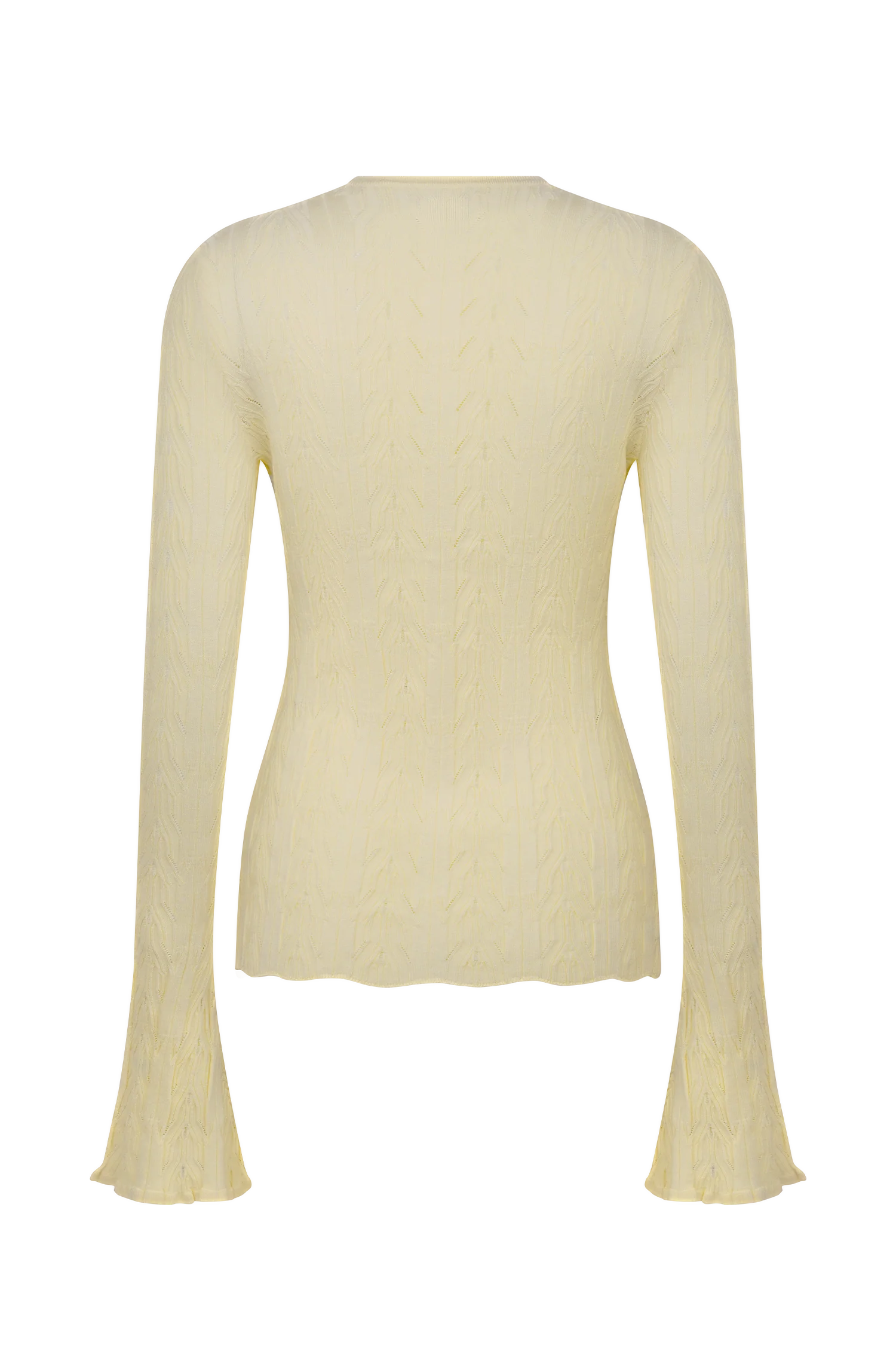 The AMY Pointelle Bell Sleeve Cardigan is a dreamy blend of femininity and vintage-inspired elegance. Designed with a classic round neckline and a button-front closure, this cardigan offers a timeless silhouette with a romantic touch. The intricate pointelle knit adds soft texture, while the long sleeves gracefully flare into a bell-shaped hem for effortless movement. Lightweight and versatile, pair it perfectly with the for a coordinated look that’s both playful and refined.