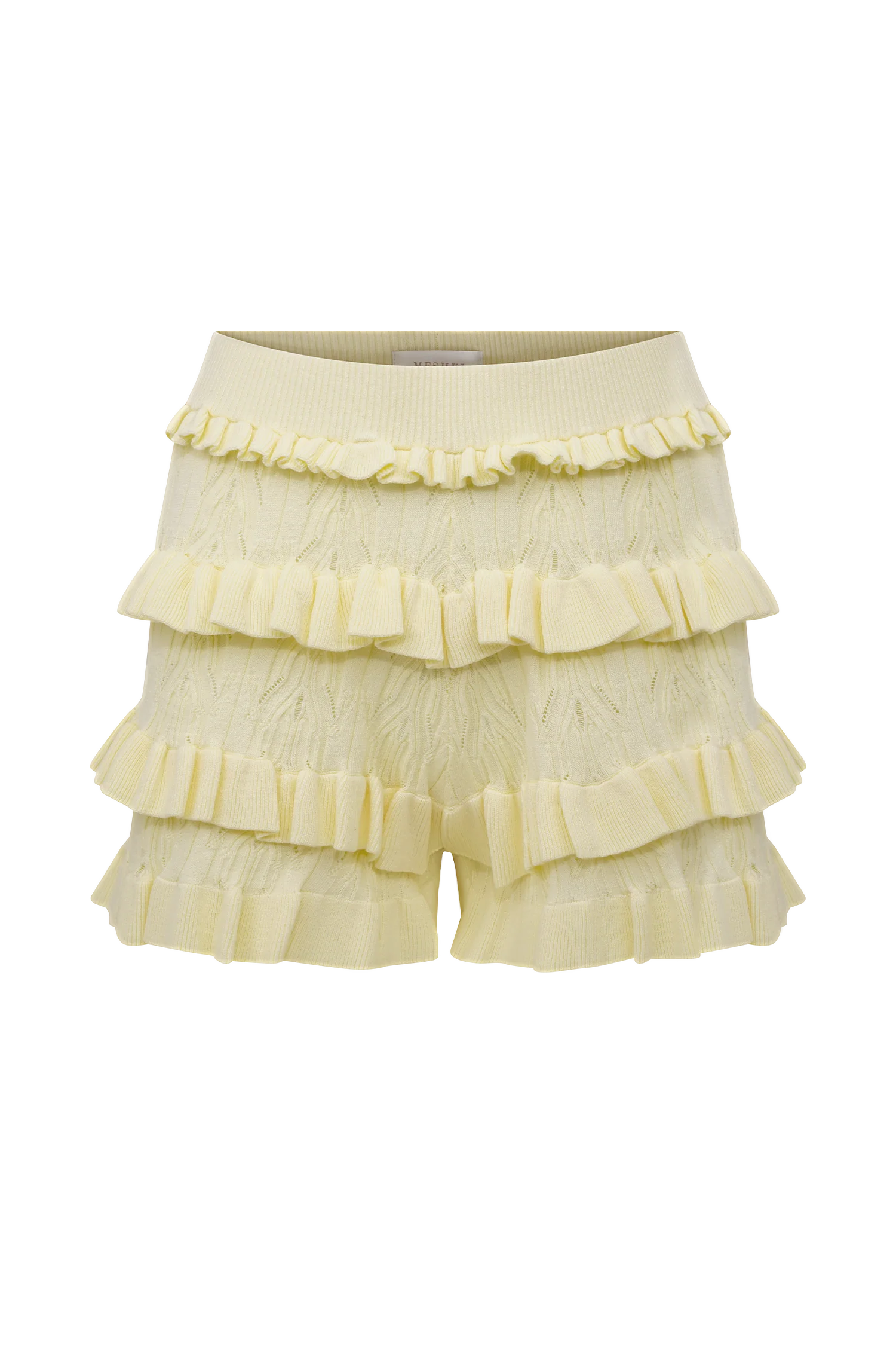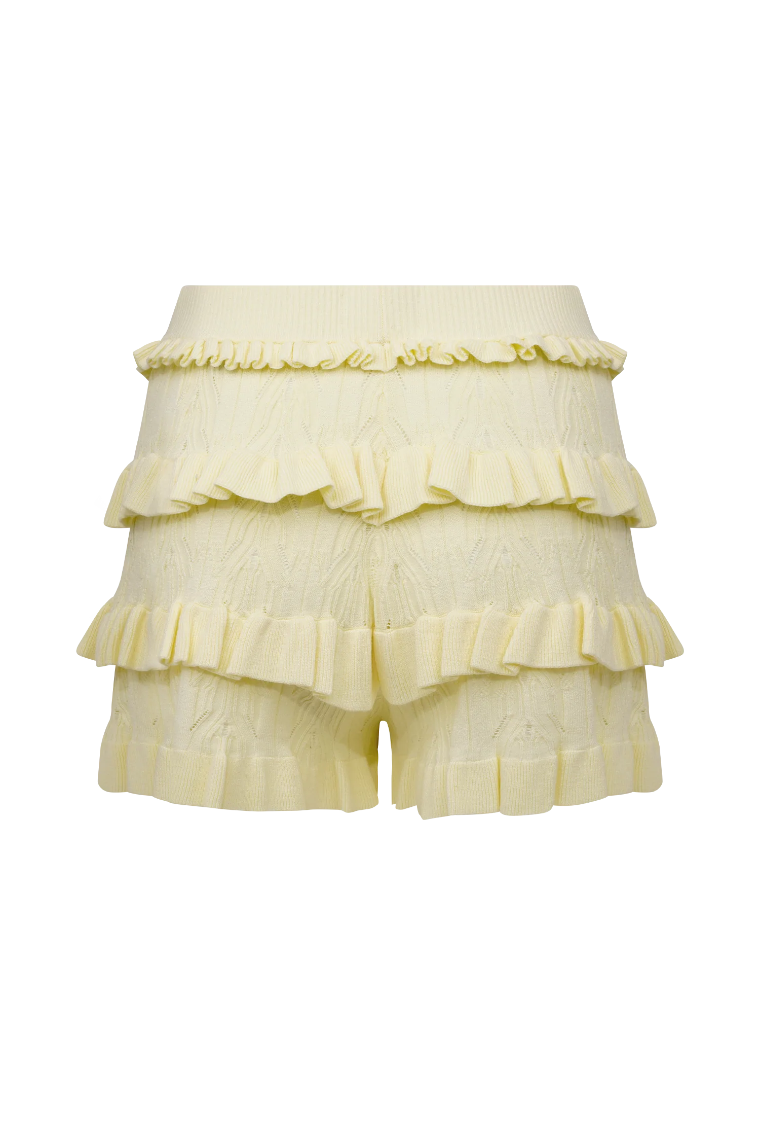 The AMY Pointelle Knit Frill Bloomers bring a playful yet refined touch to your wardrobe. Designed with a flattering high-waisted fit and a comfortable elastic waistband, these mini-length bloomers offer a charming silhouette. Delicate ruffle details add a feminine flair, while the intricate pointelle knit keeps the look soft and airy. Left unlined for a lightweight feel, they pair effortlessly with the for a coordinated ensemble that’s both romantic and effortlessly chic.