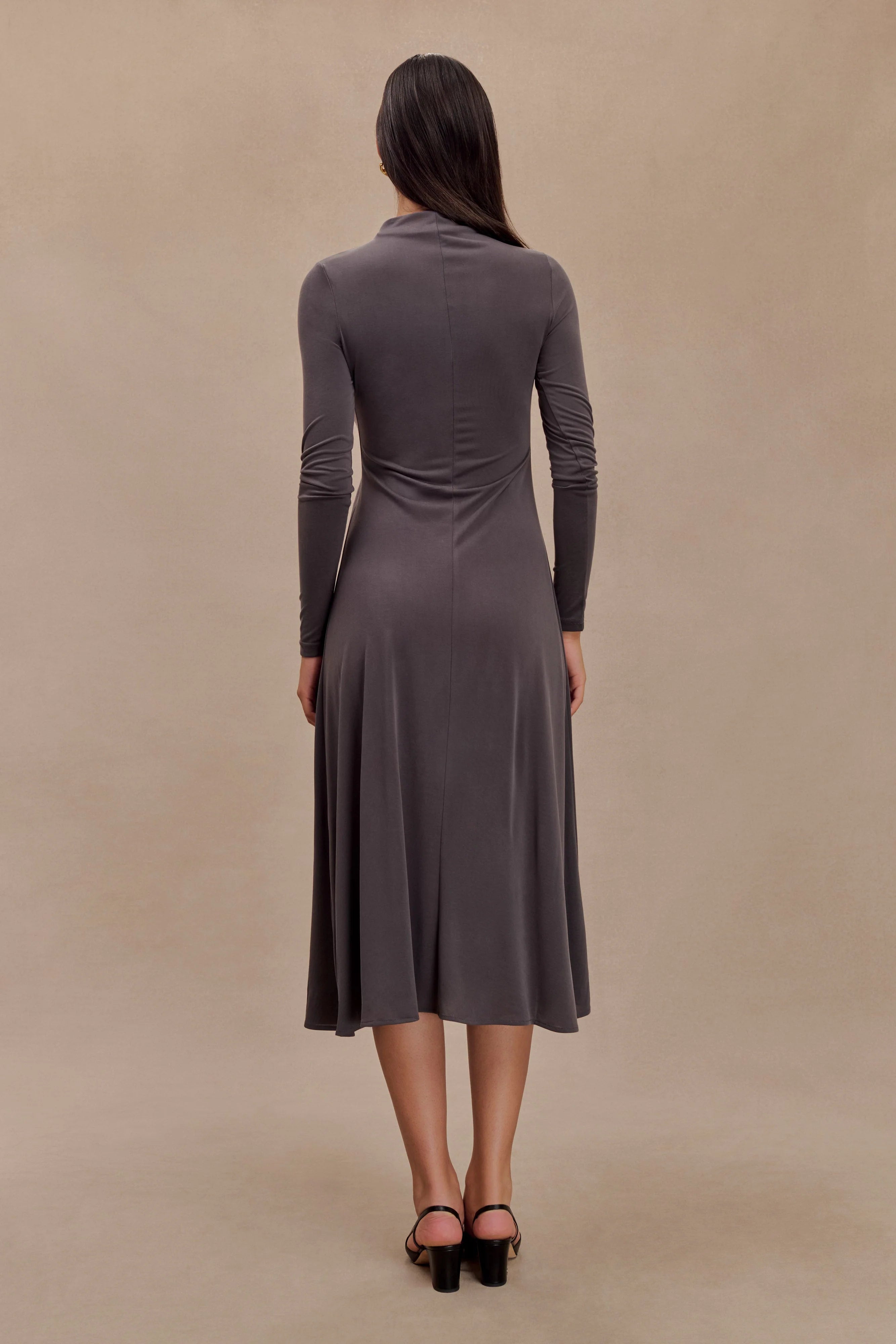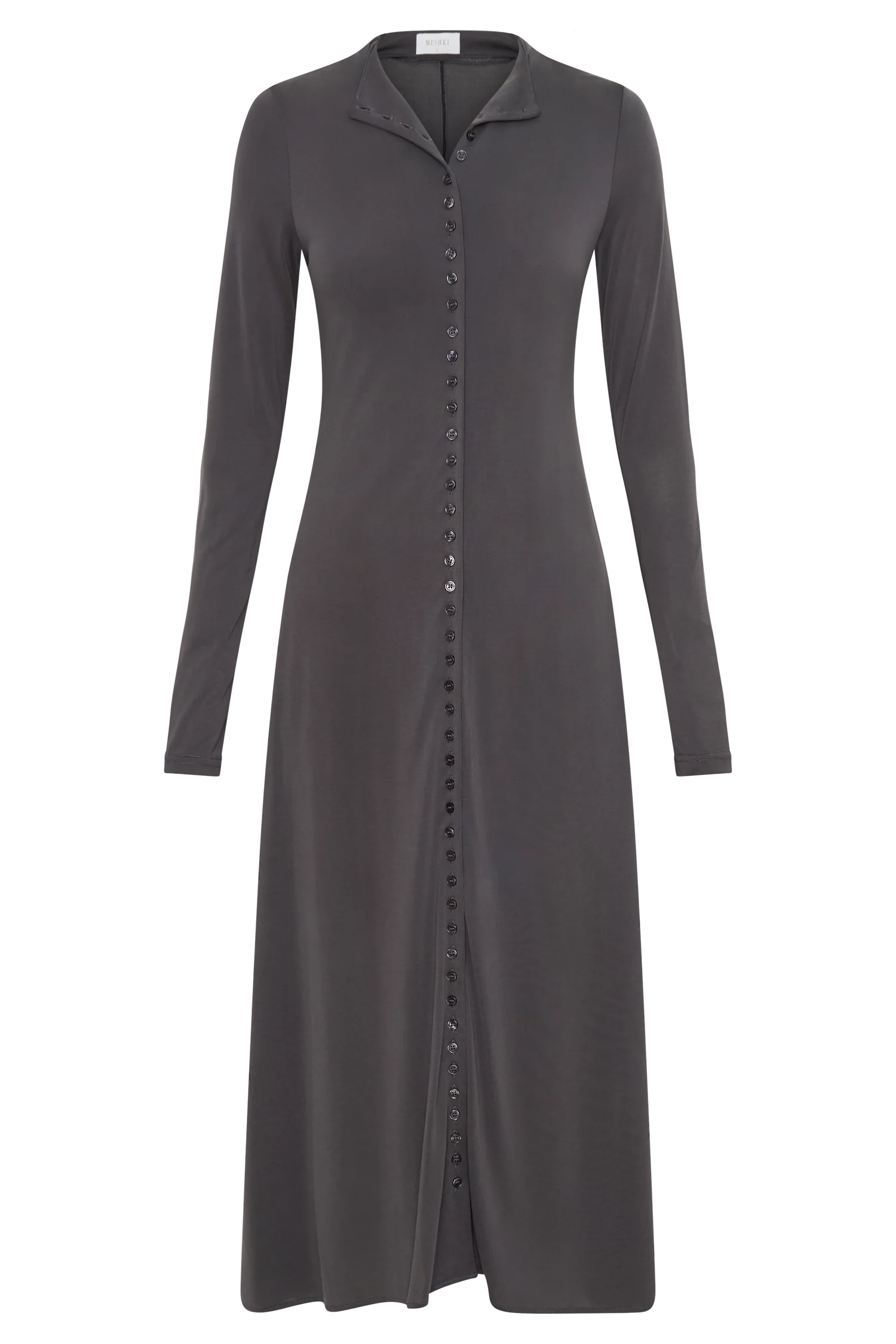 The ANDERS Peached Jersey Midi Dress combines comfort with sophistication. Featuring a grown-on neckline and long sleeves, this dress provides a sleek and fitted silhouette that flatters your figure. The maxi length and flared hem create an elegant flow, while the functional centre front button closure adds a classic touch. Crafted from soft peached jersey, this dress offers a cozy yet refined look, perfect for both casual and semi-formal occasions.
