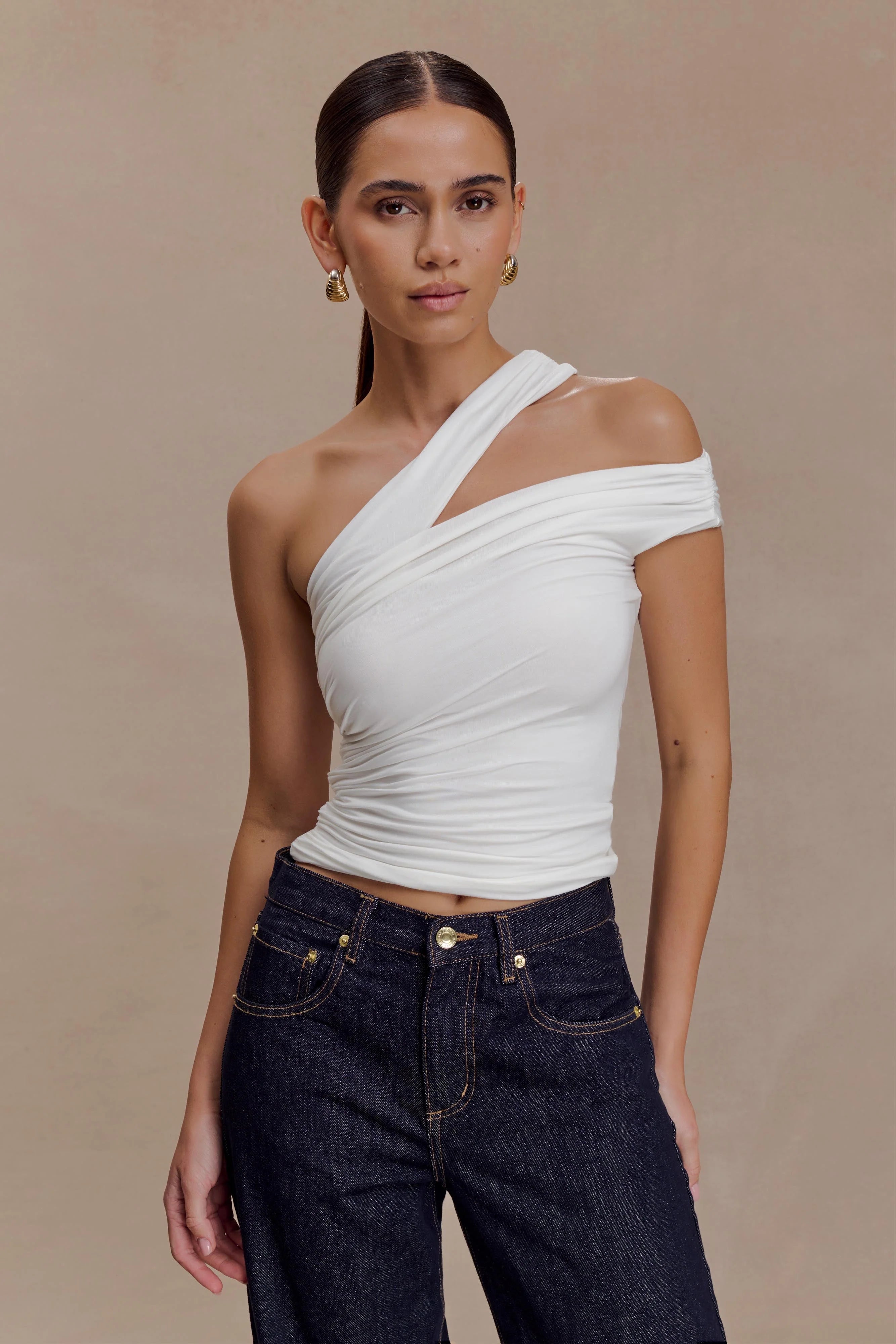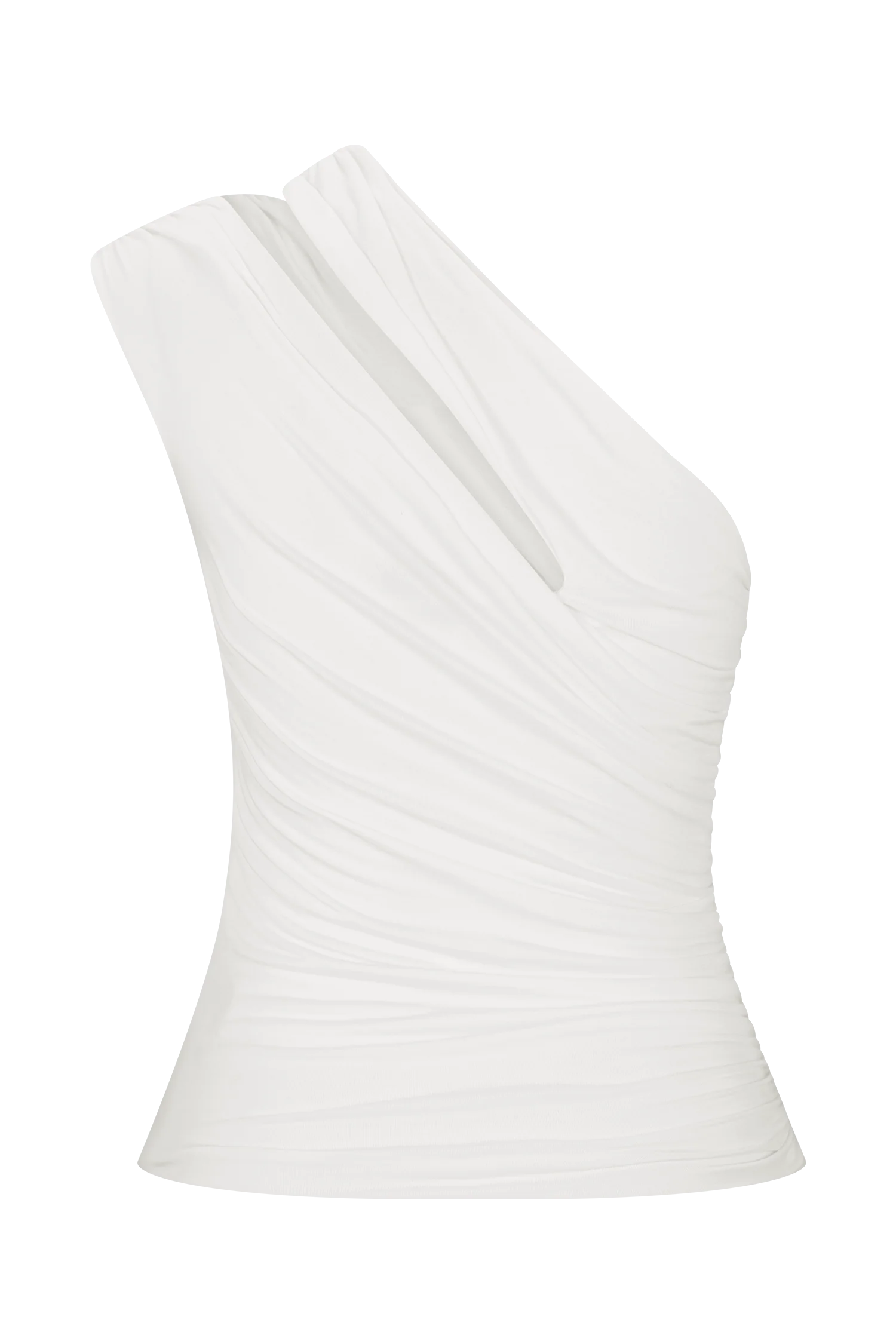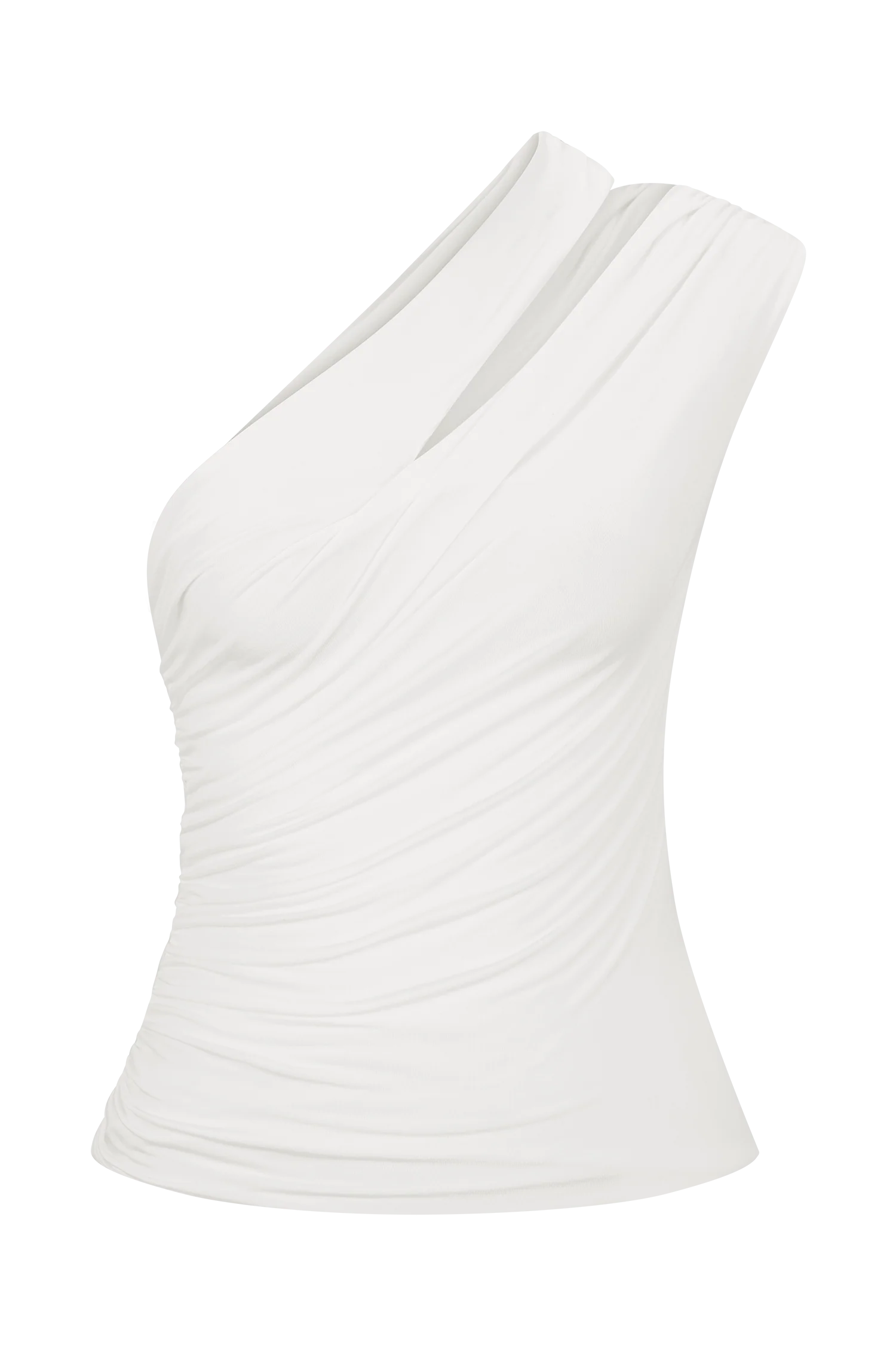 The ANNA One Shoulder Modal Top is a sleek wardrobe staple with a directional twist. Featuring a single-shoulder neckline with a cut-out detail, it frames the décolletage with subtle allure. The gathered, fitted bodice sculpts the silhouette, while the sleeveless design keeps the look clean and minimal. Fully lined for comfort, this top balances elevated simplicity with a contemporary edge—perfect for pairing with tailored pants or statement skirts.