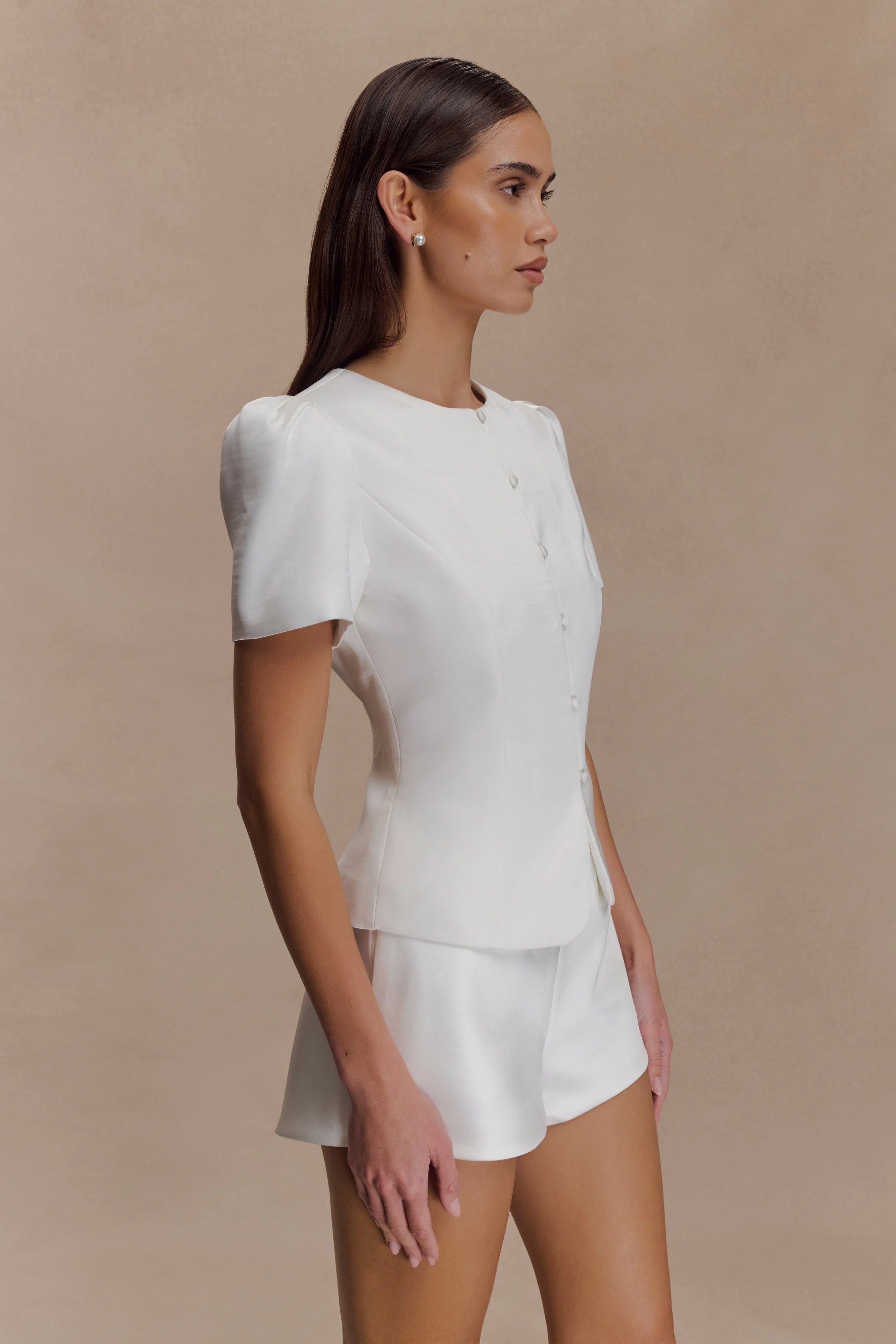 The ANNE Satin Mini Short blends structure and softness for effortless everyday polish. Featuring a mid-rise waistline and flattering A-line silhouette, it’s designed with front and back waist darts to contour the figure. Side pockets add practicality, while the invisible back zip ensures a seamless finish. Crafted from a structured satin fabrication and fully lined, this mini short brings a touch of luxury to your warm-weather wardrobe—perfect paired with its matching top or styled solo for a modern, feminine look.