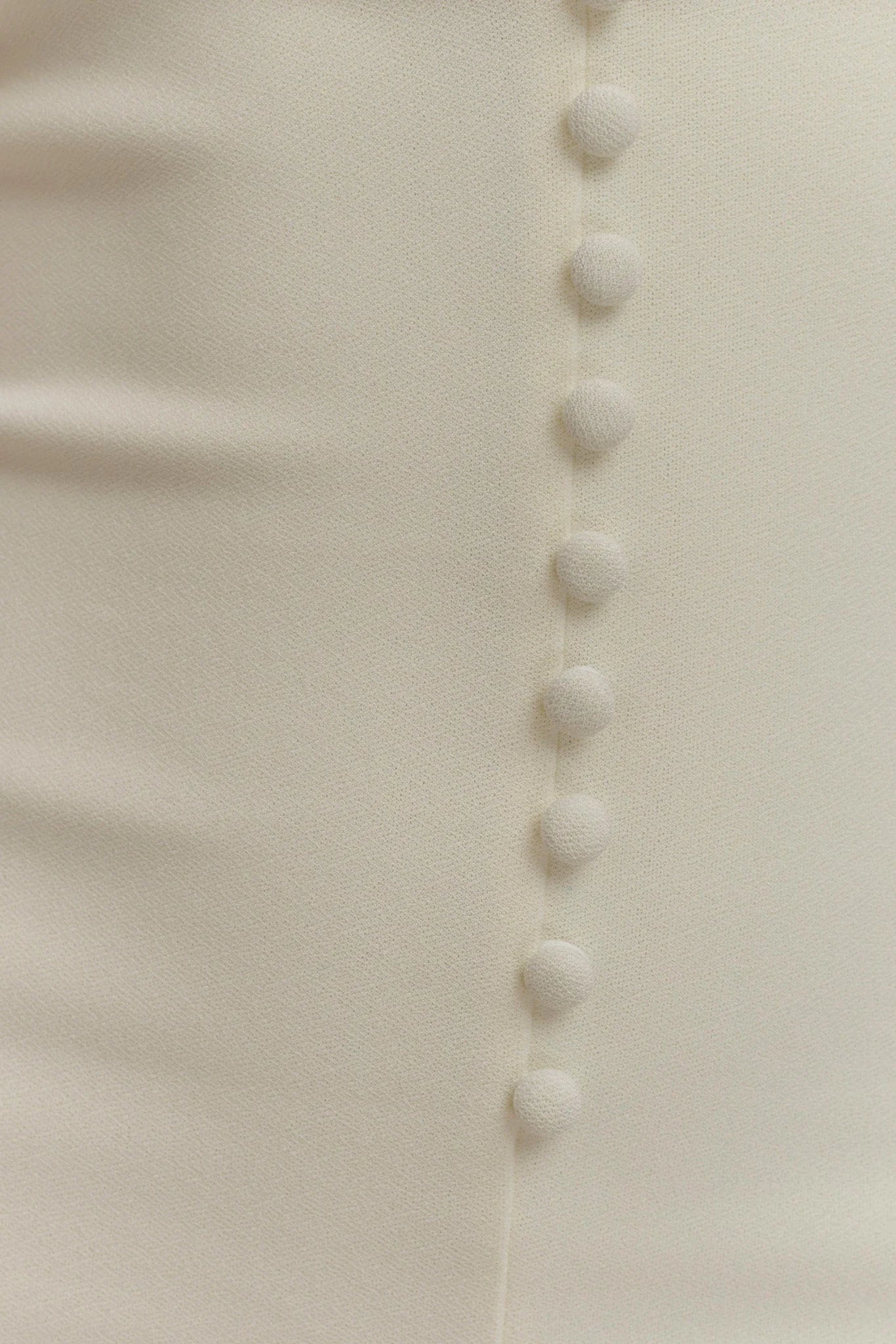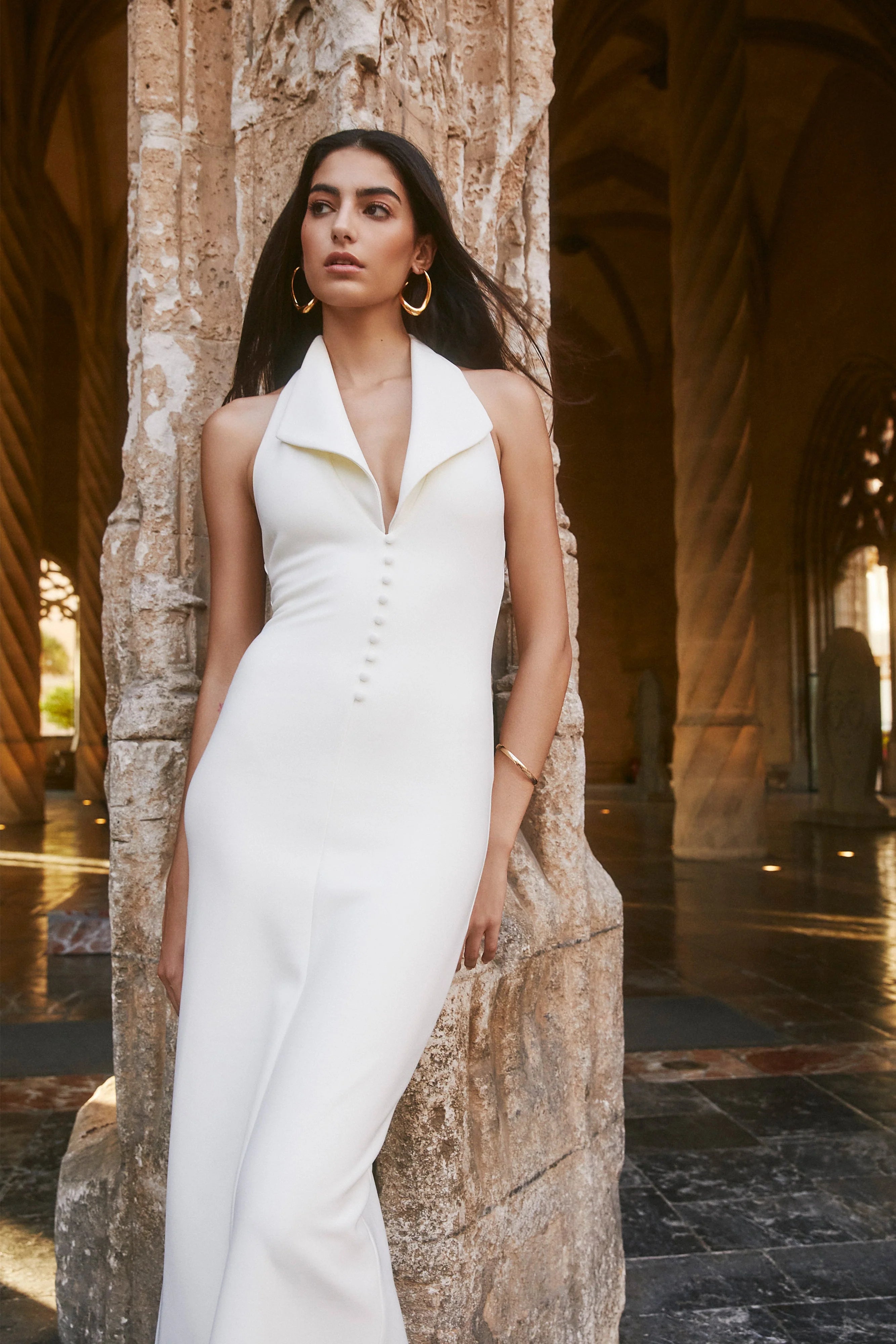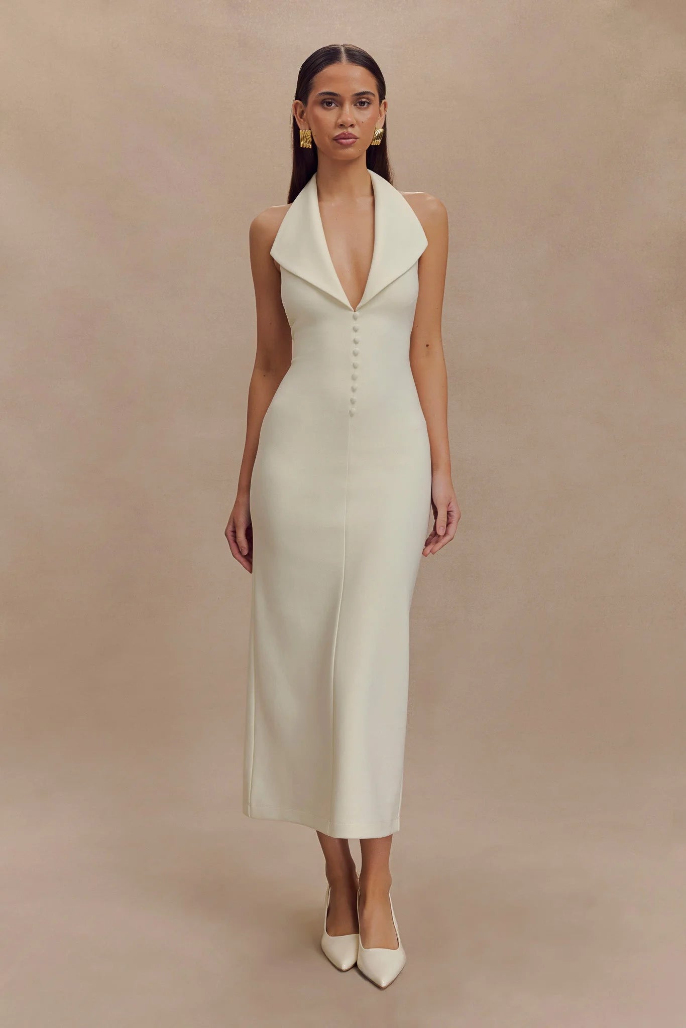 The ANNITA Crepe Halter Midi Dress exudes timeless elegance with its deep V neckline and halter design. Featuring a collared neckline and a button front (non-functional), this dress combines classic elements with a modern edge. The open back adds a touch of allure, while the fitted silhouette accentuates the figure gracefully. Crafted from luxurious crepe, the midi length offers a sophisticated and versatile option for any occasion, ensuring you make a stylish statement wherever you go.