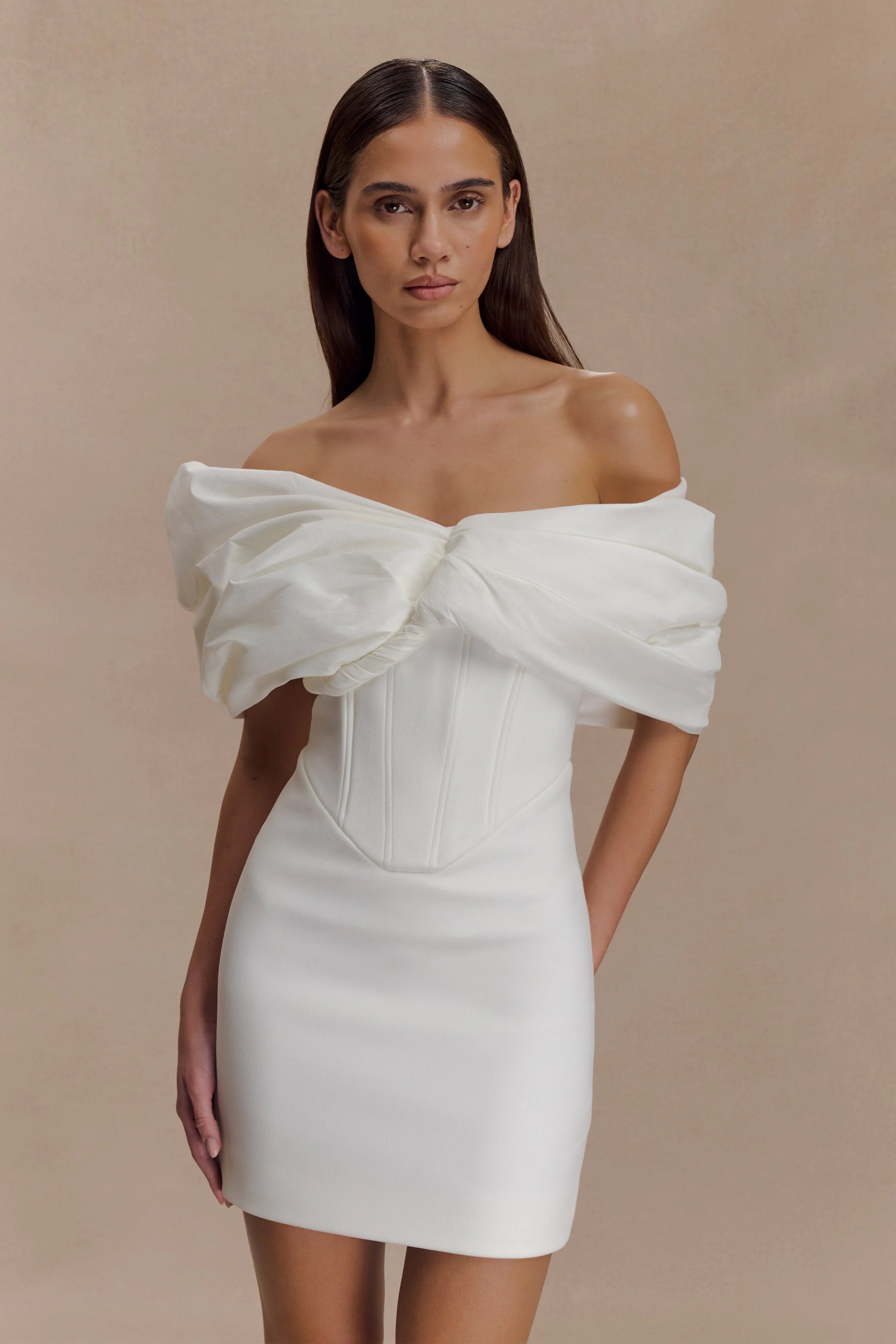 The APHRODITE Off Shoulder Crepe Mini Dress channels modern goddess energy with its sculptural silhouette and artful construction. Designed with an asymmetrical, off-the-shoulder neckline and voluminous bust panels gathered to perfection, this piece creates a striking, feminine shape. A structured boned waist panel cinches the torso, enhancing the fitted mini-length skirt for a statuesque finish. Crafted from a premium crepe fabrication and fully lined, this dress is your statement moment—elevated, empowered, unforgettable.