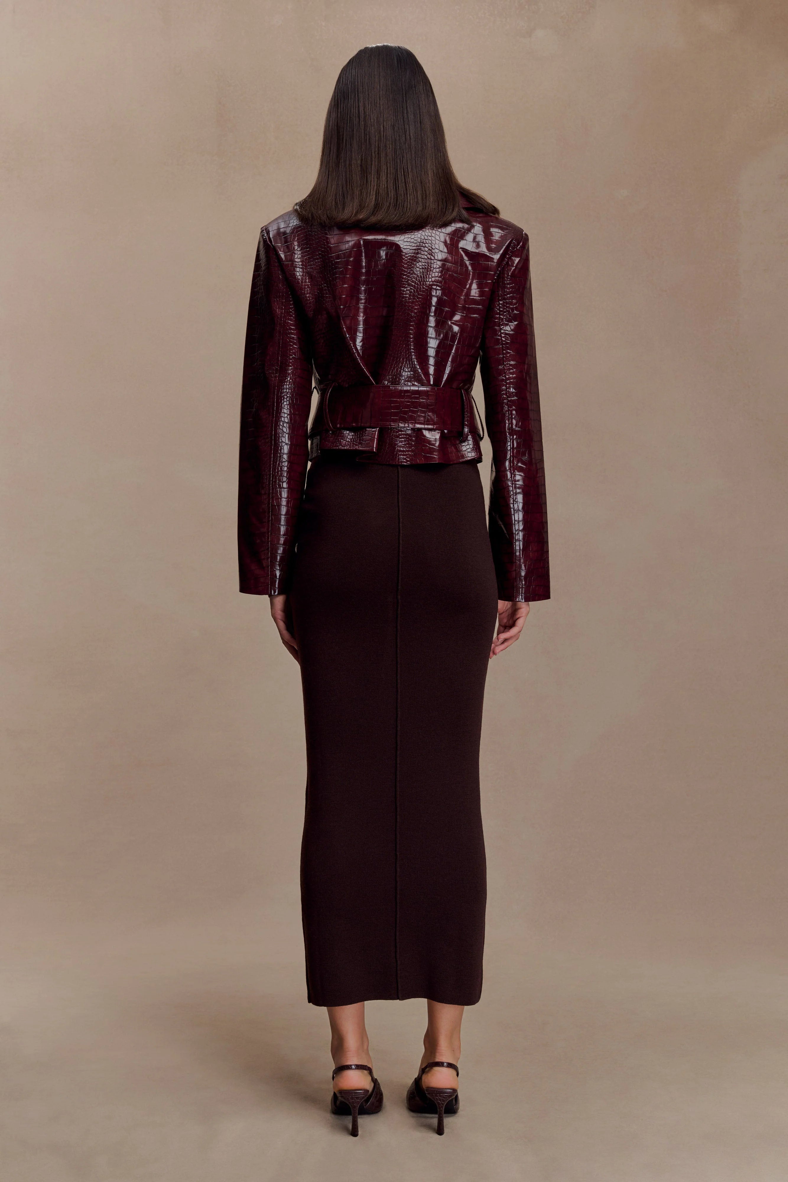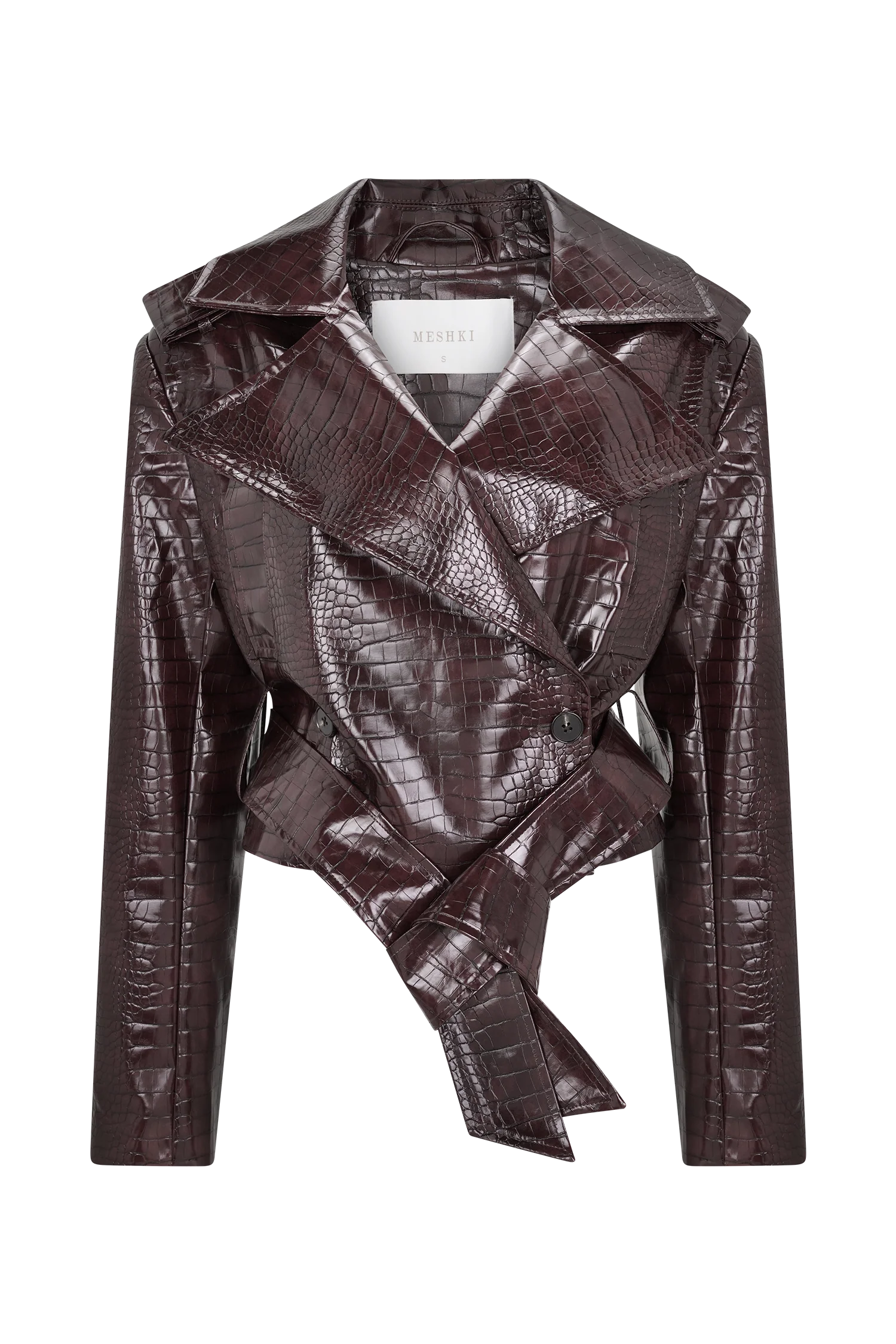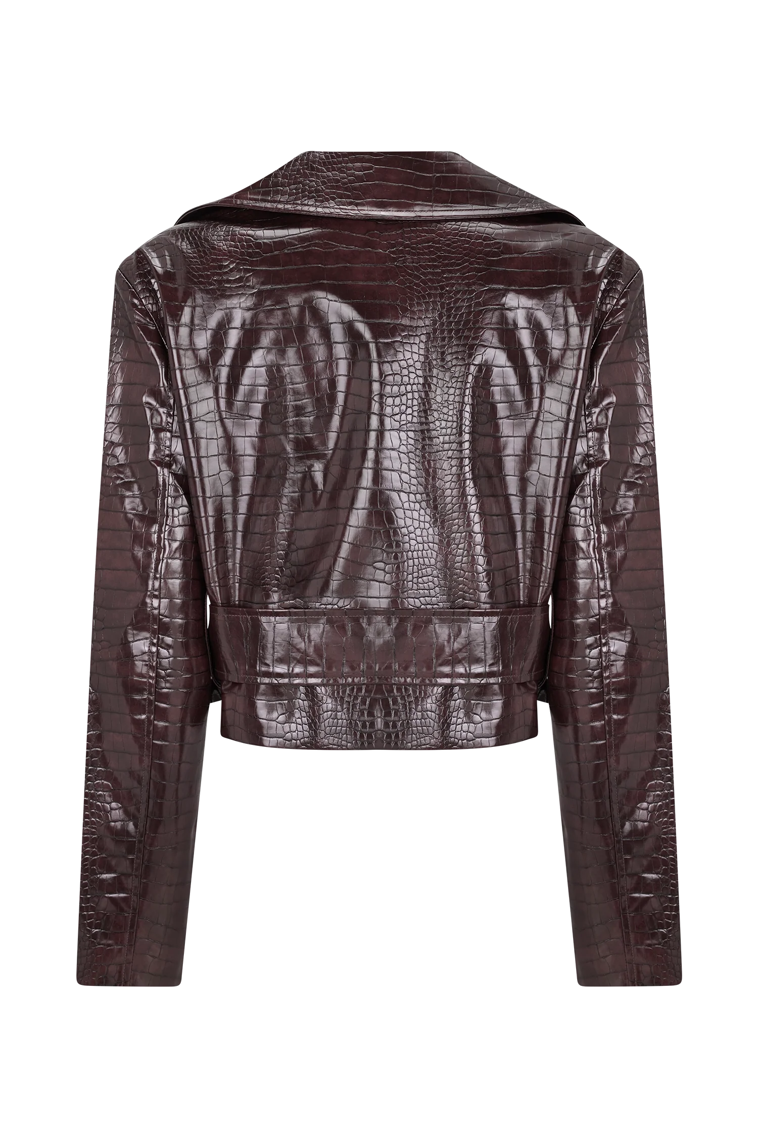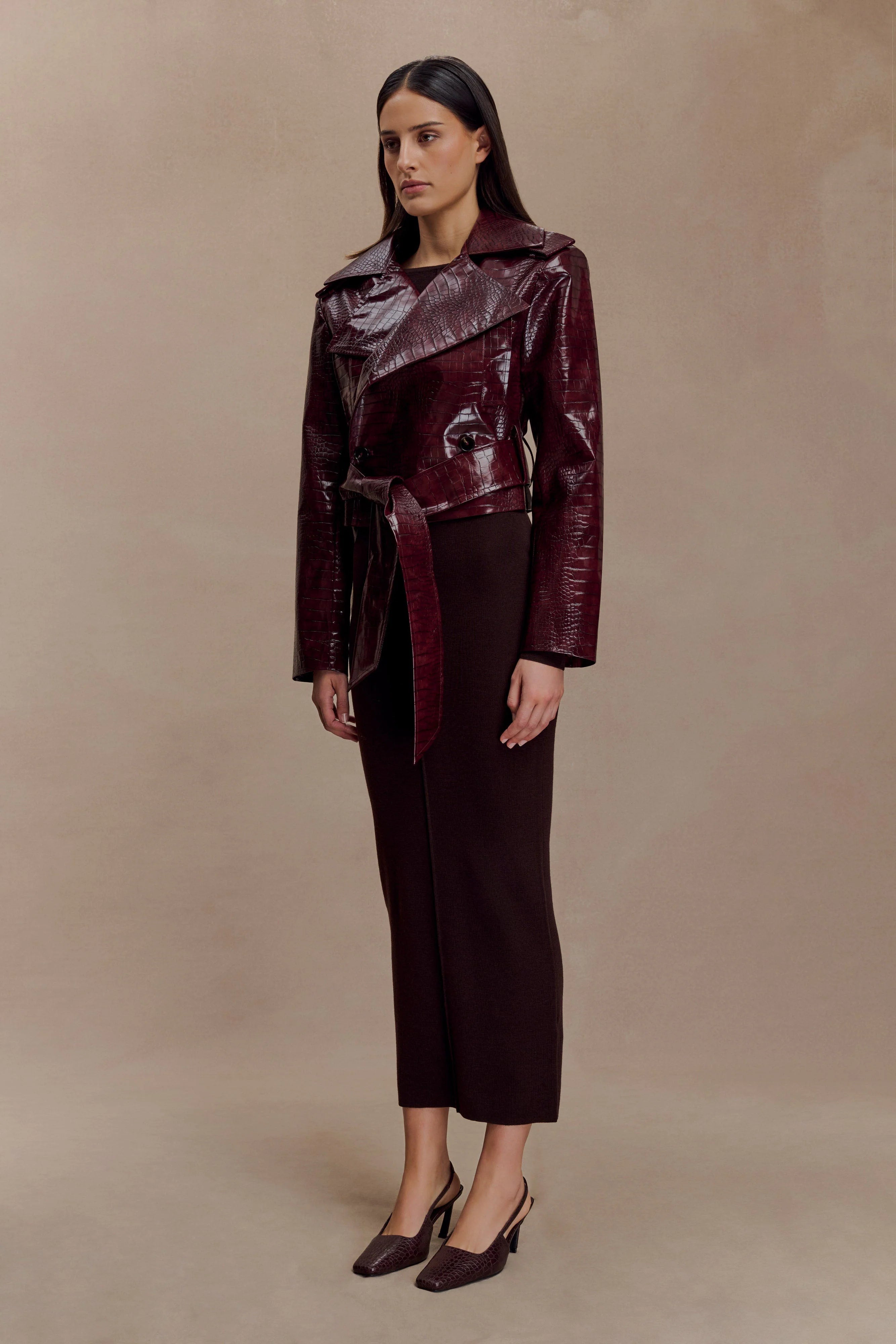 The ARCHIE Croc Faux Leather Cropped Jacket is a modern take on the classic trench, reimagined in a glossy croc-embossed faux leather. Featuring sharp tailoring details with shoulder epaulettes, a wide collar, and a double-breasted front—it’s cinched at the waist with a coordinating belt for a defined silhouette. Side pockets add functionality, while belt loops and full lining complete the polished finish. Cropped in length, this jacket is designed to balance edge with elegance, making it a versatile layering piece for both day and night.