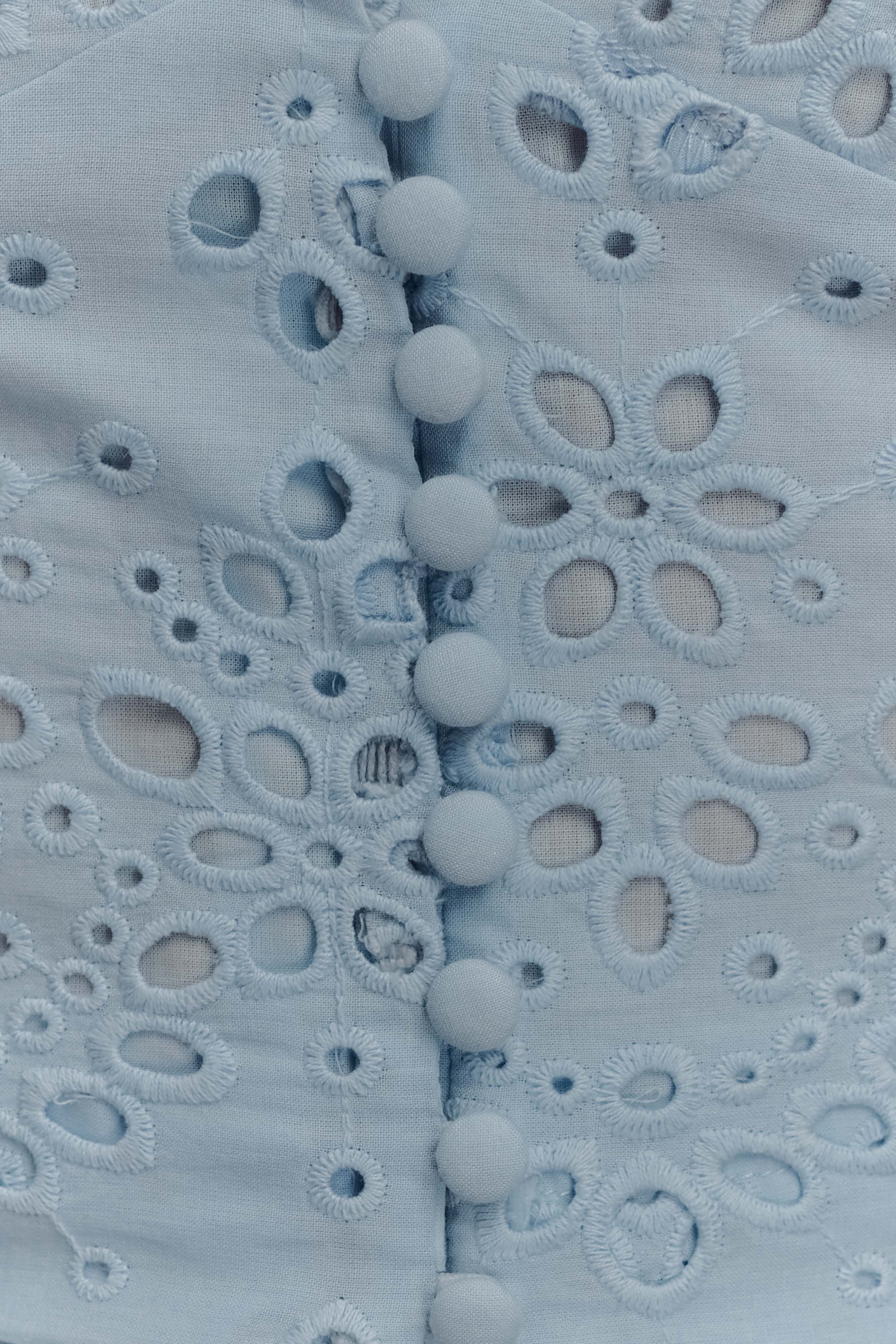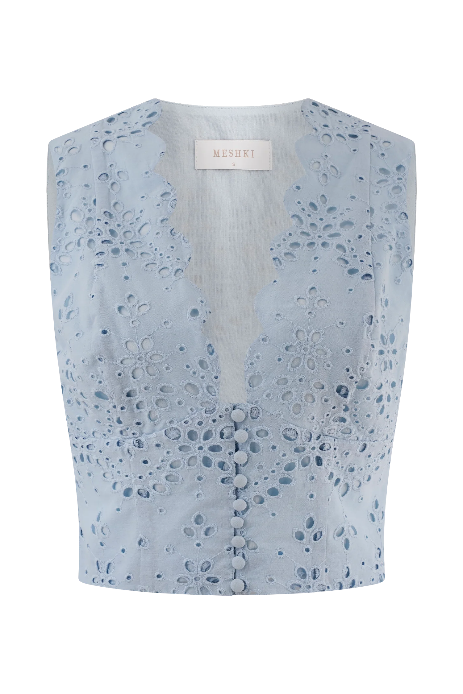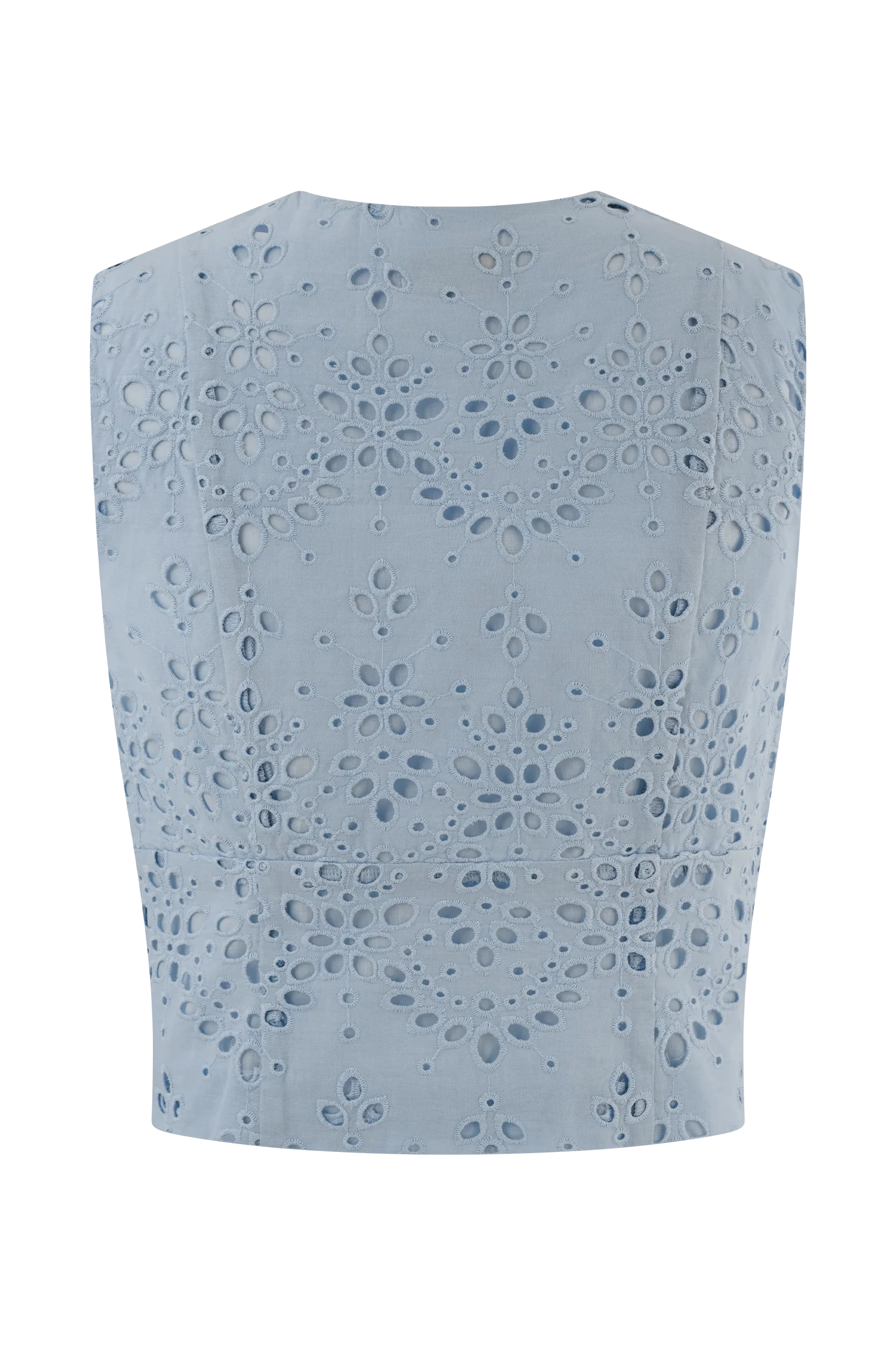 The ARLA Sleeveless Broderie Top is a fresh take on effortless femininity. Designed with a delicate V-neckline featuring a scalloped edge, this cropped silhouette flatters with an underbust seam and front and back shaping seams for a contoured fit. The button-front opening adds a classic touch, while the intricate broderie fabrication enhances its romantic appeal. Fully lined for comfort, this top pairs beautifully with the for a coordinated look that exudes elegance and modern charm.