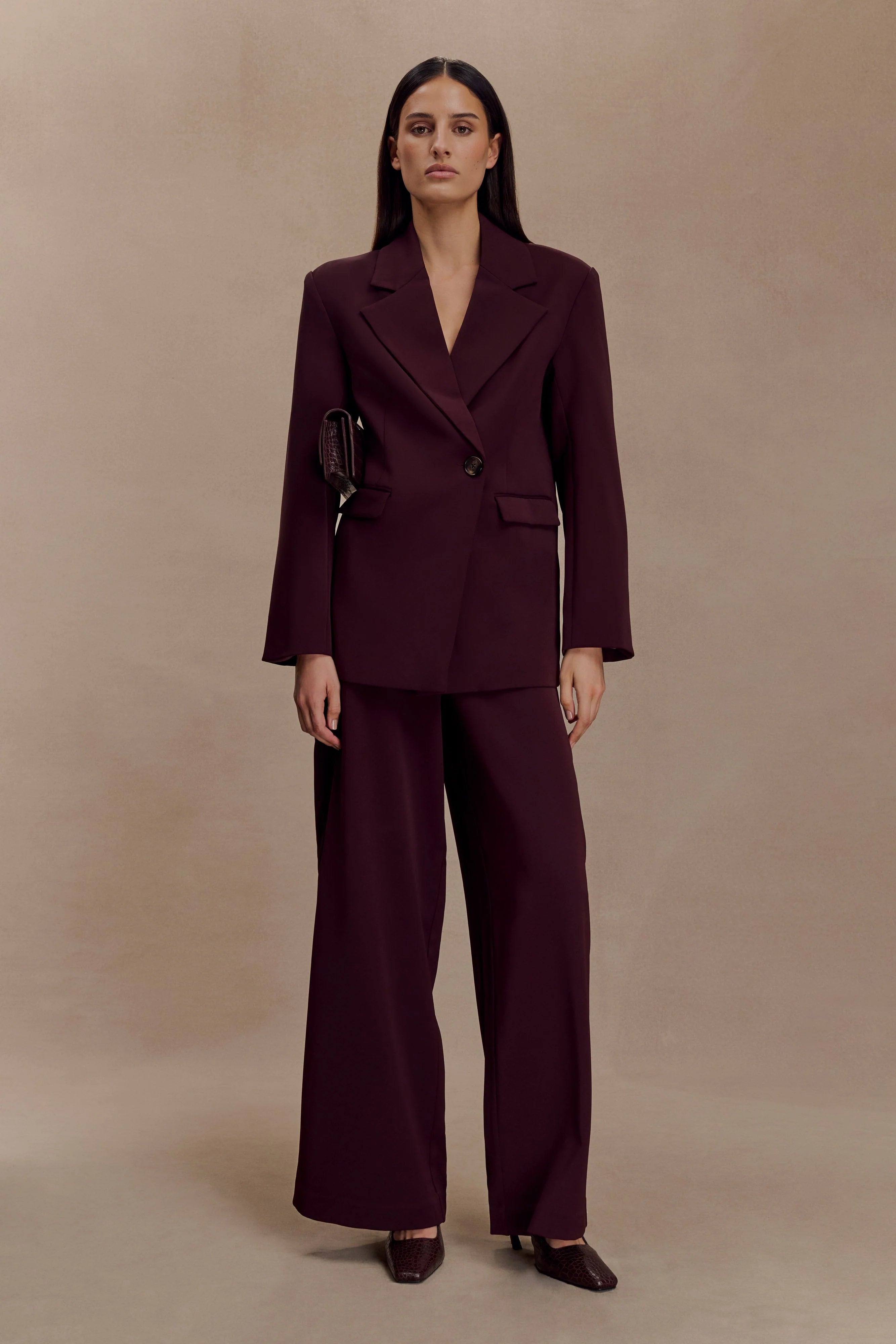 The ARLO Wide Leg Suiting Trouser is cut for a sharp yet fluid silhouette. Designed to sit at the natural waist, it features wide legs that elongate the frame while maintaining a relaxed drape. Large belt loops and angled seams add a modern suiting detail, with no traditional waistband for a clean, streamlined finish. Fully lined and completed with a front fly zip closure, these trousers are a versatile foundation piece—perfect paired with blazers, shirting, or soft knits for elevated everyday styling.
