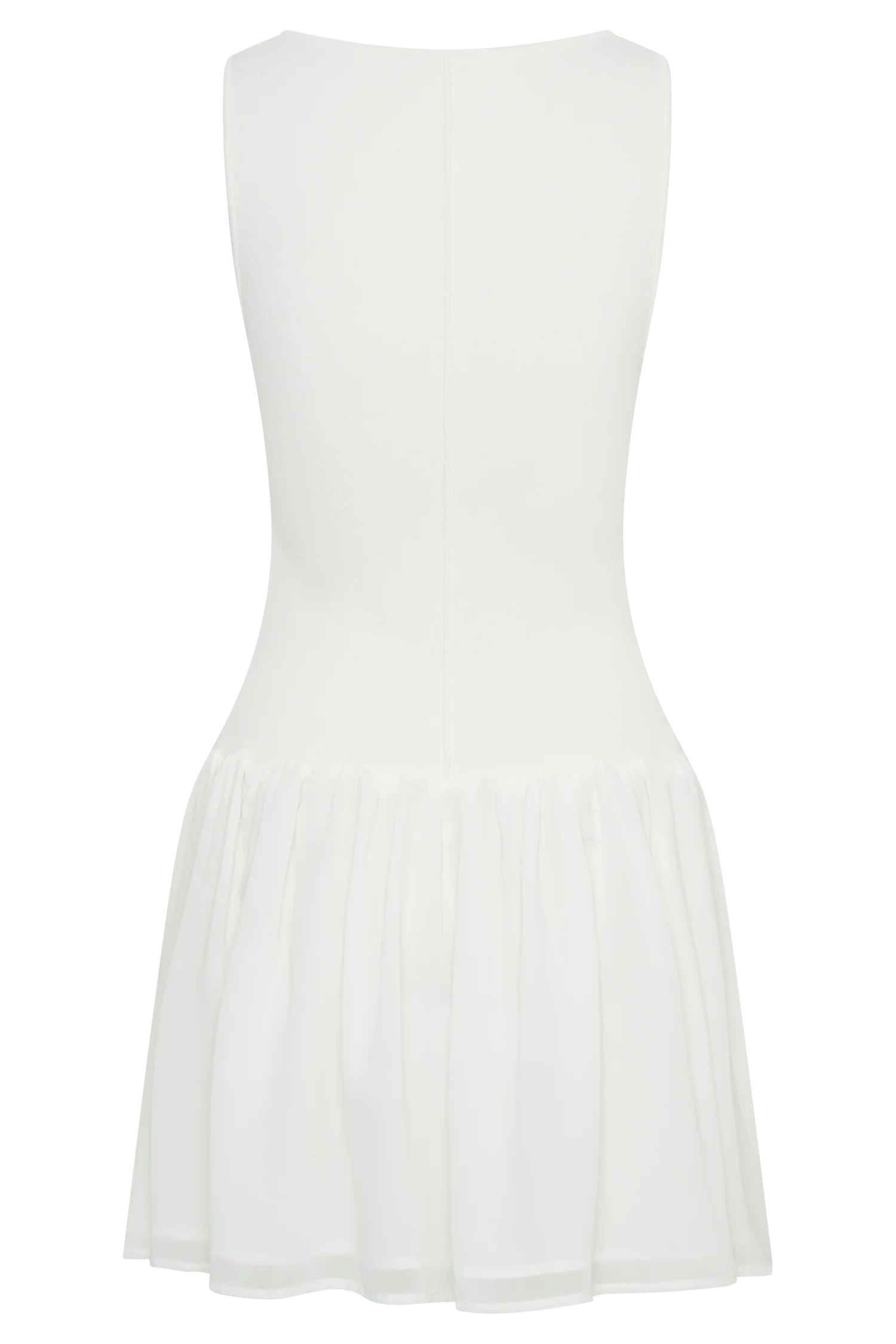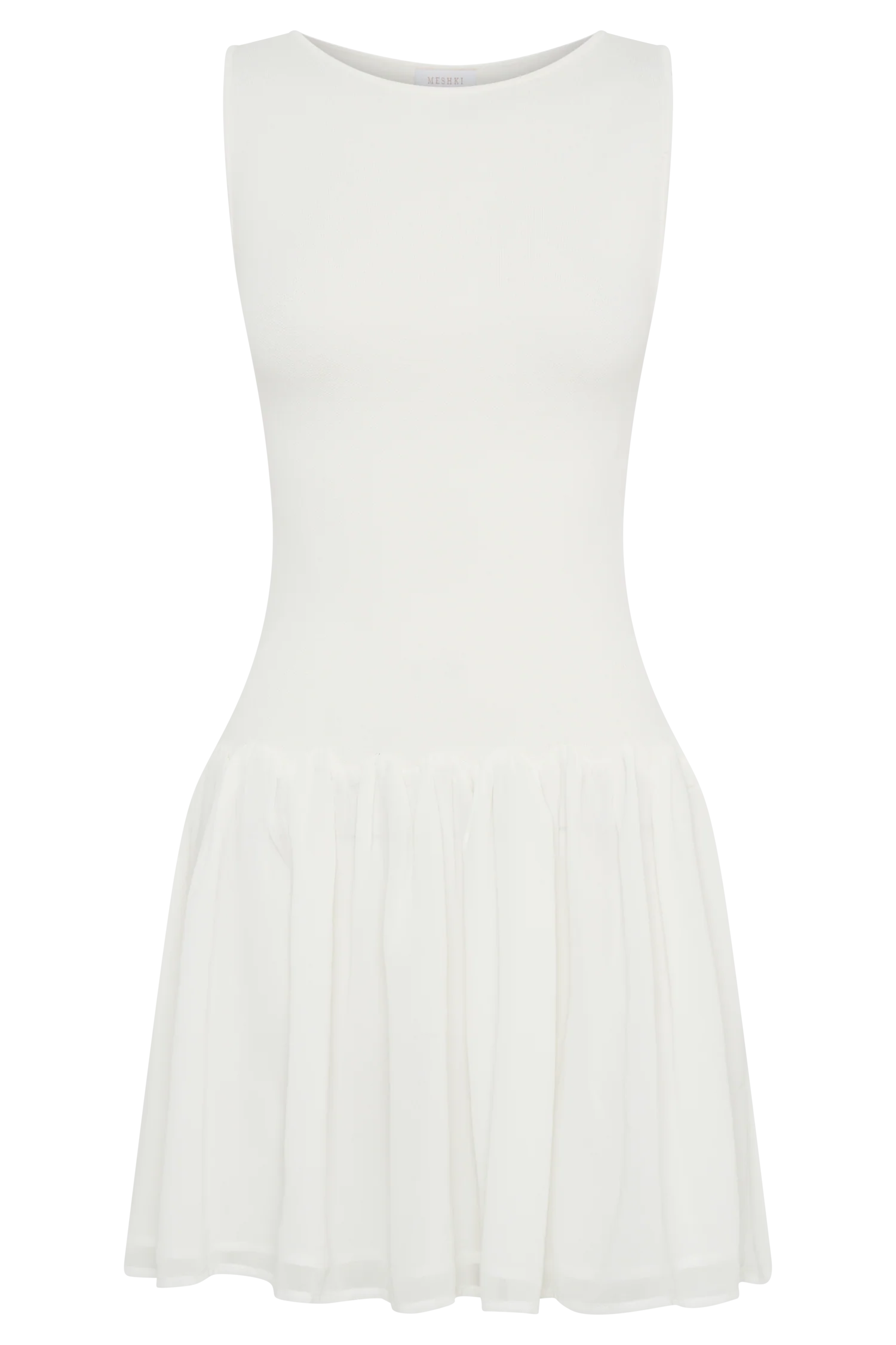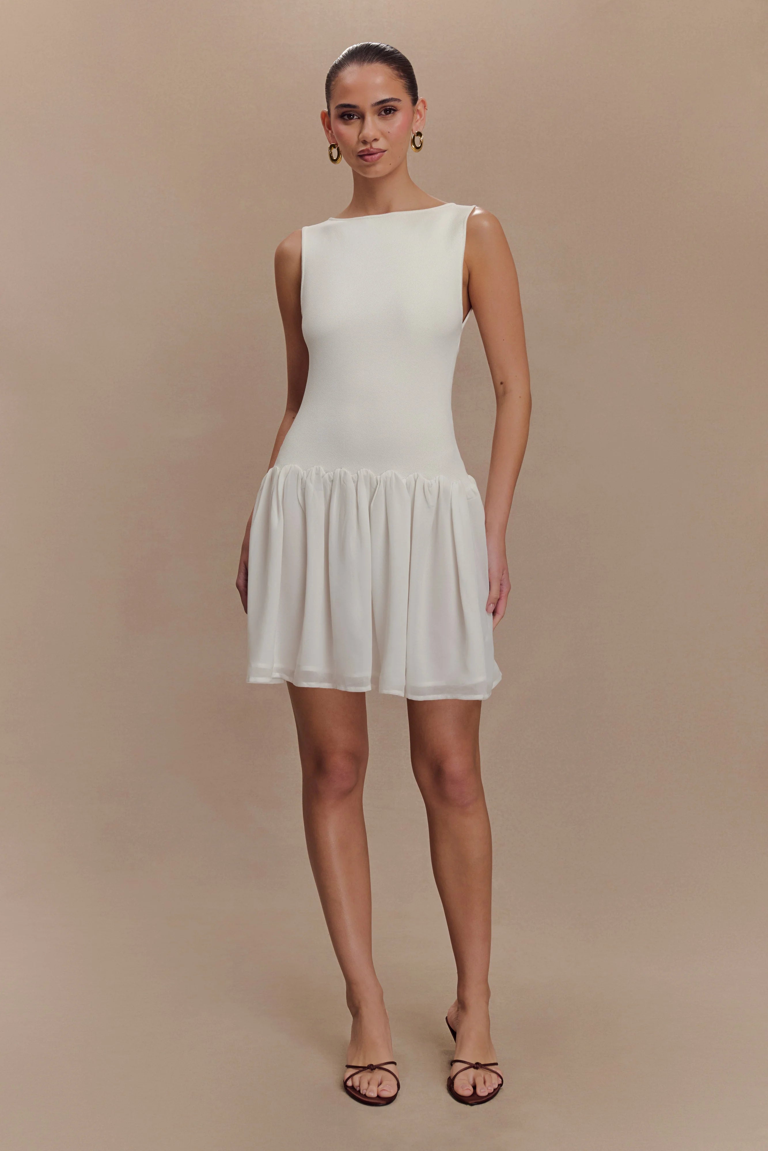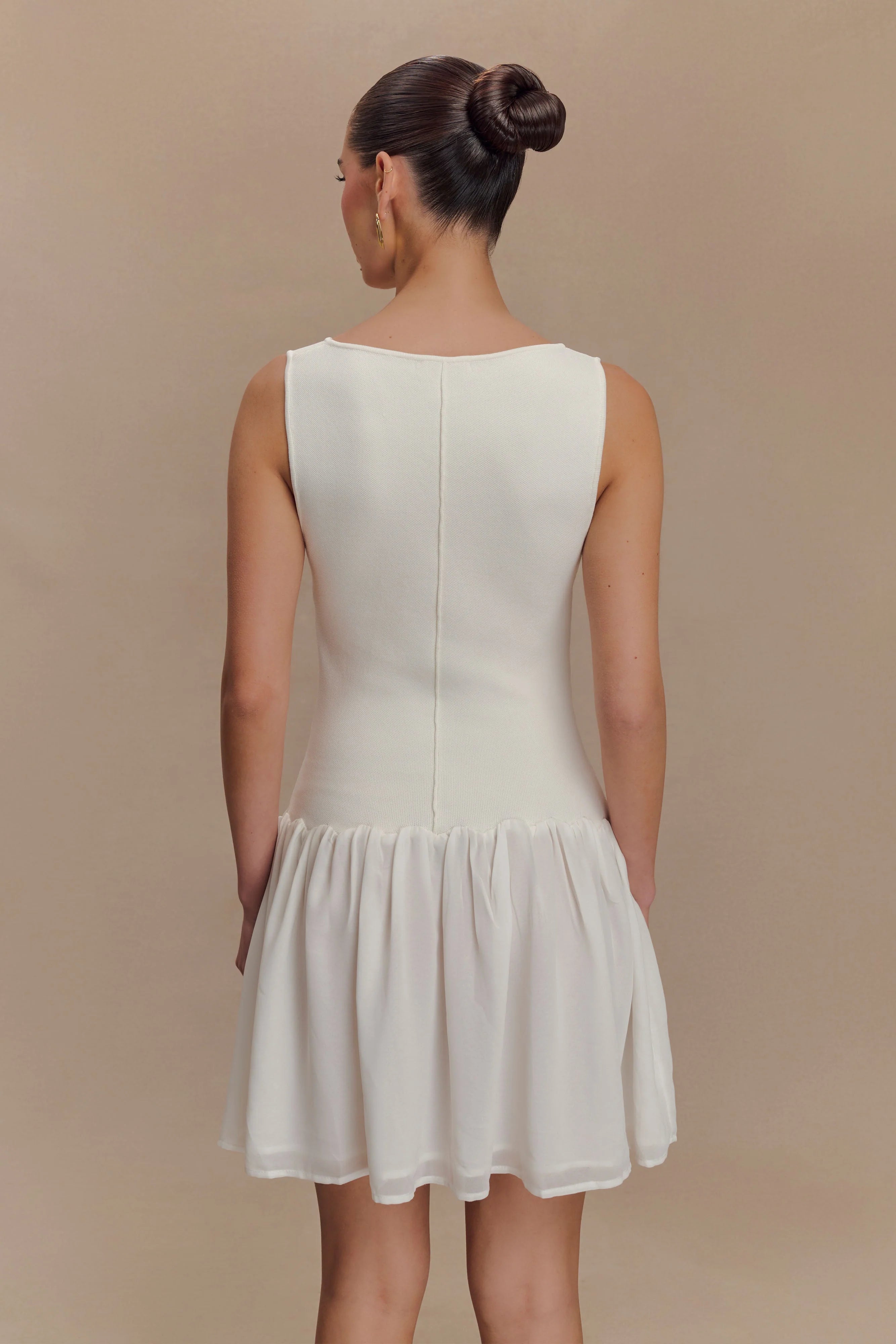 The ASHLEIGH Knit and Chiffon Mini Dress is a chic blend of textures and modern design. Featuring a fitted, knitted bodice that hugs your shape in a bodycon fit, this dress is accented by a playful zigzag waist detail that transitions seamlessly into a flowy chiffon skirt. The mini length and sleeveless cut give it a fresh, versatile look, perfect for day-to-night styling. With its unique contrast of knit and chiffon, this dress combines elegance and edge for a look that's both sophisticated and fun.