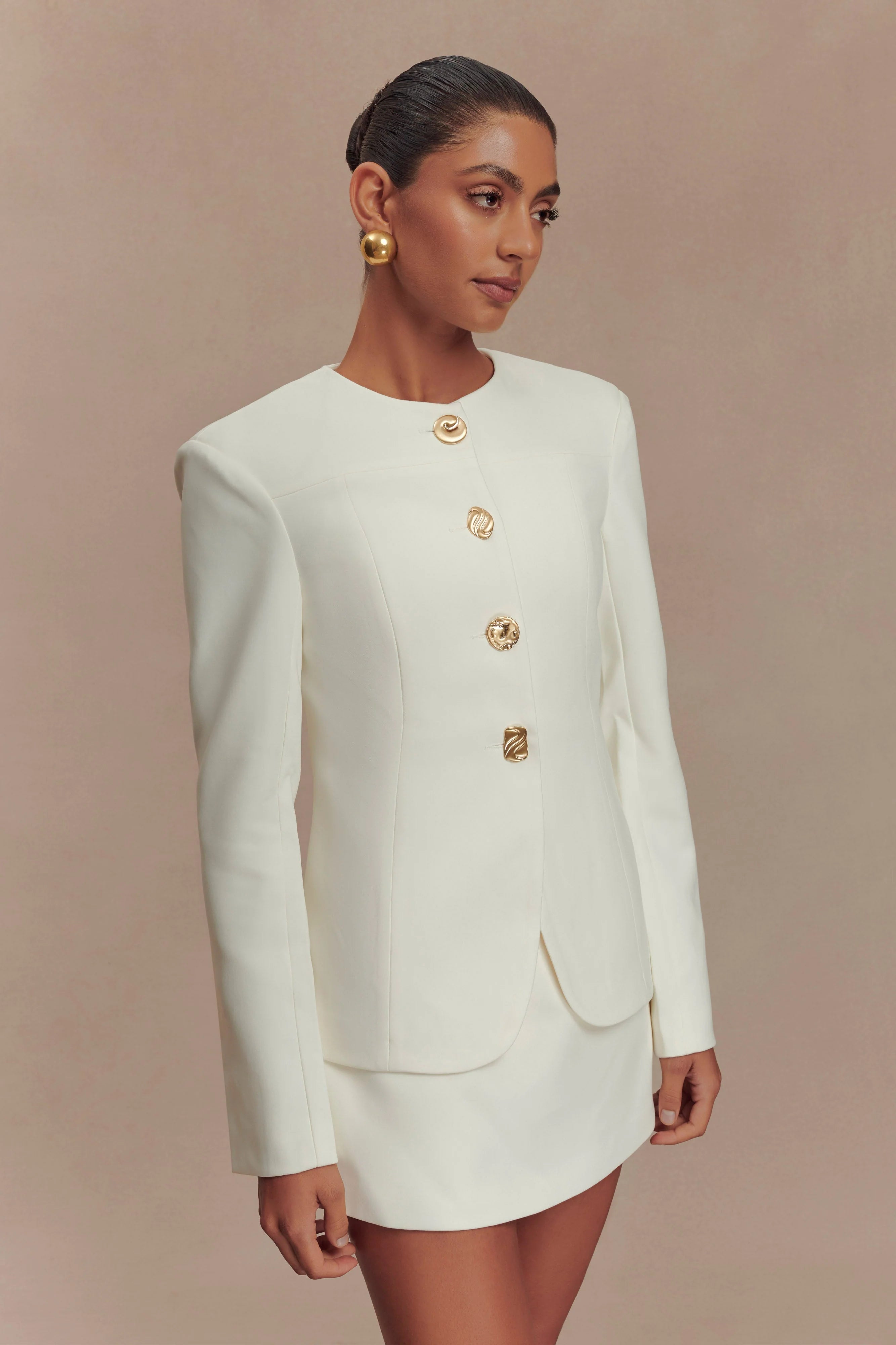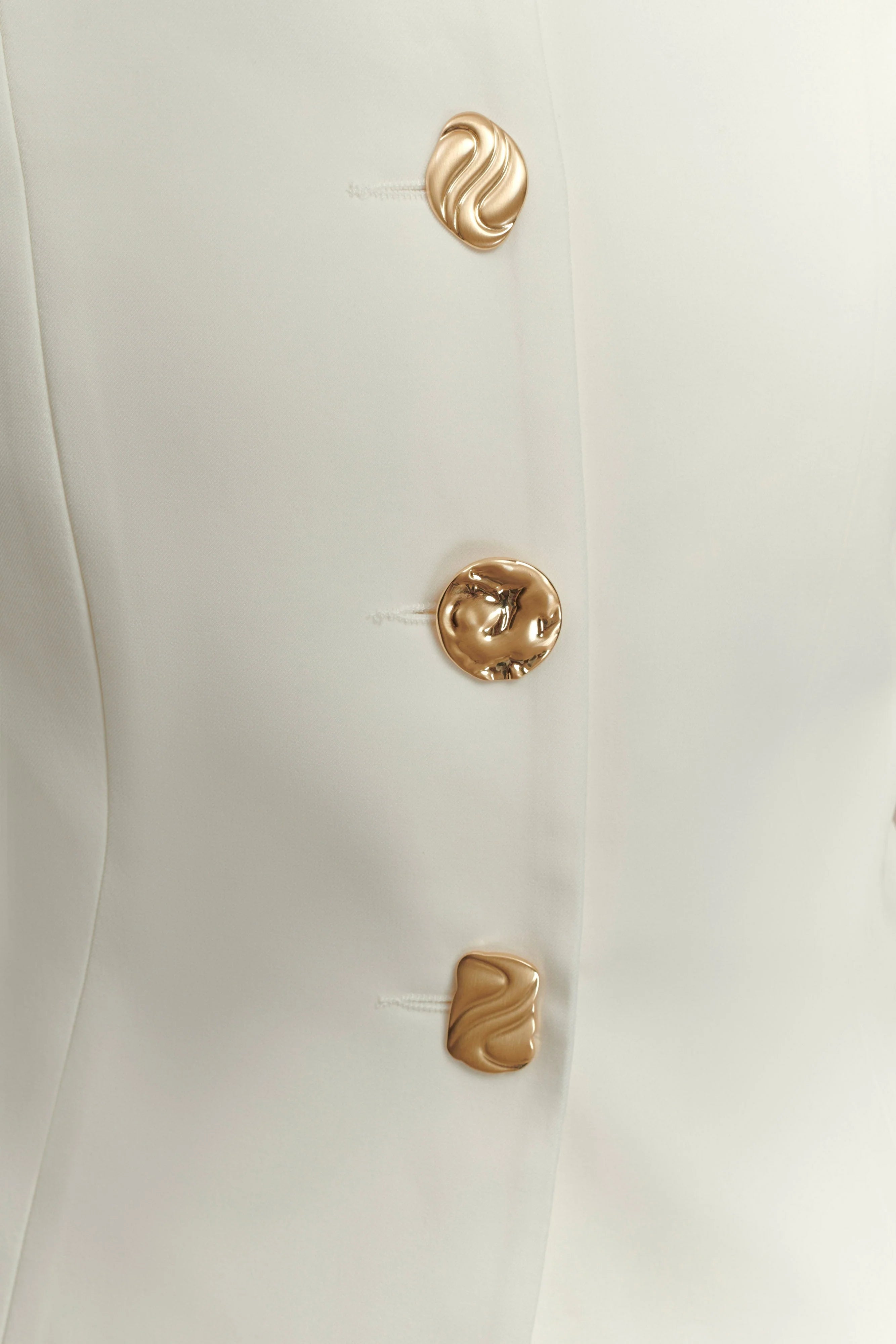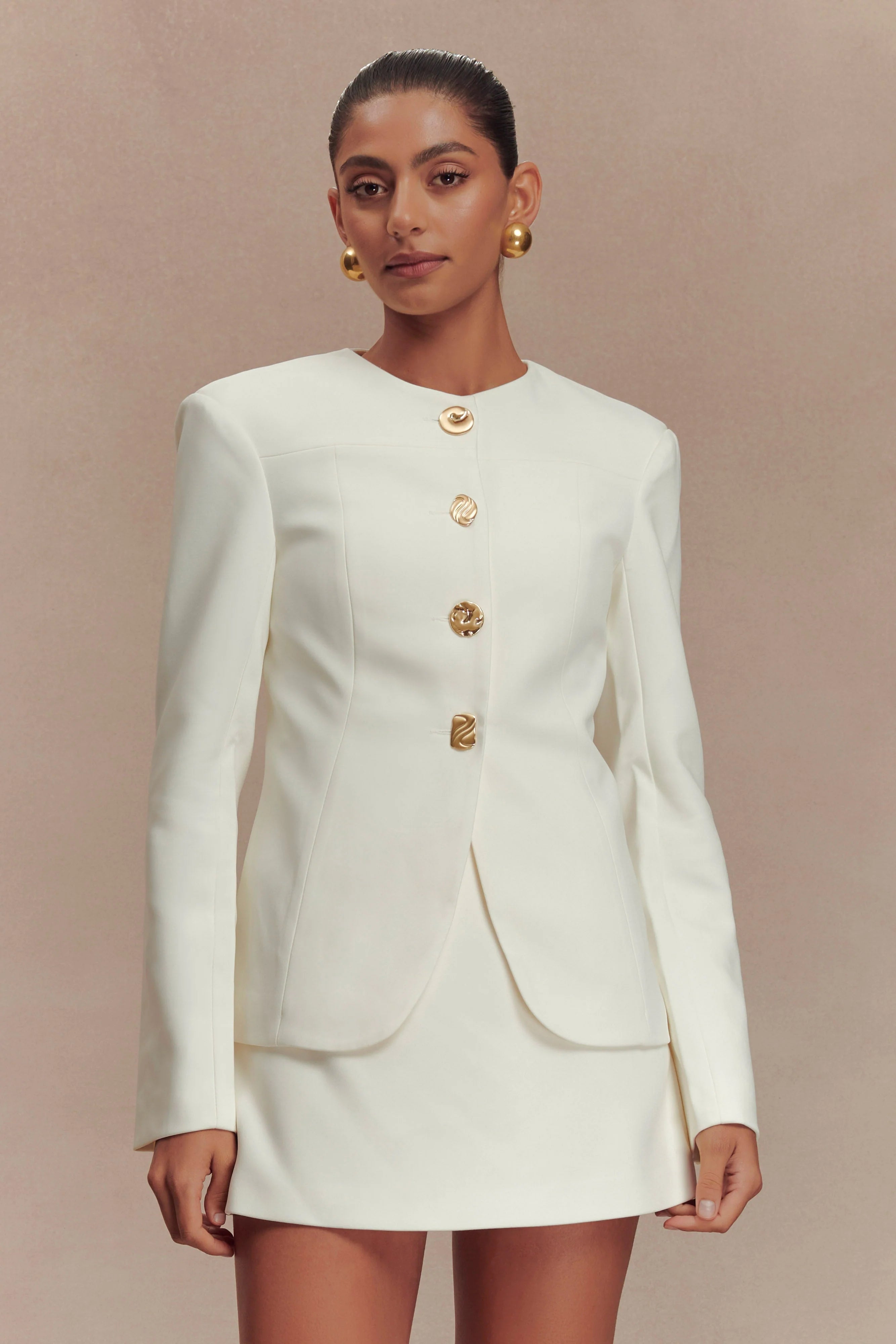 Make a statement with the ASIA Mixed Button Blazer, a refined blend of modern sophistication and timeless tailoring. Featuring a unique round neckline and structured shoulder pads, this blazer creates a commanding silhouette. The button-front closure is adorned with custom decorative buttons, adding a touch of individuality to this longline design. Fully lined for a luxurious feel, it’s perfect for layering in style. Pair it with the for a polished and coordinated ensemble that seamlessly transitions from the office to after-hours.
