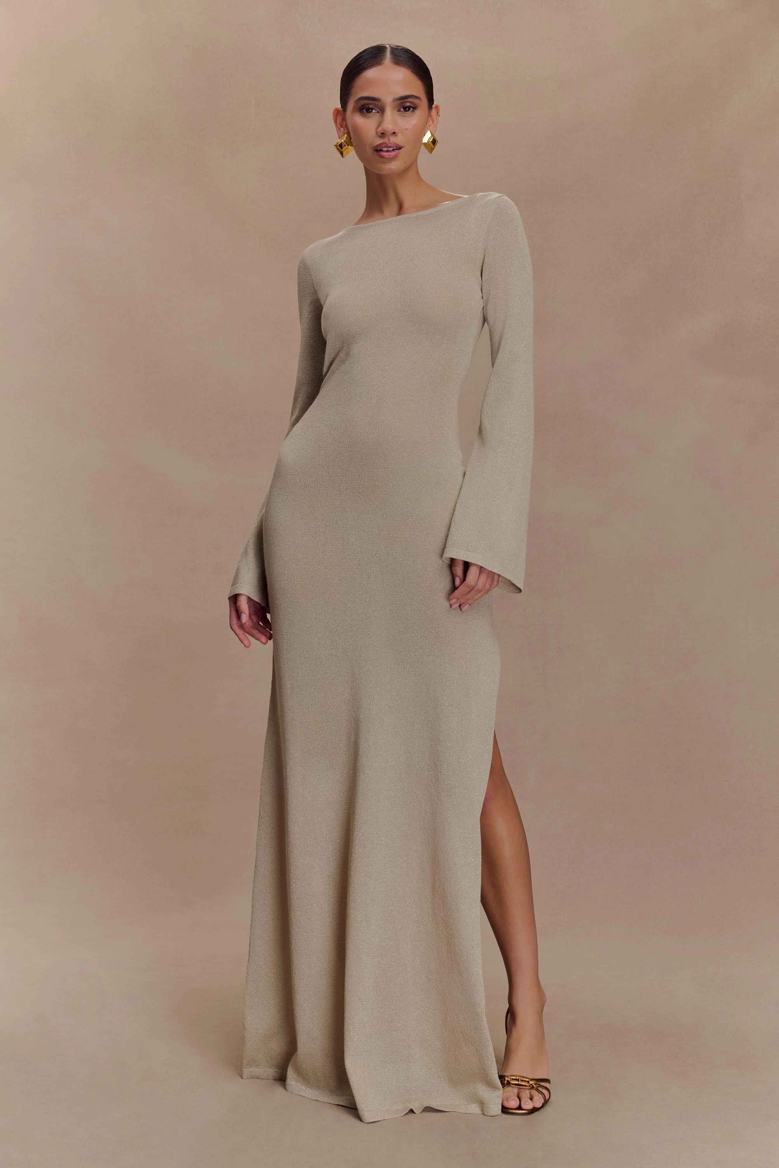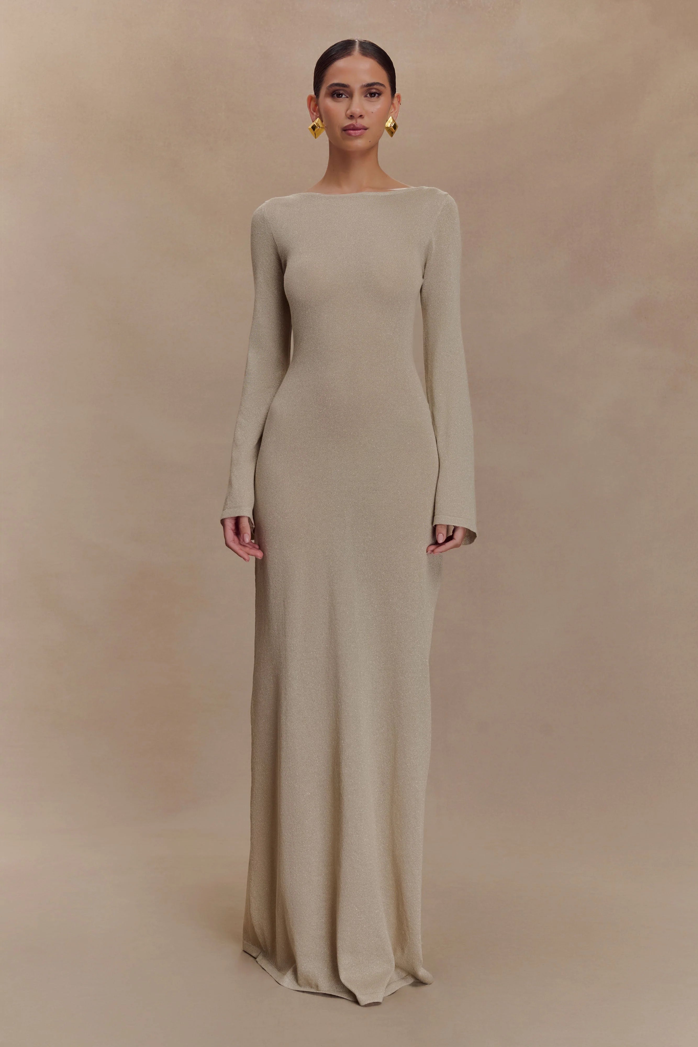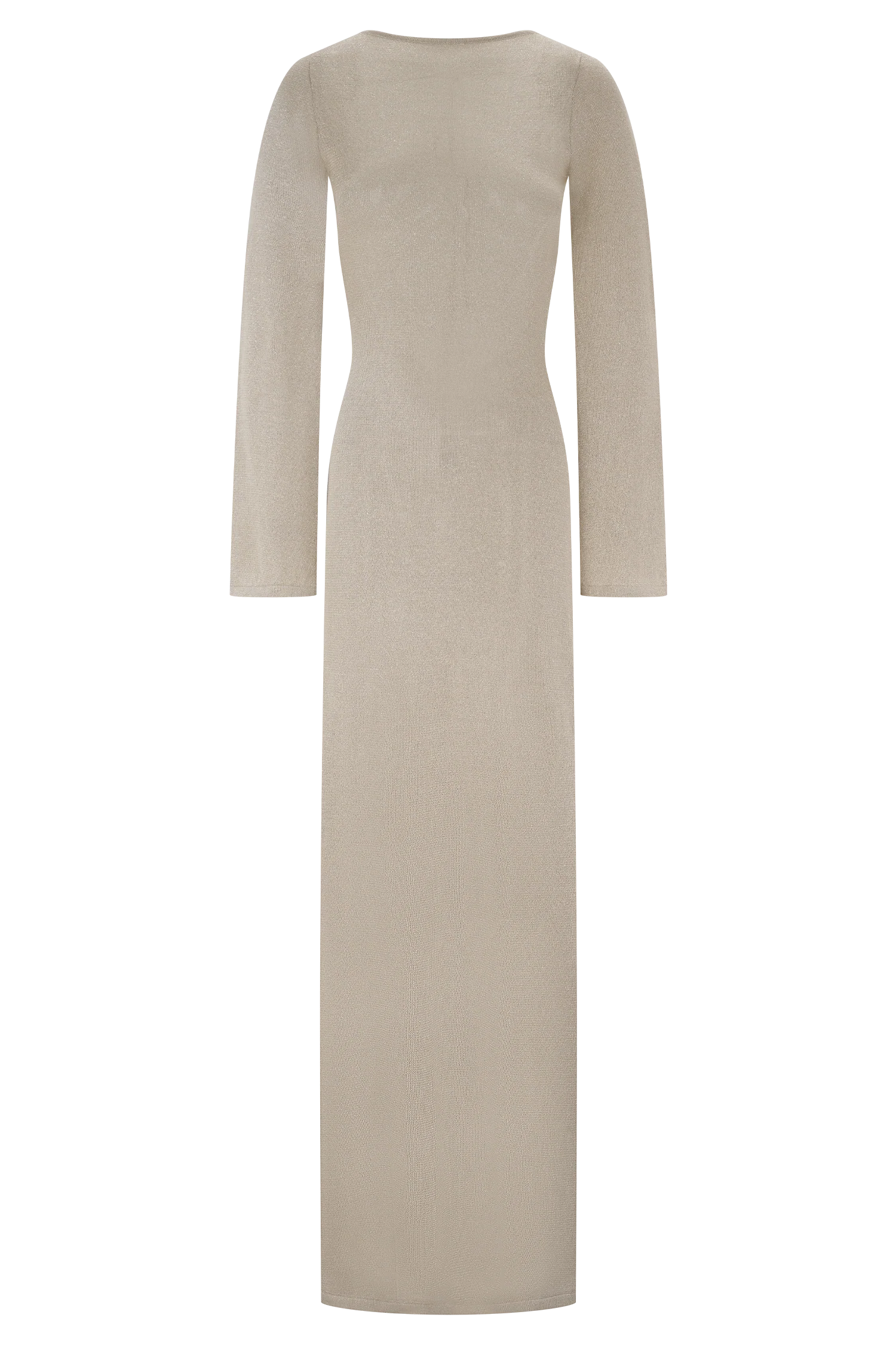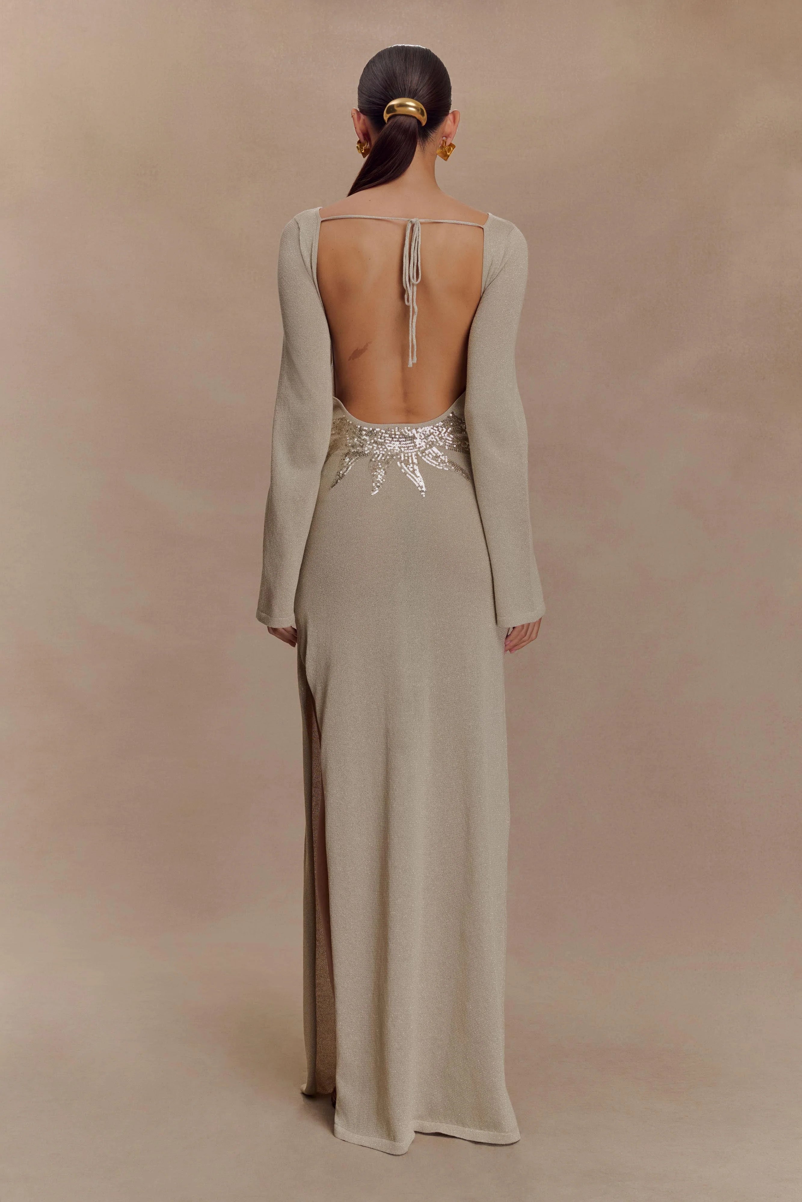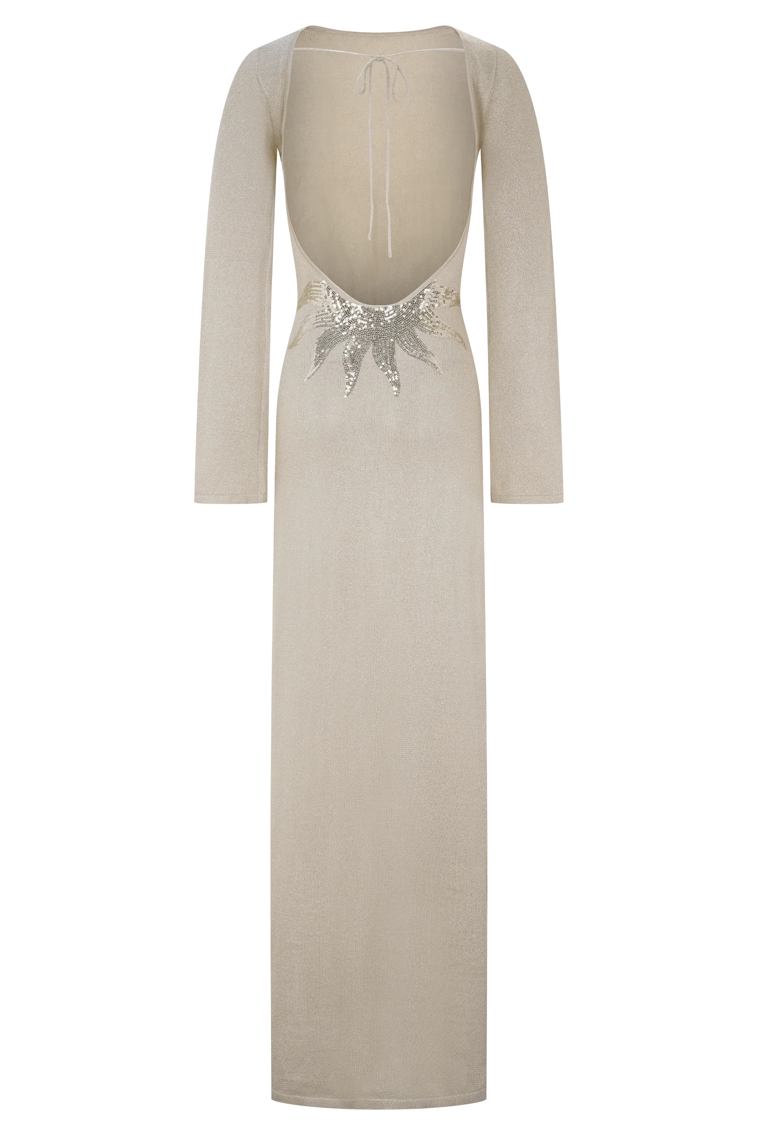 The ATTICUS Knit Maxi Dress With Sequin is your after-sunset standout, blending relaxed drape with eye-catching detail. Crafted in a soft, unlined knit, this dress features a cowl front neckline, open back with an adjustable tie, and long sleeves for a sleek silhouette. A subtle side leg split adds movement, while a statement sequin sun detail at the back creates a striking finish as you walk away. Designed to shimmer under moonlight, this dress is the perfect piece for seaside dinners, rooftop parties, or golden hour celebrations.