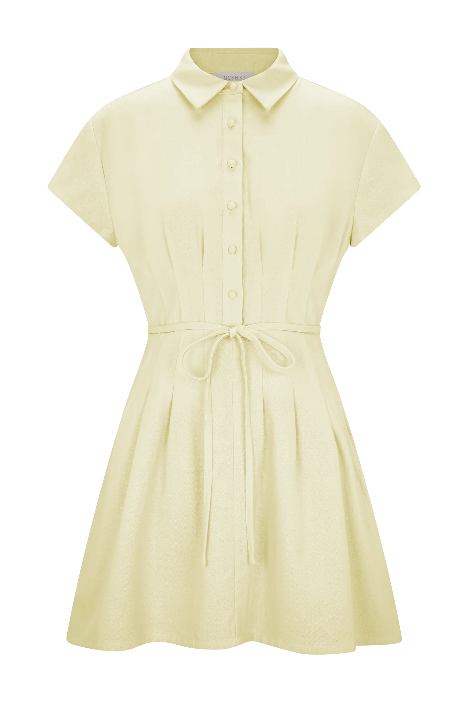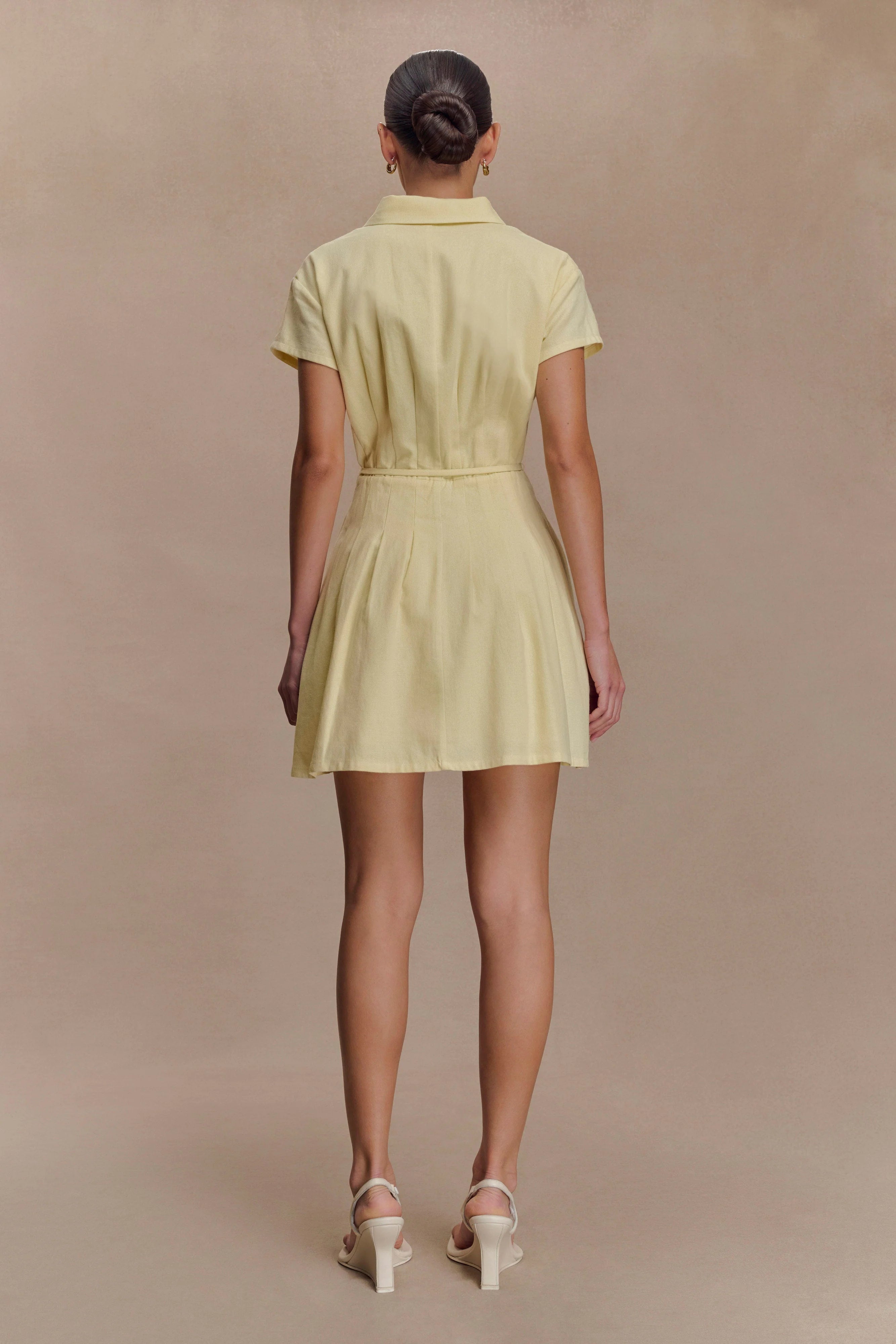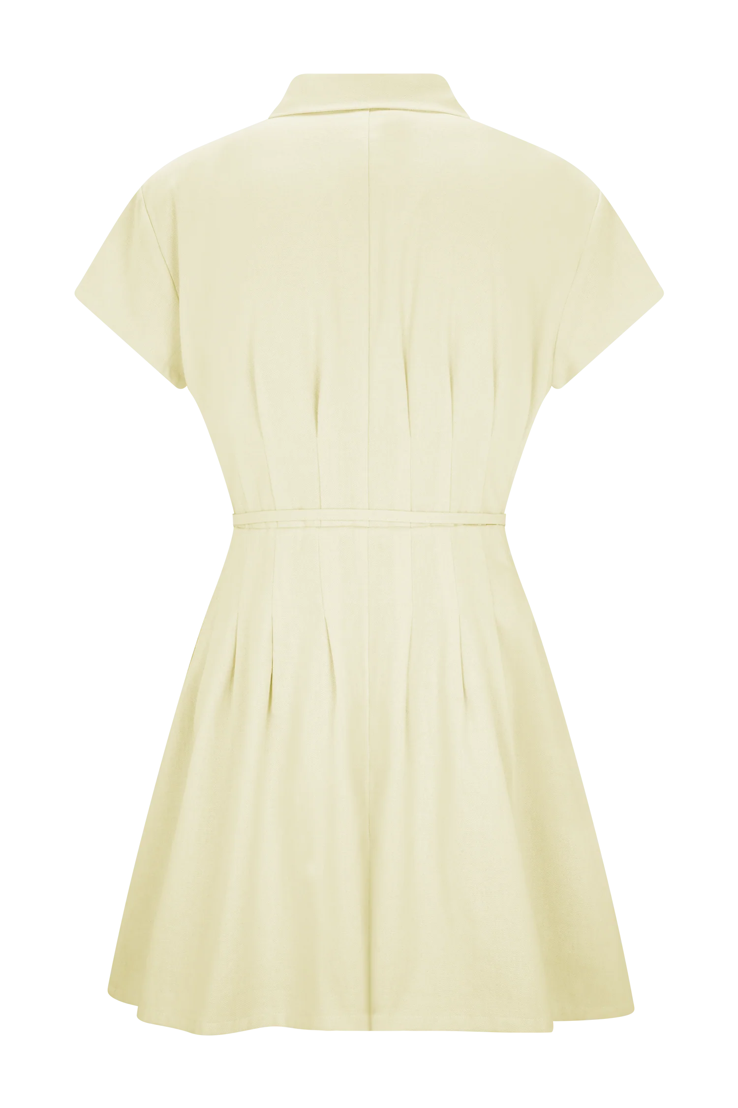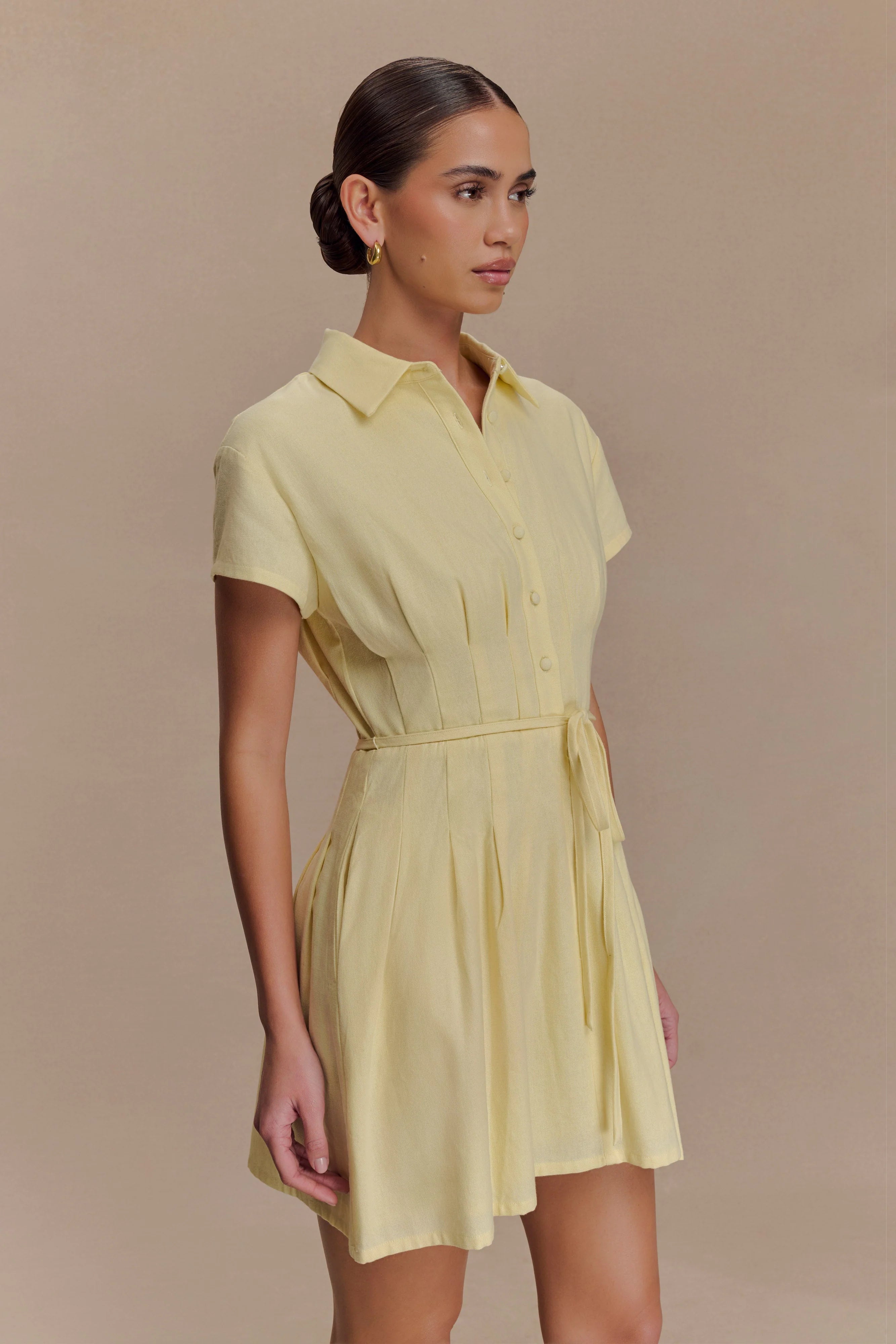 The AYSHA Buttoned Linen Mini Dress blends crisp structure with warm-weather ease. Featuring a collared neckline and short sleeves, the button-front bodice meets a fitted waist with soft tucks for subtle shape. A-line in silhouette and finished with a waist tie and belt loops for added polish, this lined mini dress is your go-to for city strolls, garden brunches, and beyond.