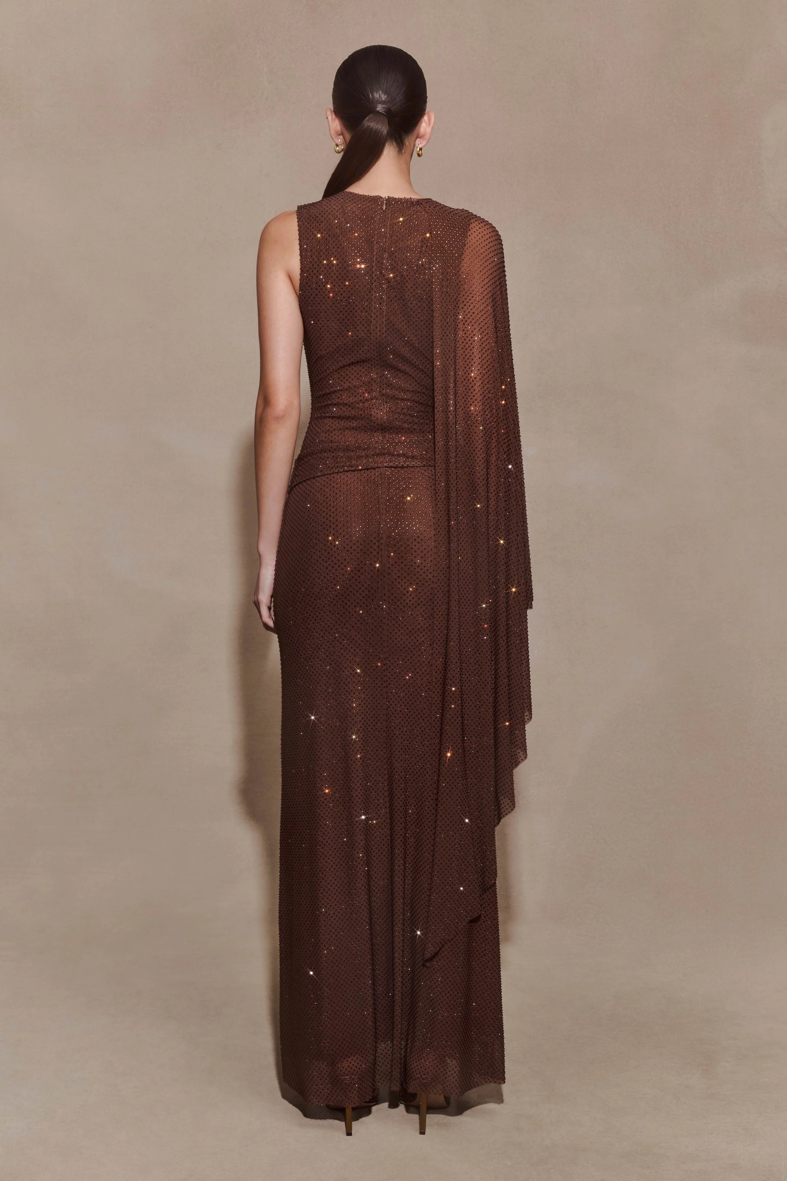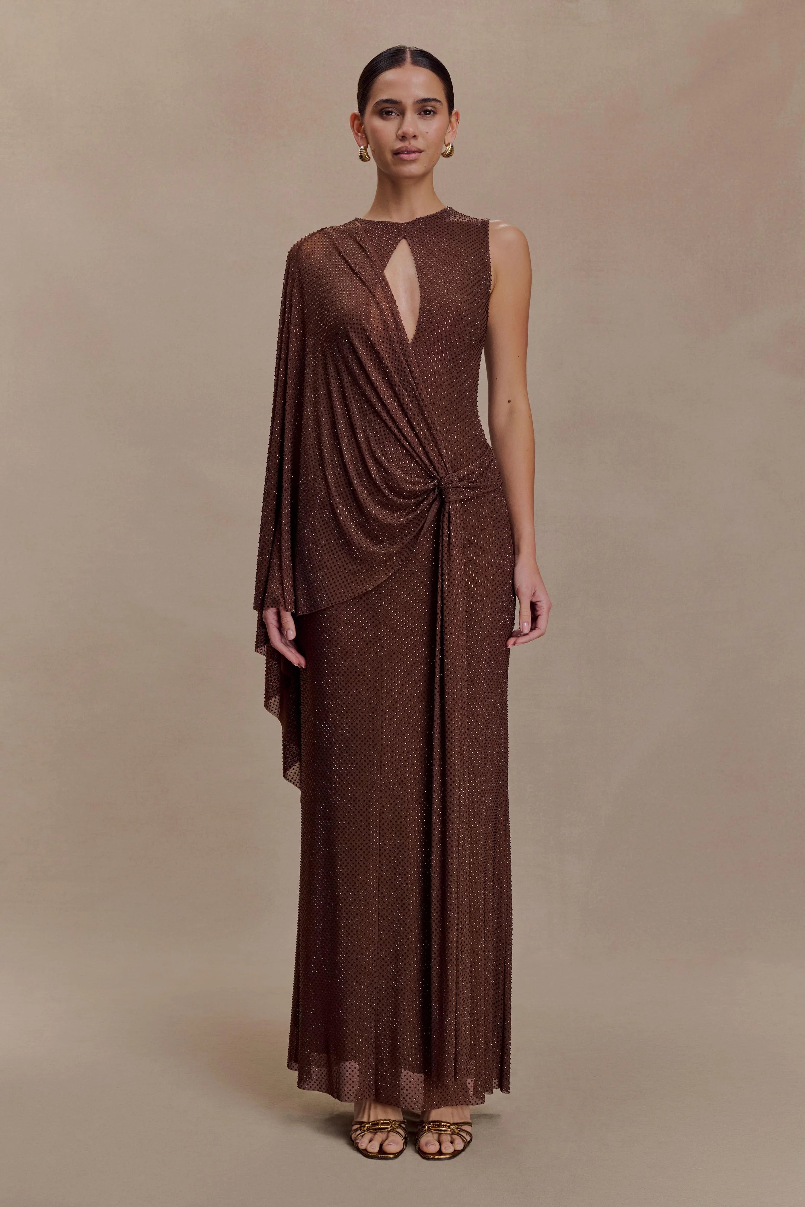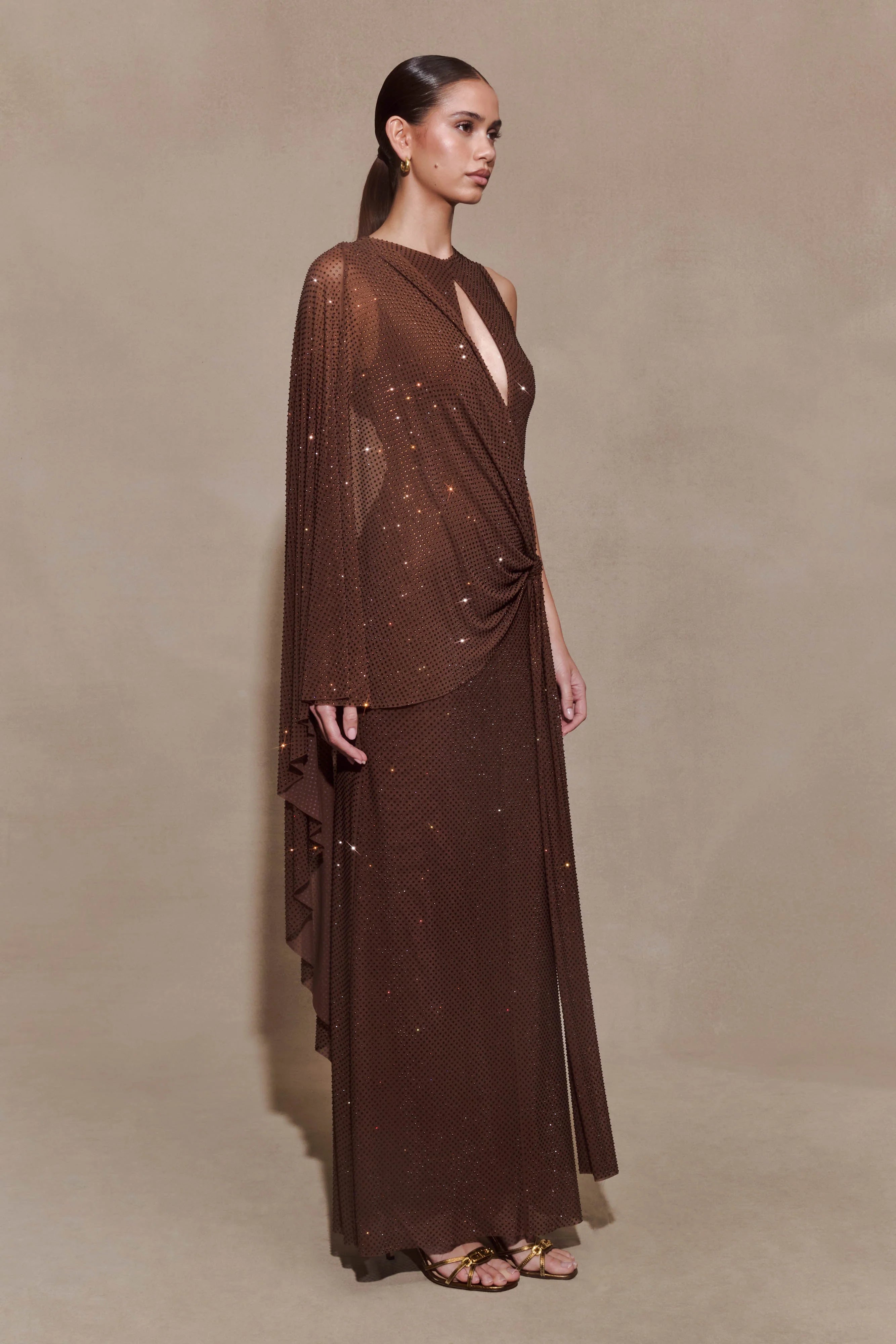 The BAKARI Diamante Cape Maxi Dress is crafted to command attention with its striking silhouette and refined detail. Designed with a crew neckline and gathered front, it flatters the frame with a fitted bodycon shape and front cut-out for added allure. The fixed overlay drape cascades from the shoulders like a cape, creating dramatic movement with every step. Finished with a back zipper closure and partial lining, this dress combines structure, shine, and sophistication for a show-stopping finish.