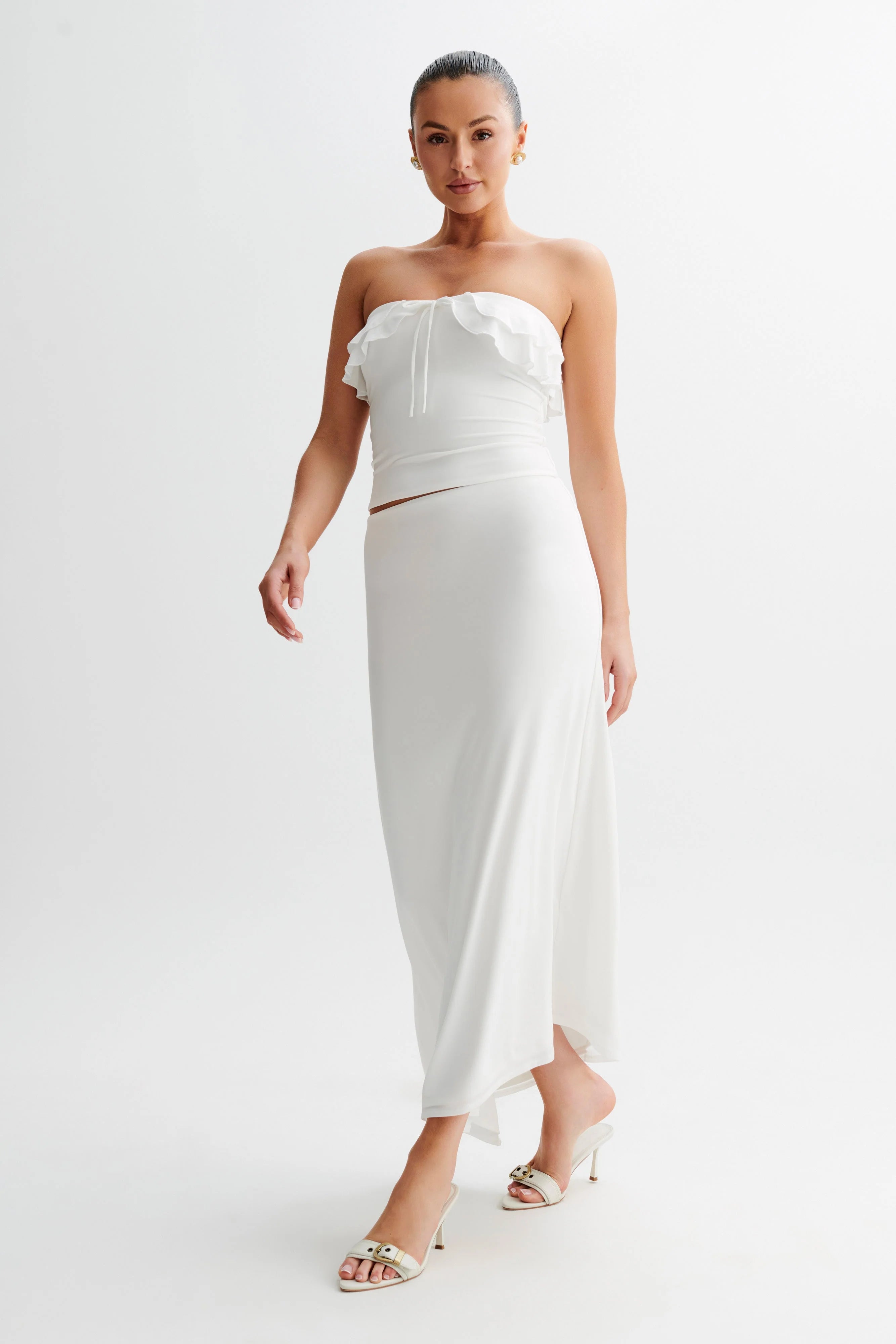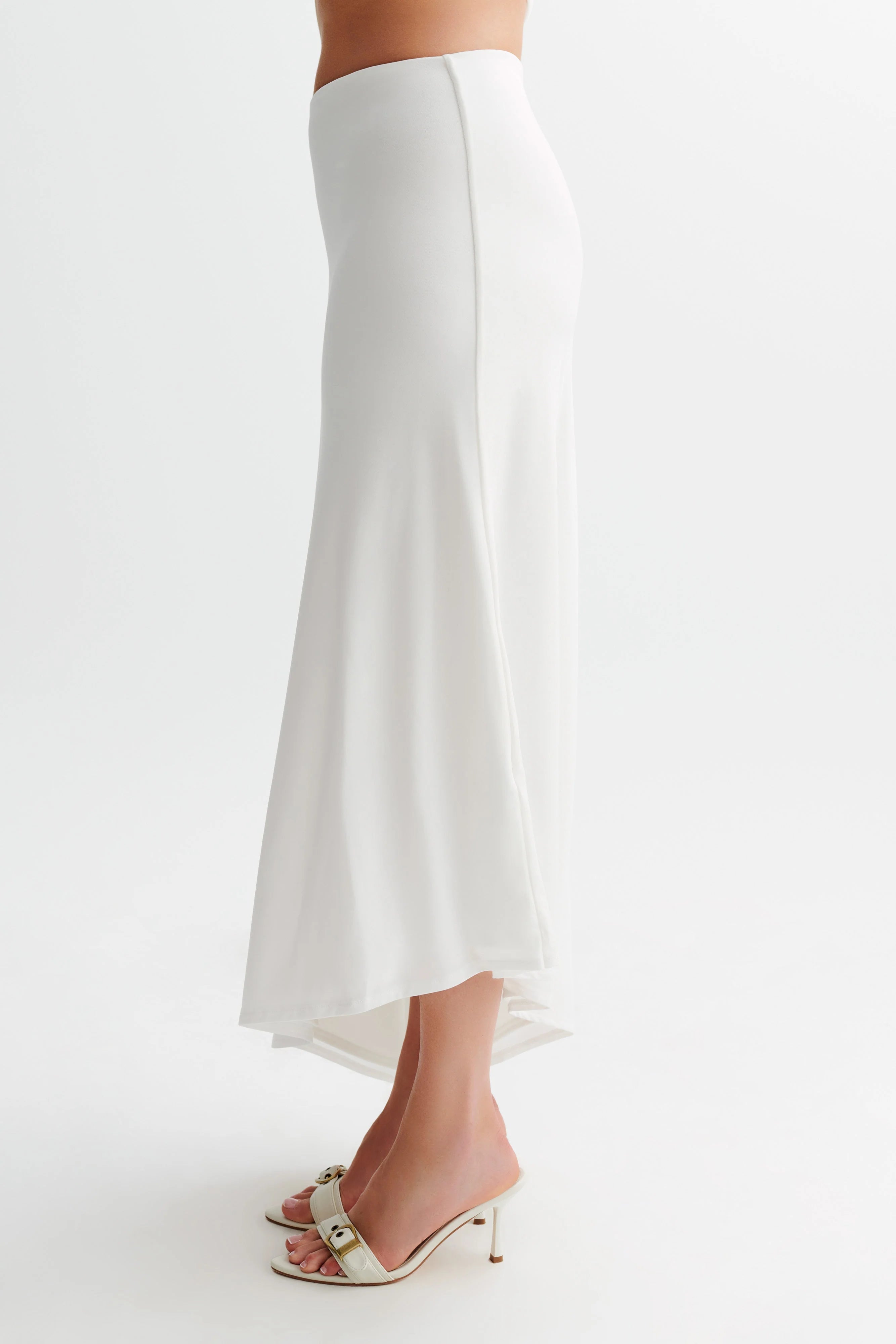 The BEA Asymmetrical Slinky Maxi Skirt is a chic and versatile piece that effortlessly elevates your wardrobe. Designed with a mid-rise waist, this skirt features an asymmetrical hem that adds a modern twist to the classic A-line silhouette. Crafted from luxurious scratch fabric, it offers a comfortable fit with a lined interior for added elegance. Perfect for any occasion, this slinky maxi skirt combines style and sophistication in one sleek design. Pair with the to complete the look.