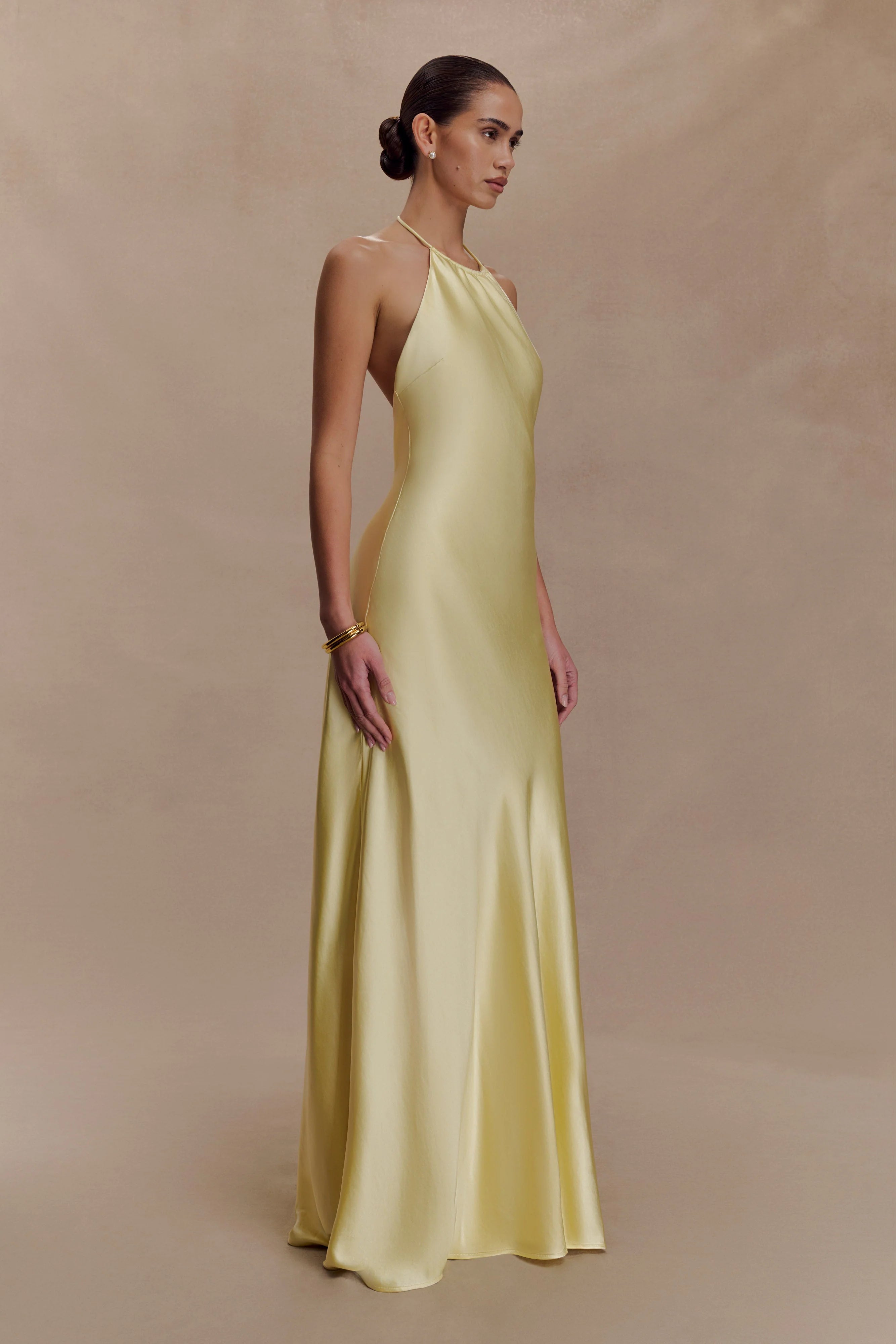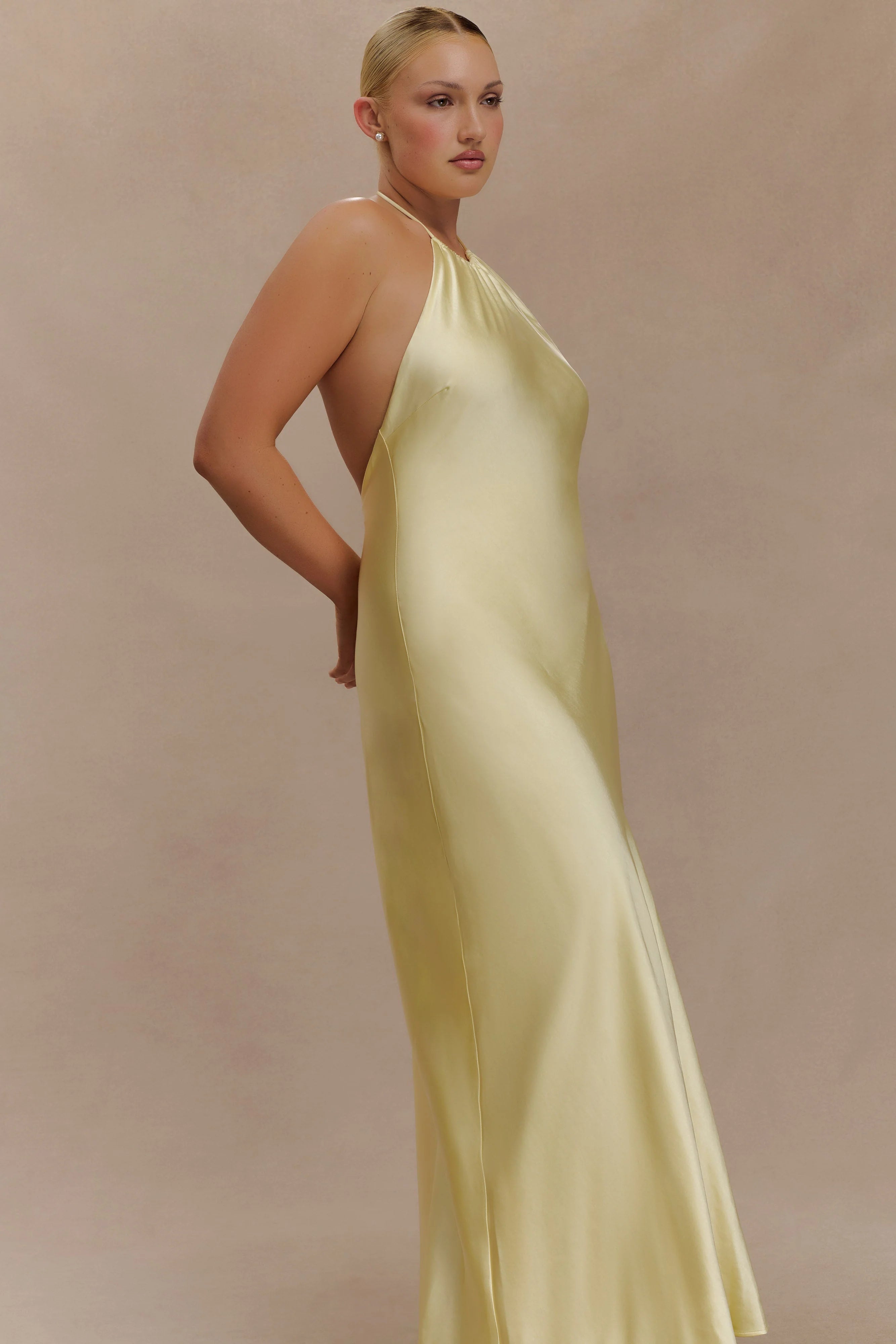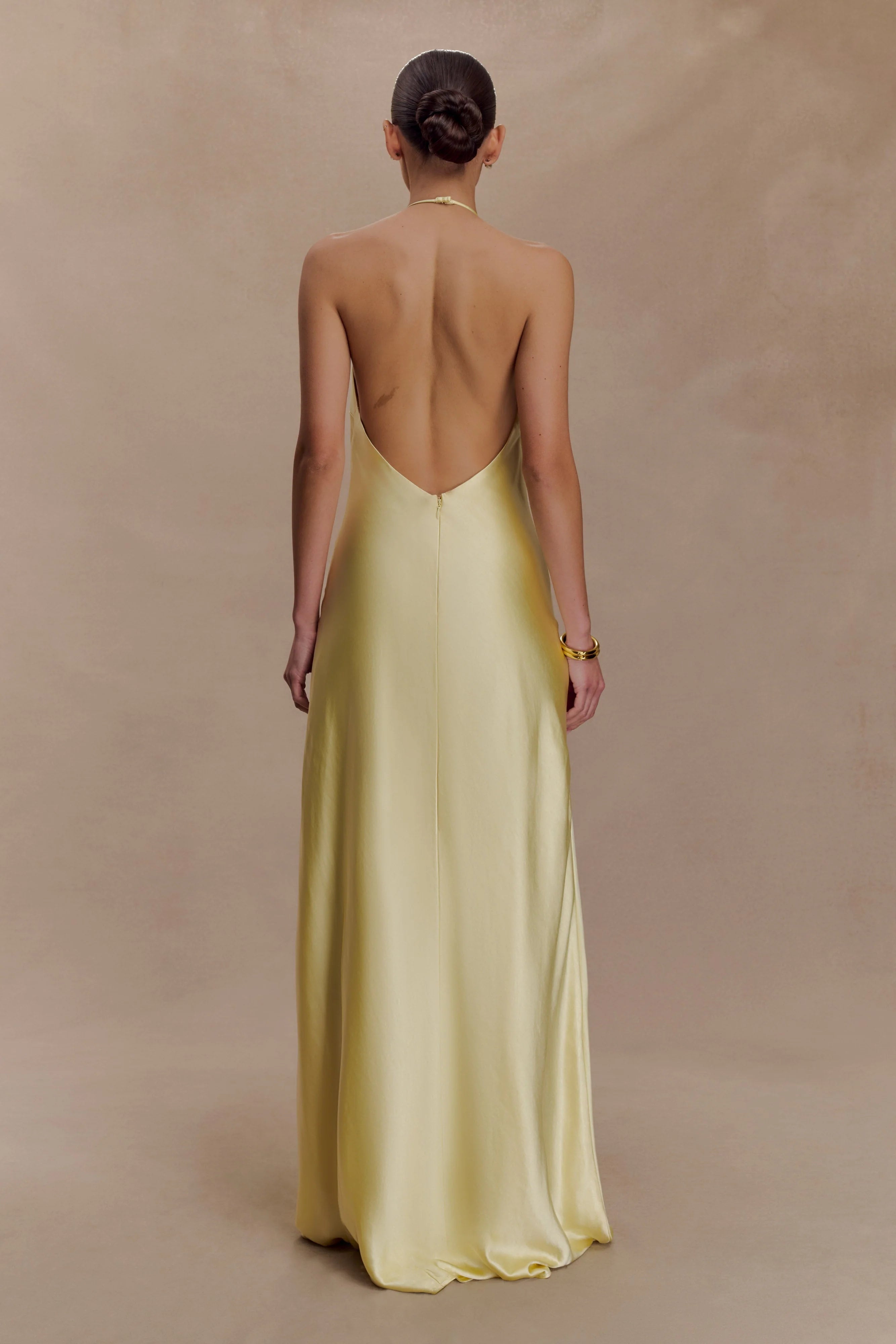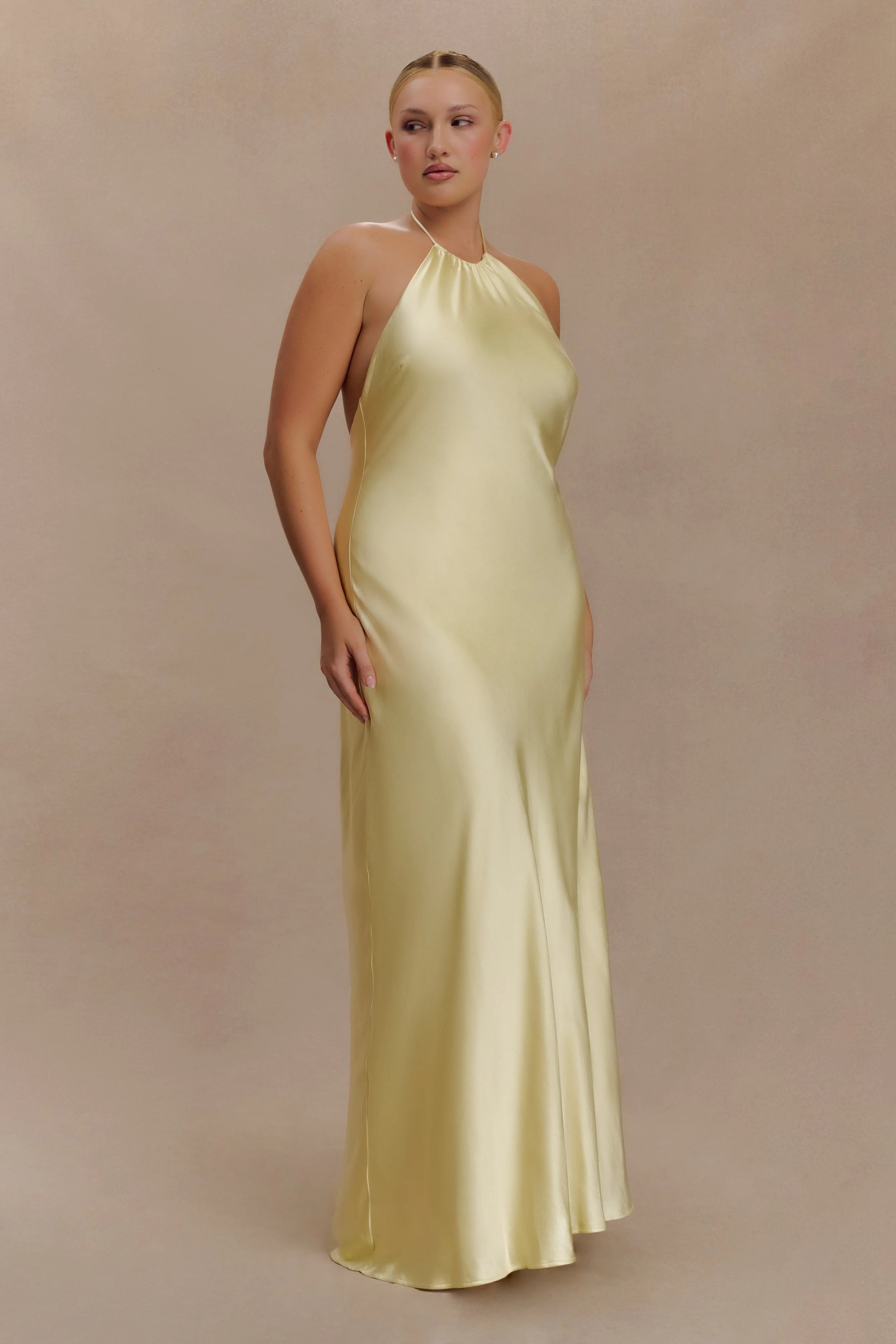 The BELLA Satin Halter Maxi Dress is designed for fluid movement and feminine ease. Featuring an adjustable halter neckline with soft gathers at the front, it flows into a relaxed silhouette that flatters without constraint. The open back adds a touch of sensuality, balanced by a straight skirt that skims the frame to a floor-grazing finish. Crafted in a lustrous satin fabrication and finished with an invisible back zip, this dress is your go-to for sunset soirées, destination weddings, and everything in between.