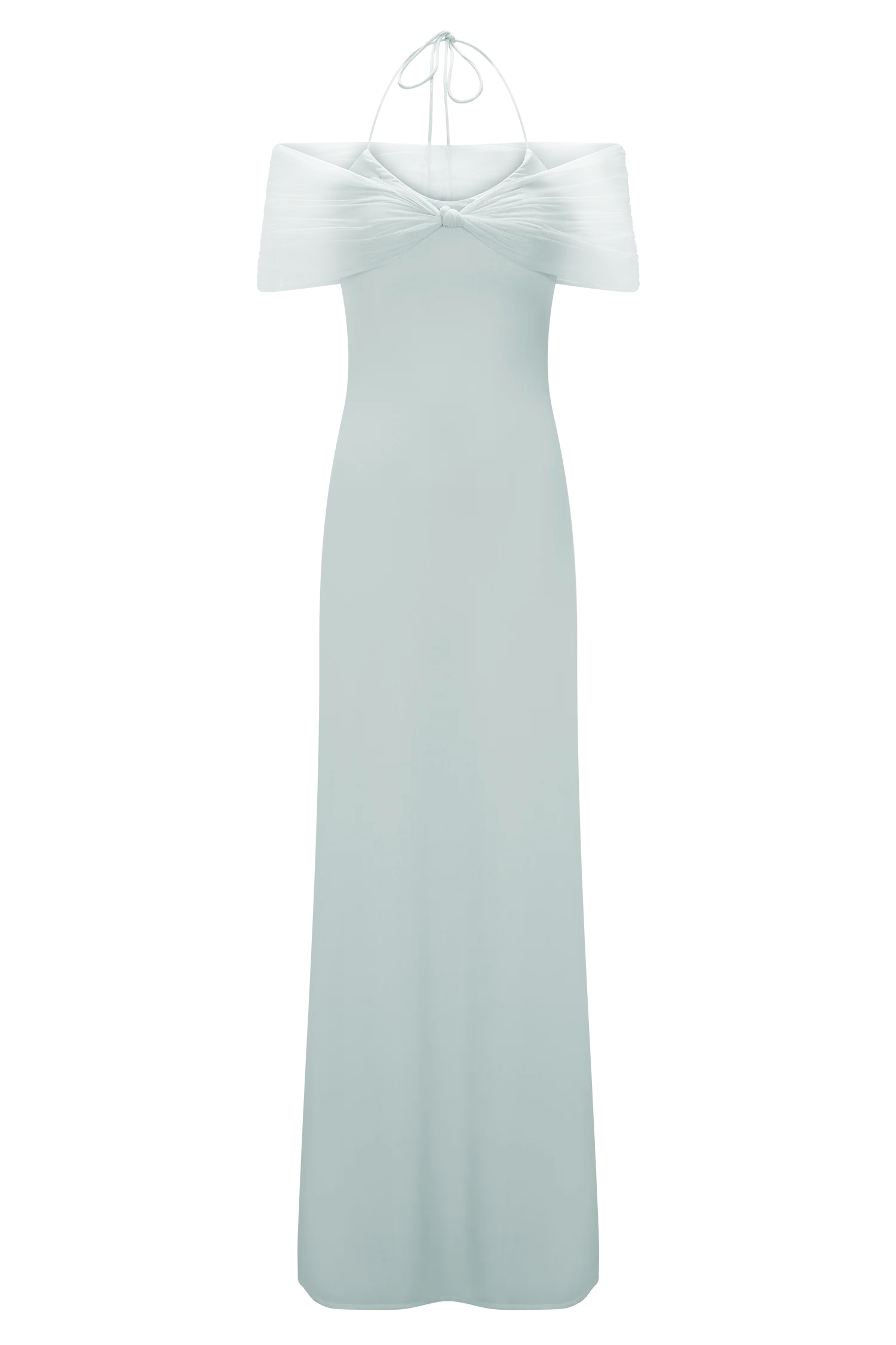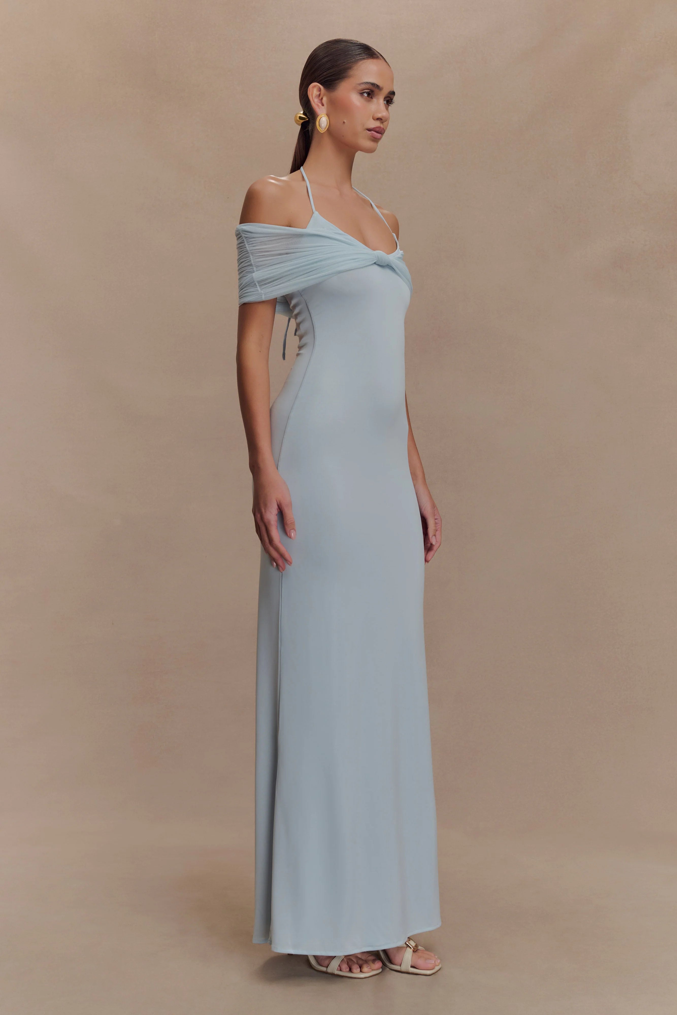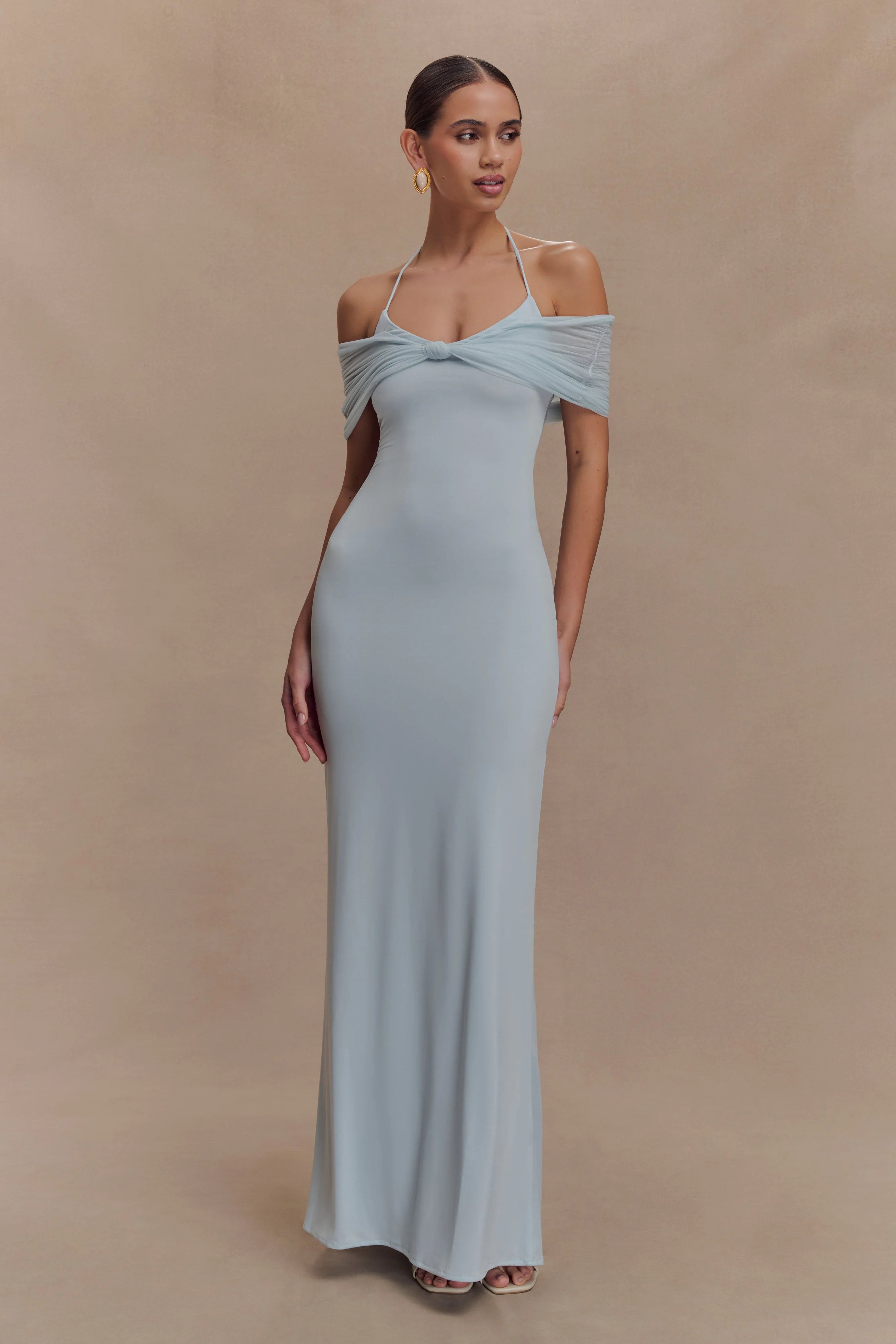 The BERNADINA Mesh And Slinky Halter Maxi Dress is your go-to statement piece for sun-drenched escapes and golden hour glamour. Designed with an adjustable halter neck and a fluid off-shoulder mesh overlay, this maxi silhouette flatters with a straight fit and a centre front knot that softly gathers at the waist. Lightweight and effortlessly elegant, this dress moves with the breeze—making it perfect for poolside cocktails, seaside dinners, and everything in between.