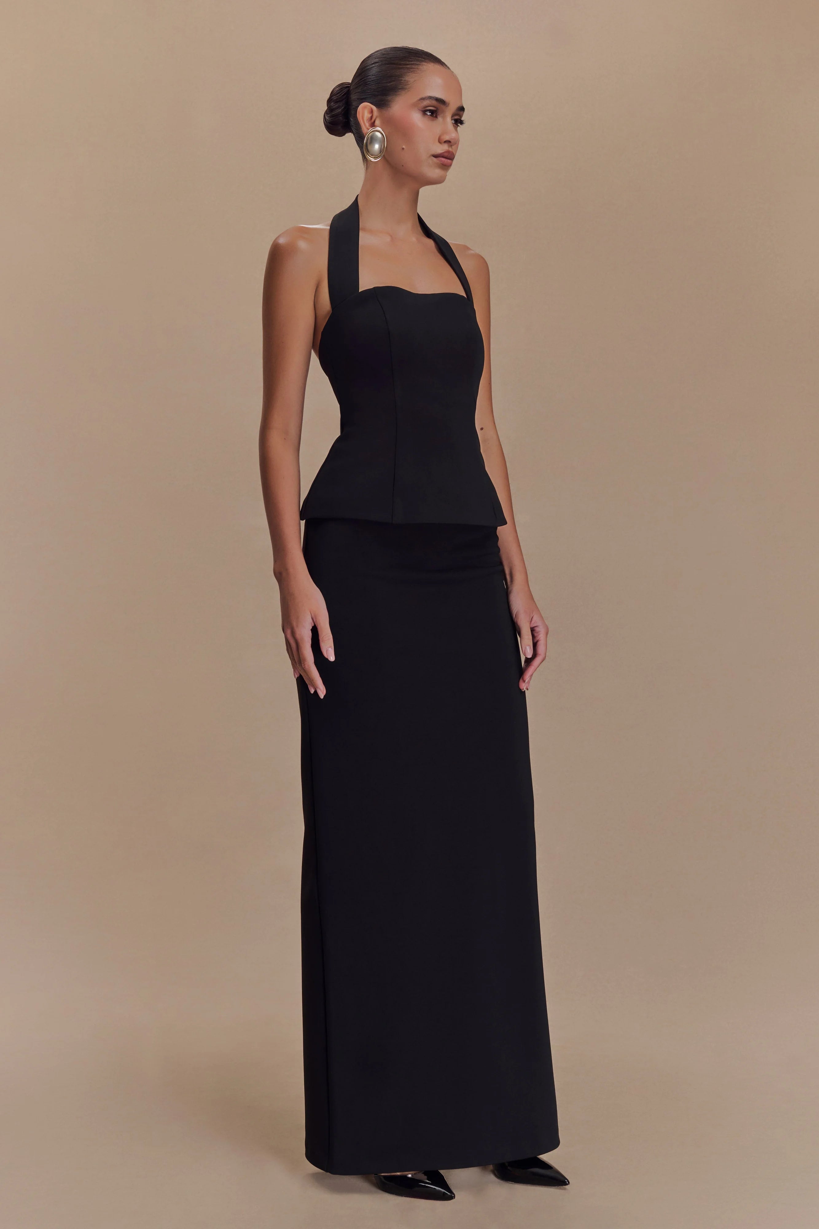 The BERTIE Peplum Halter Maxi Dress is a timeless blend of structured elegance and flattering design. Featuring a chic halter neckline and a fitted bodice, this dress sculpts your figure beautifully while the structured peplum adds a touch of dramatic flair. The sleek, fitted maxi pencil skirt gracefully elongates the silhouette, while the centre back zip ensures a smooth, seamless finish. Perfect for an evening out or special occasion, this dress offers a sophisticated yet bold look, combining classic style with modern appeal.