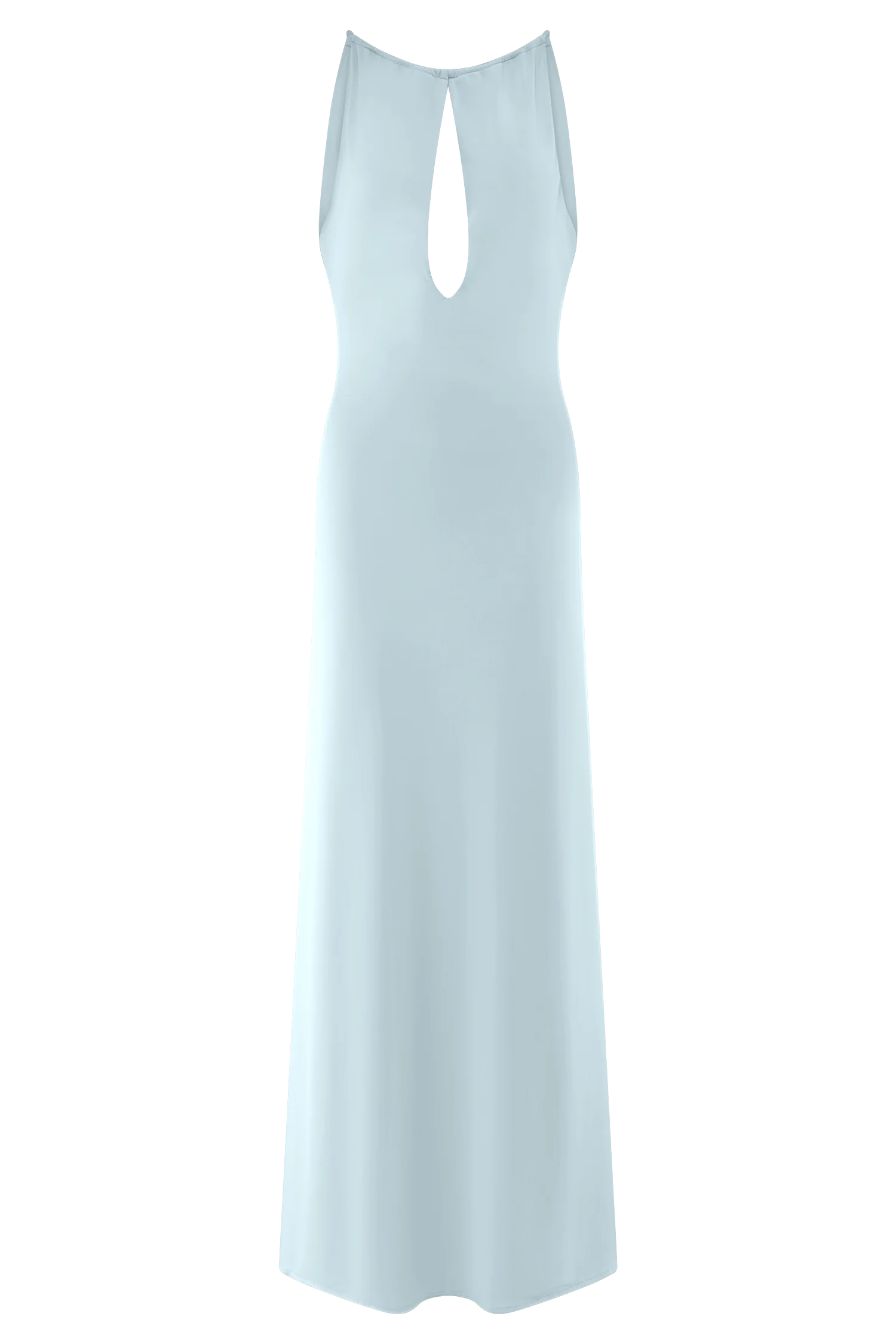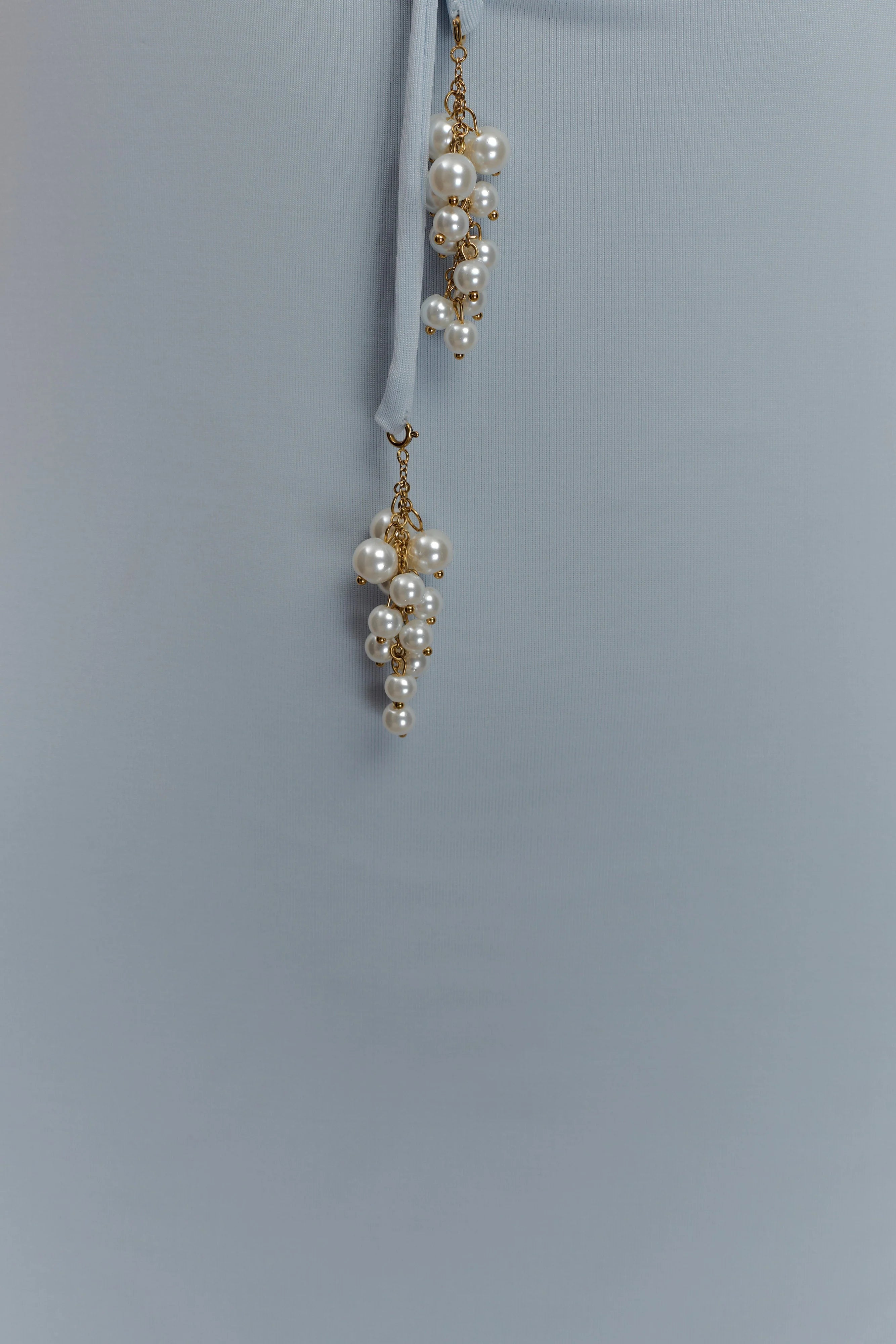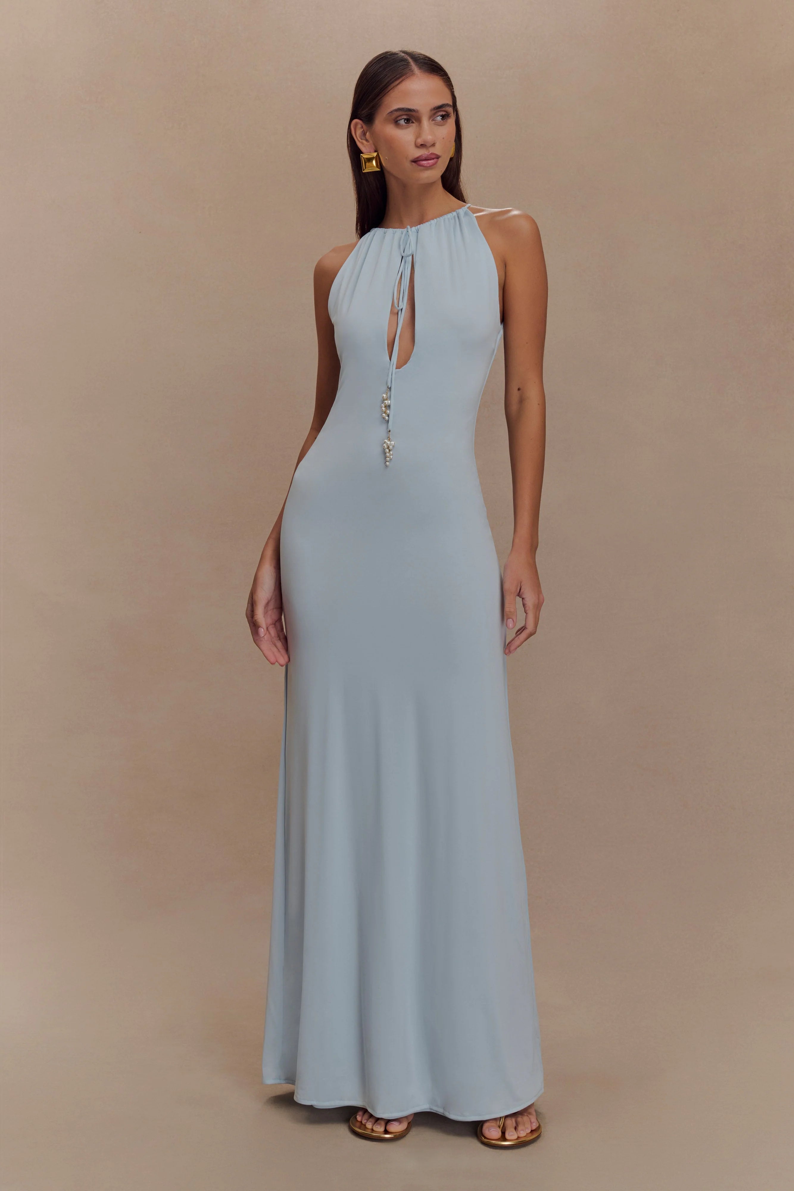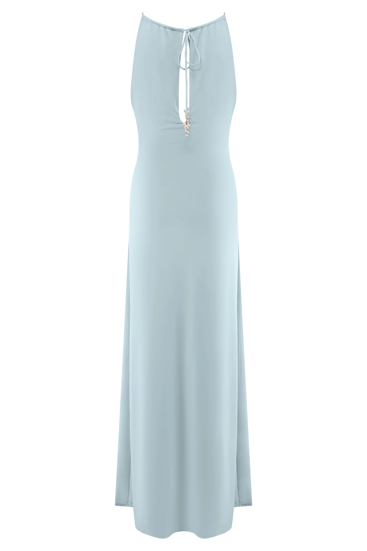 The BERYL Slinky Maxi Dress with Pearls is the epitome of effortless sophistication. Designed with a high gathered neckline that flows into a dramatic deep V plunge, this gown strikes the perfect balance between elegance and allure. The open V-back adds a striking touch, secured with delicate tie closures adorned with luminous pearls for a subtle yet stunning finish. Falling in a sleek straight-fit silhouette to a maxi length, this dress is perfect for evening occasions, modern bridal moments, or any event where timeless glamour takes centre stage.