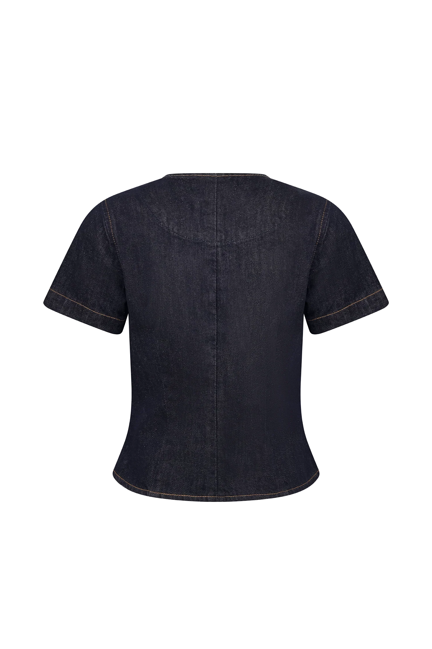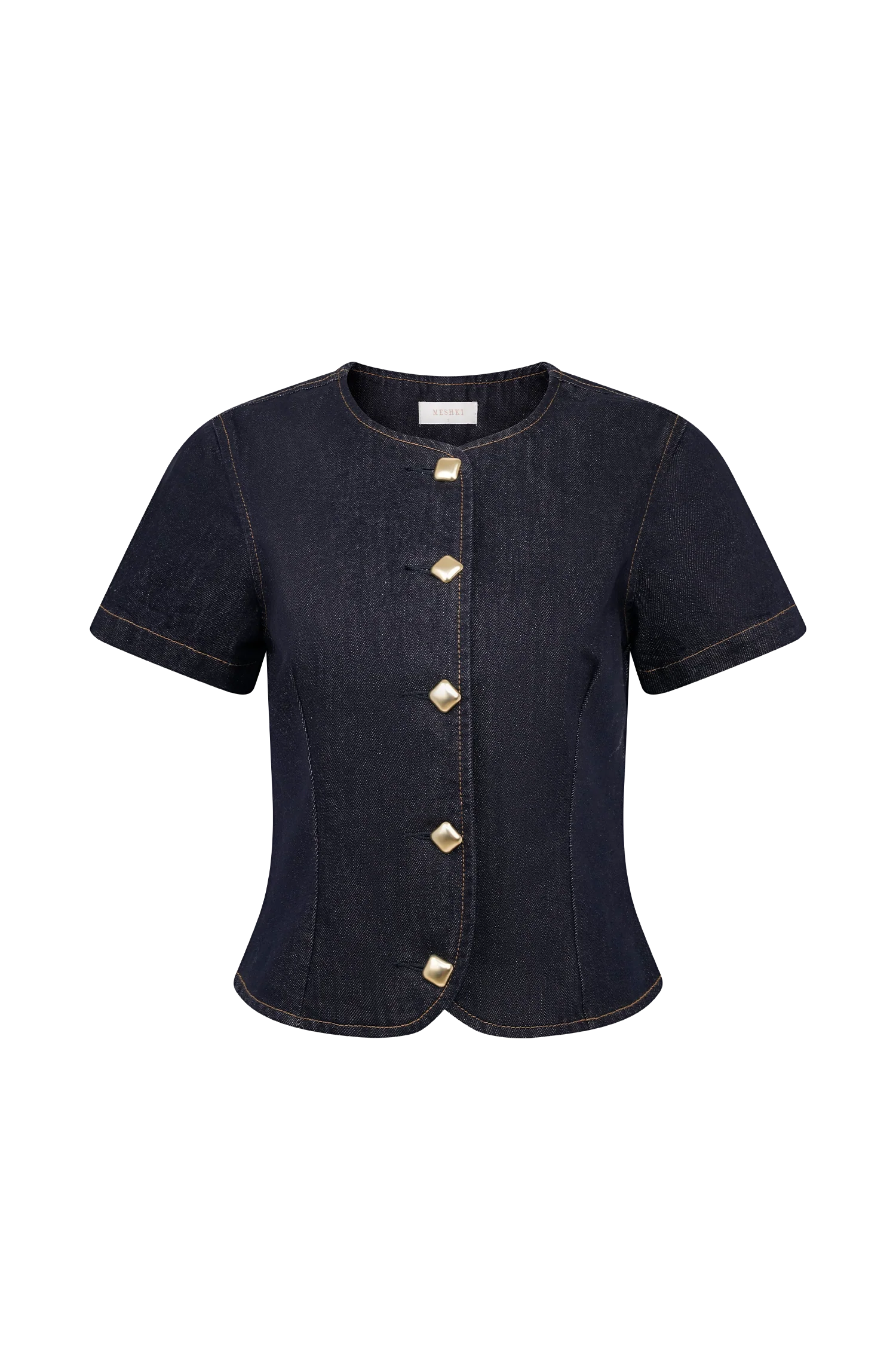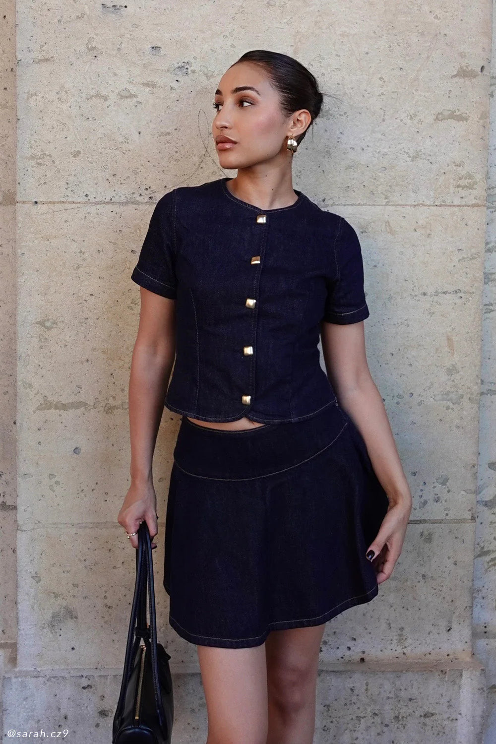 The BETHANY Short Sleeve Buttoned Denim Top is a fresh take on structured femininity. Featuring a sleek round neckline and short sleeves, this fitted design flatters the figure while front and back paneling add a touch of modern tailoring. The flared hem shape creates a soft, feminine finish, while custom mismatched buttons bring a unique and playful detail. Pair it with the for a coordinated look that blends effortless charm with contemporary edge.