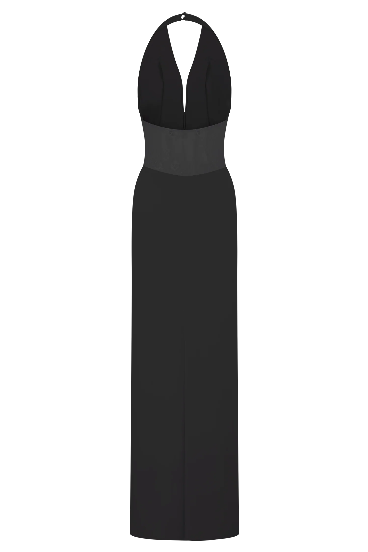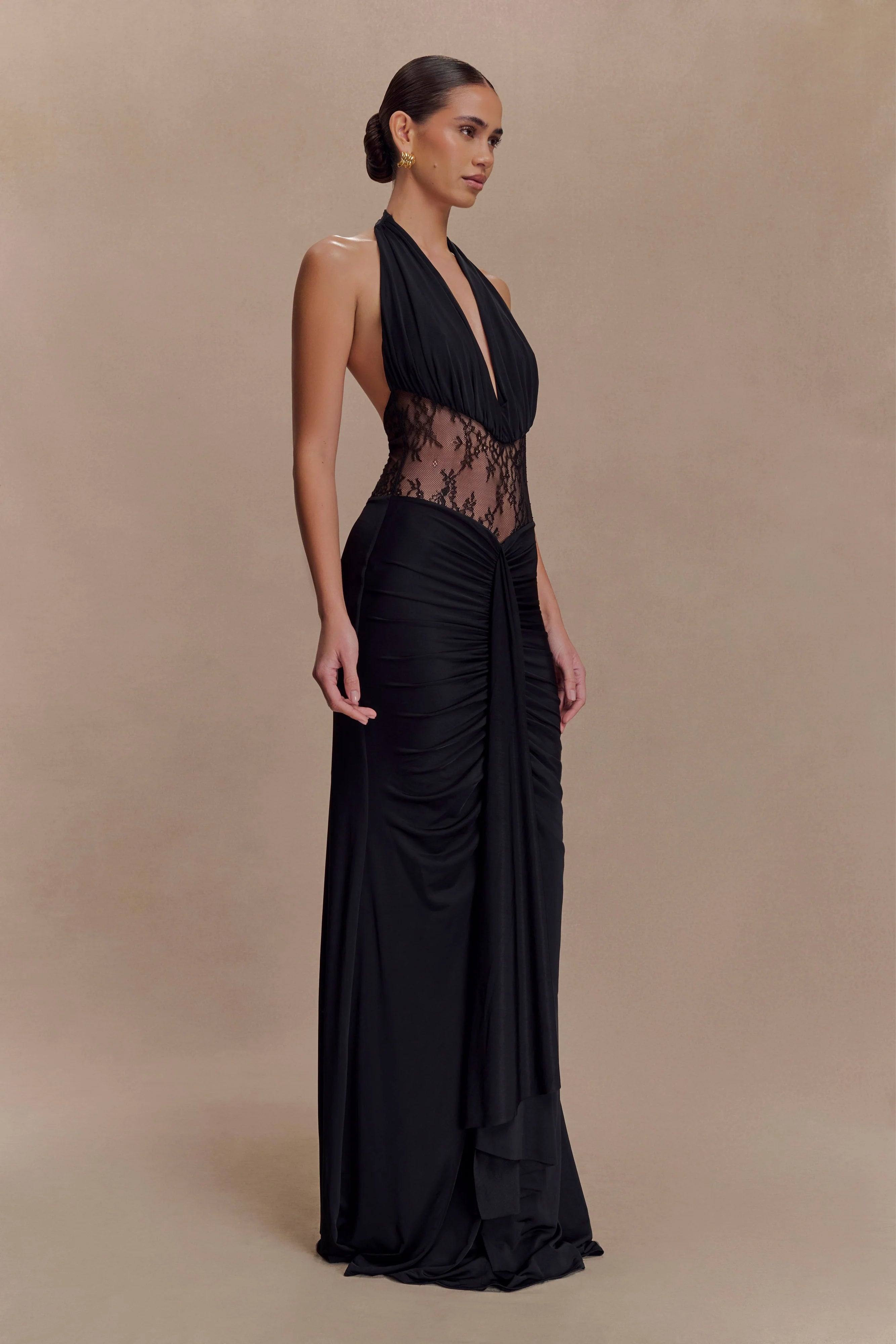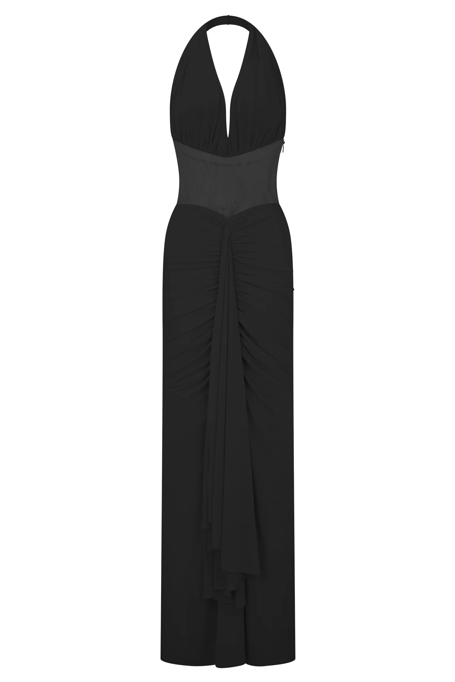 The BONNIE Slinky And Lace Maxi Dress is an elevated essential designed for elegant ease. Featuring a halter neckline and a gathered bust for a flattering fit, this dress is detailed with a delicate lace waist insert that adds texture and intrigue. The gathered skirt drapes effortlessly from the waist, creating movement and softness. Finished with a button and zipper closure and partially lined for comfort, this dress is your go-to for moonlit events, long dinners, and unforgettable entrances