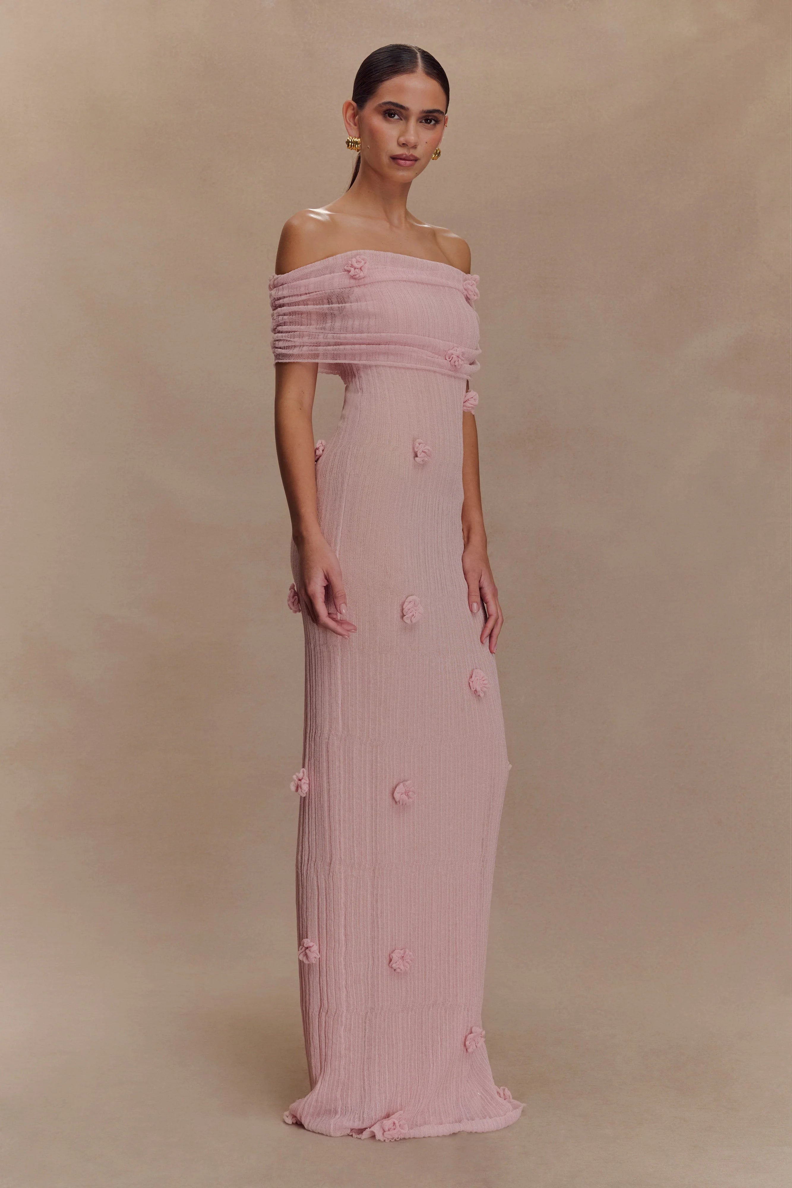 Make an unforgettable statement in the BRYNN Orchid Knit Maxi Dress, a perfect blend of elegance and modern femininity. Designed with an off-the-shoulder neckline, this dress drapes beautifully, highlighting your décolletage. The ruched overlay creates a flattering silhouette, while delicate flower appliqués add a whimsical, romantic touch. Crafted from a sheer knit and mesh-lined for coverage, the maxi-length design flows effortlessly with every step. Whether for a special event or a night to remember, this dress is your go-to for timeless sophistication.