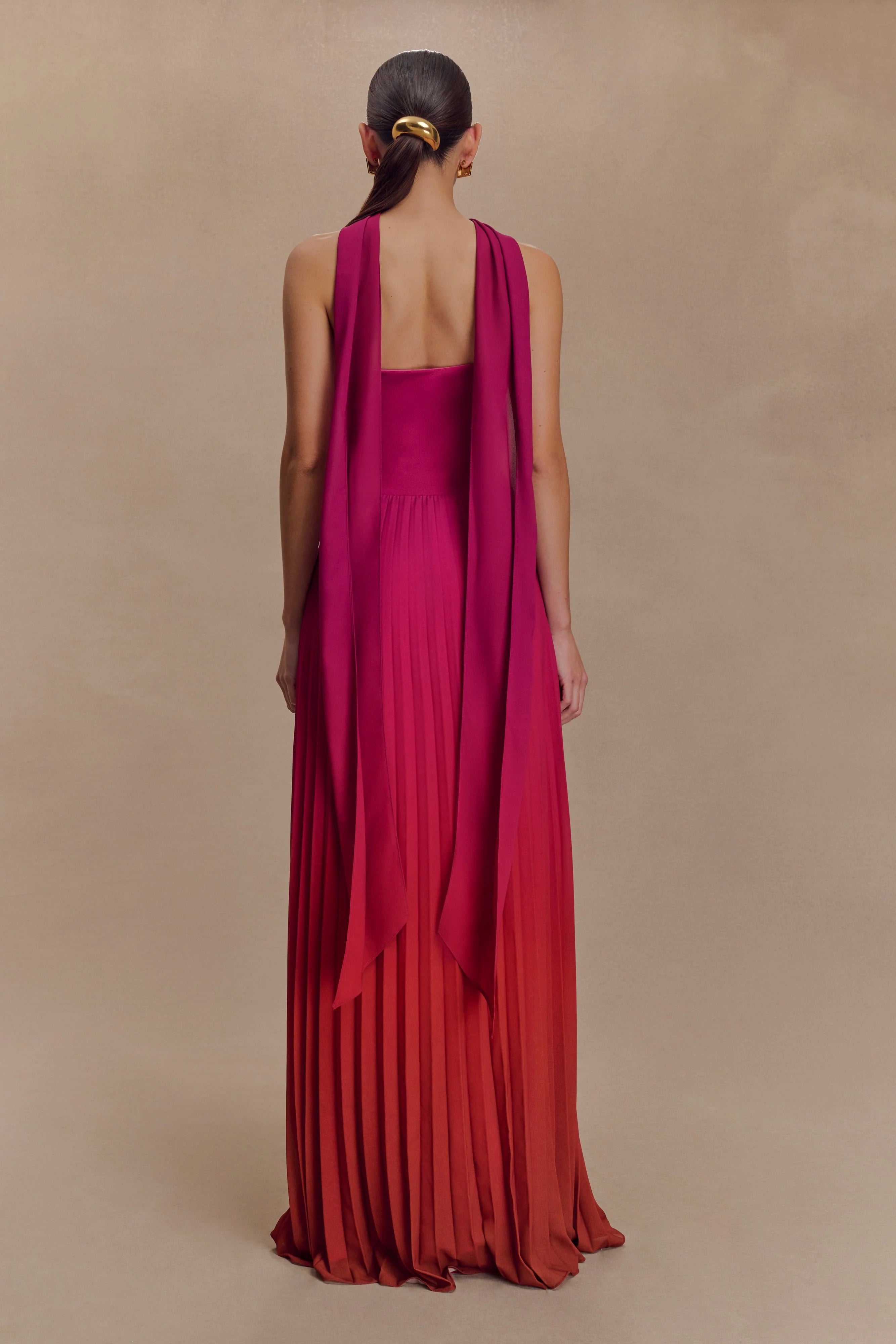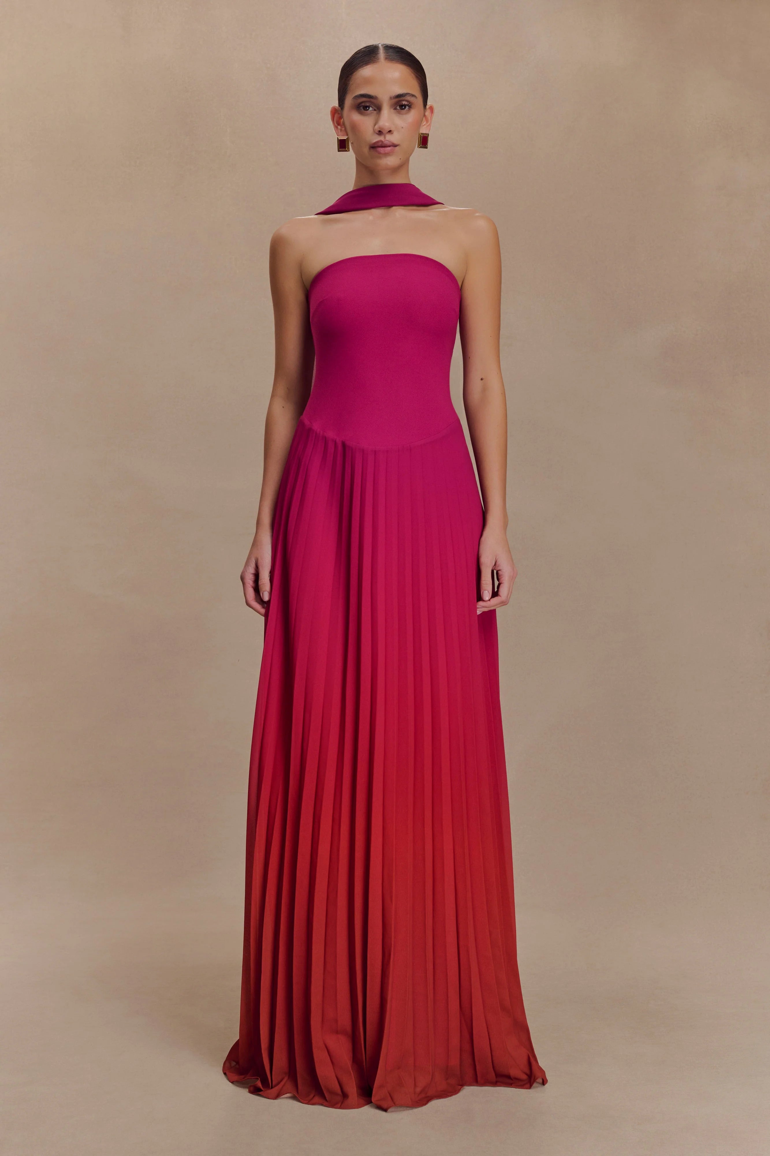 The CAIRA Chiffon Scarf Maxi Dress is a refined silhouette made for graceful moments. Featuring a strapless neckline with internal grip tape for a secure fit, the structured bodice contrasts beautifully with a flowing, pleated chiffon skirt that moves with ease. A removable scarf offers styling versatility—drape it for added drama or wear it bare for a minimalist finish. Finished in a timeless maxi length, this dress is the perfect choice for garden parties, destination dinners, or golden-hour celebrations.