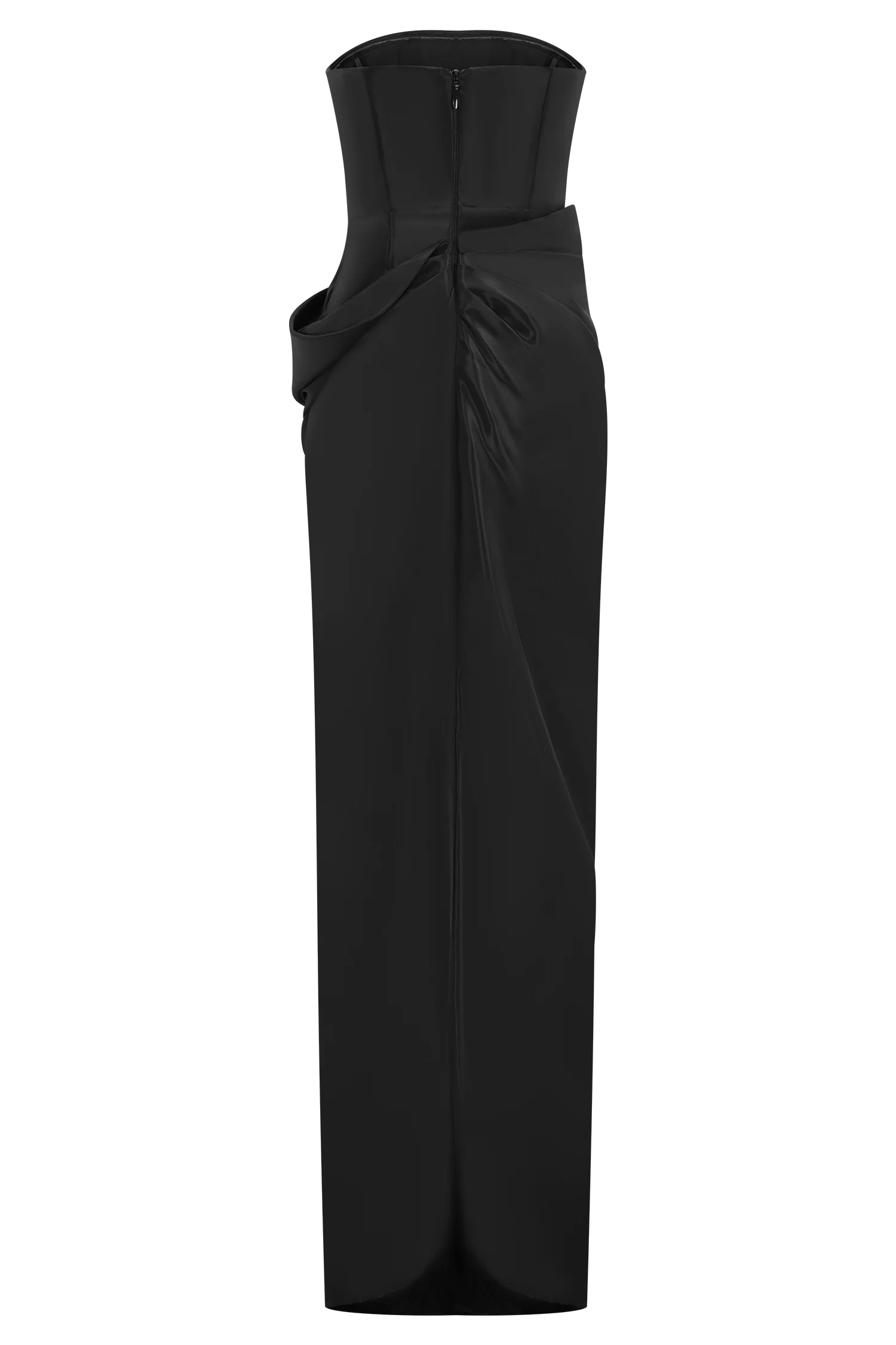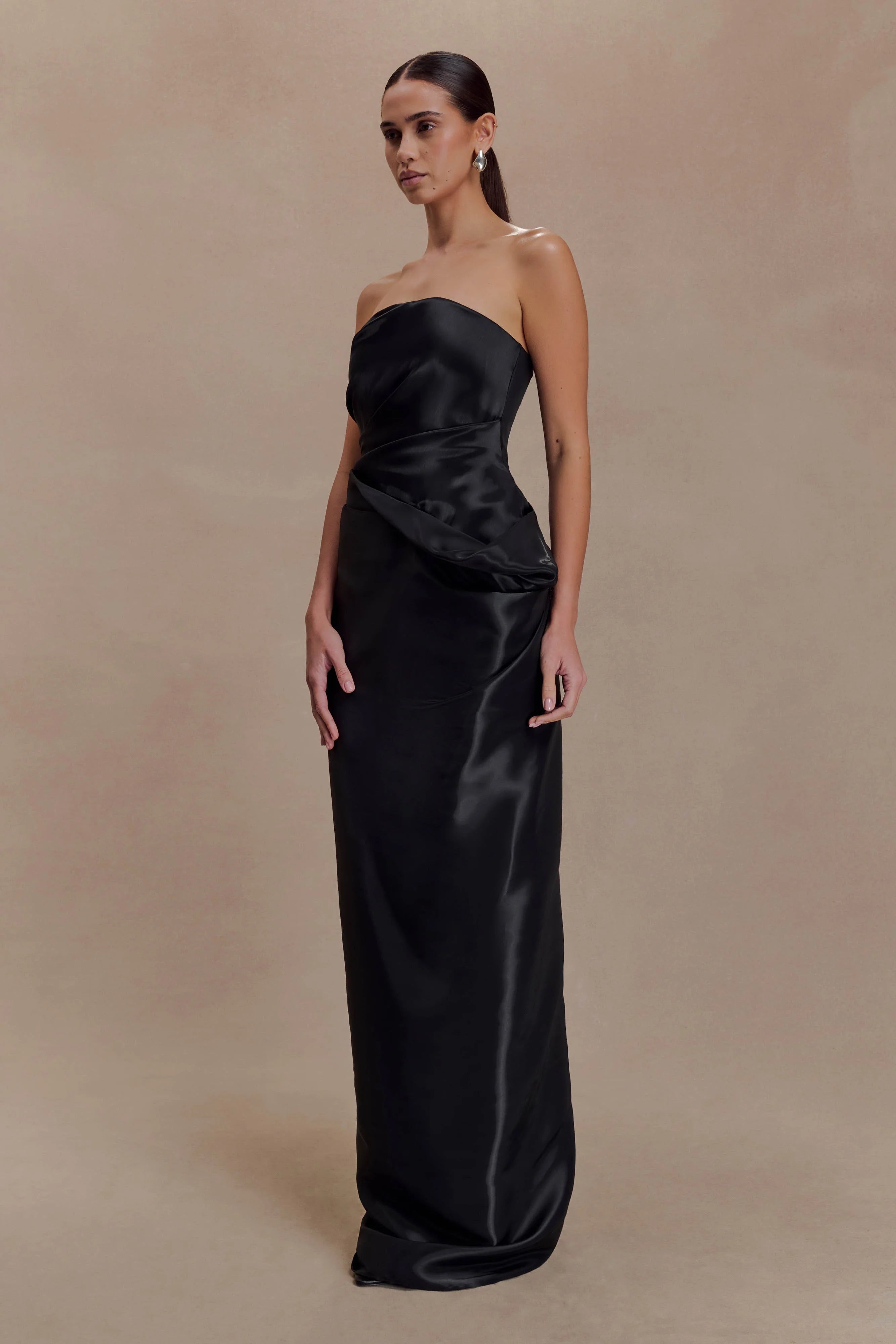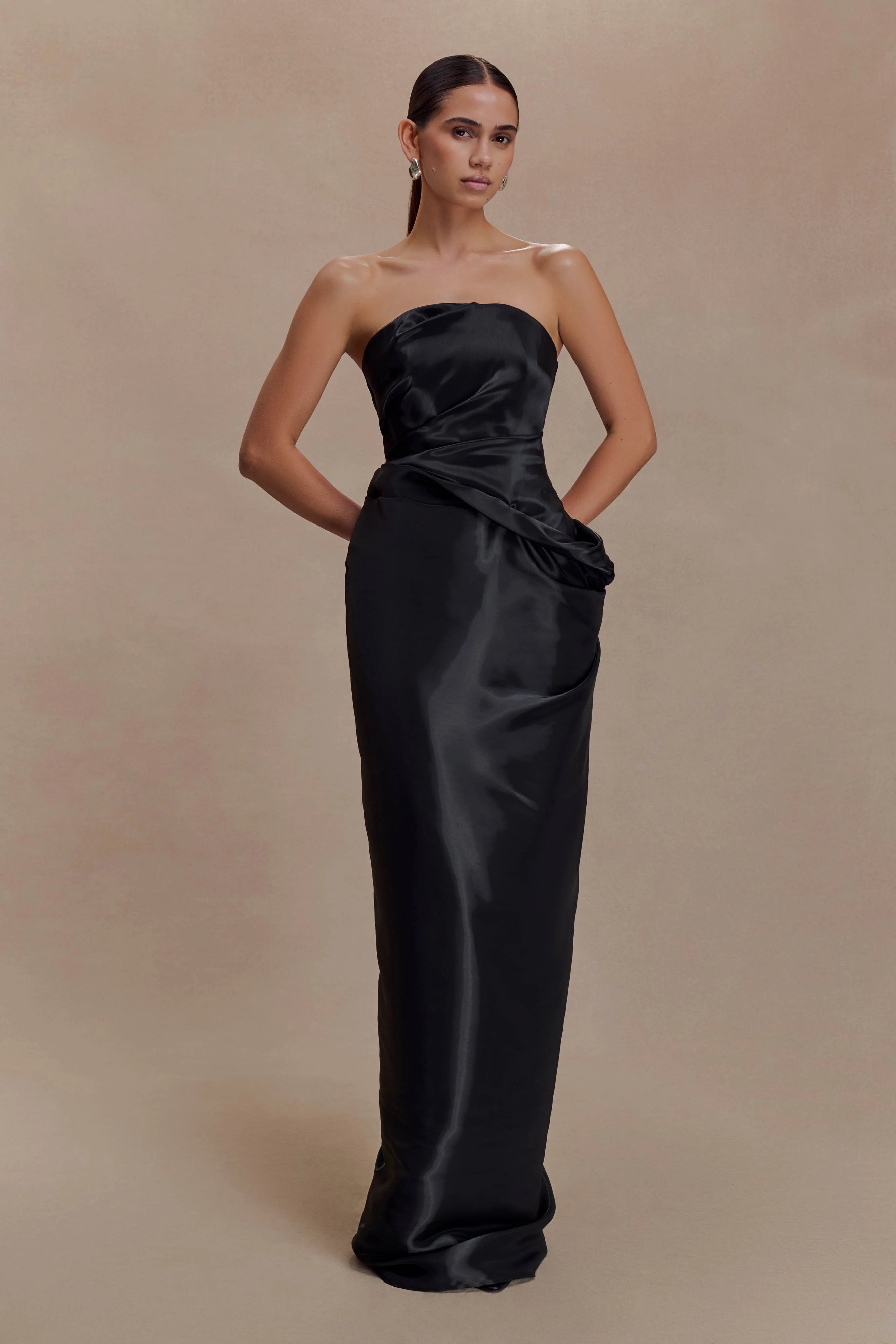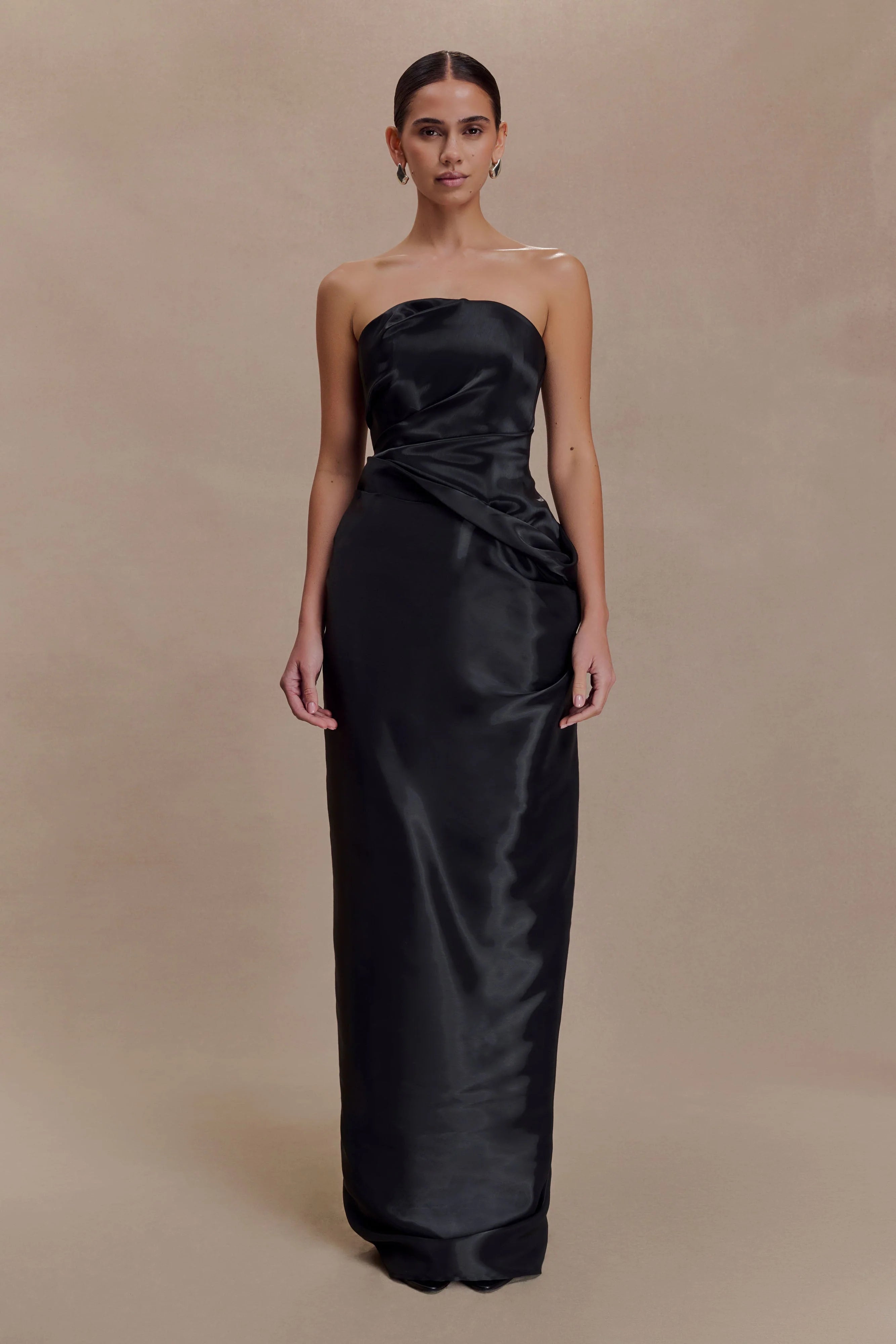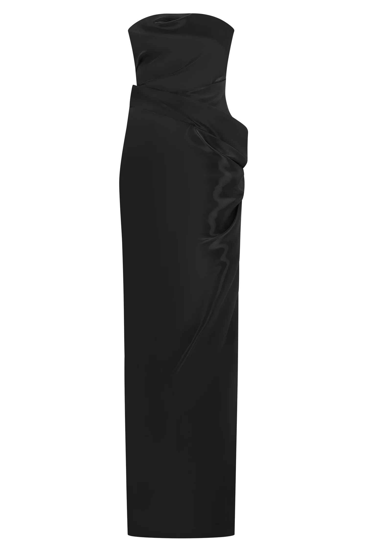 The CALLIOPE Strapless Organza Maxi Dress is a study in understated elegance. Designed with a clean strapless neckline and side tucks that sculpt the silhouette, it falls into soft draping that moves fluidly with every step. Crafted from sheer organza and fully lined for comfort, it’s finished with an invisible zip and centre back split for ease and polish. This dress blends modern minimalism with timeless femininity — an elevated choice for any occasion that calls for quiet sophistication.