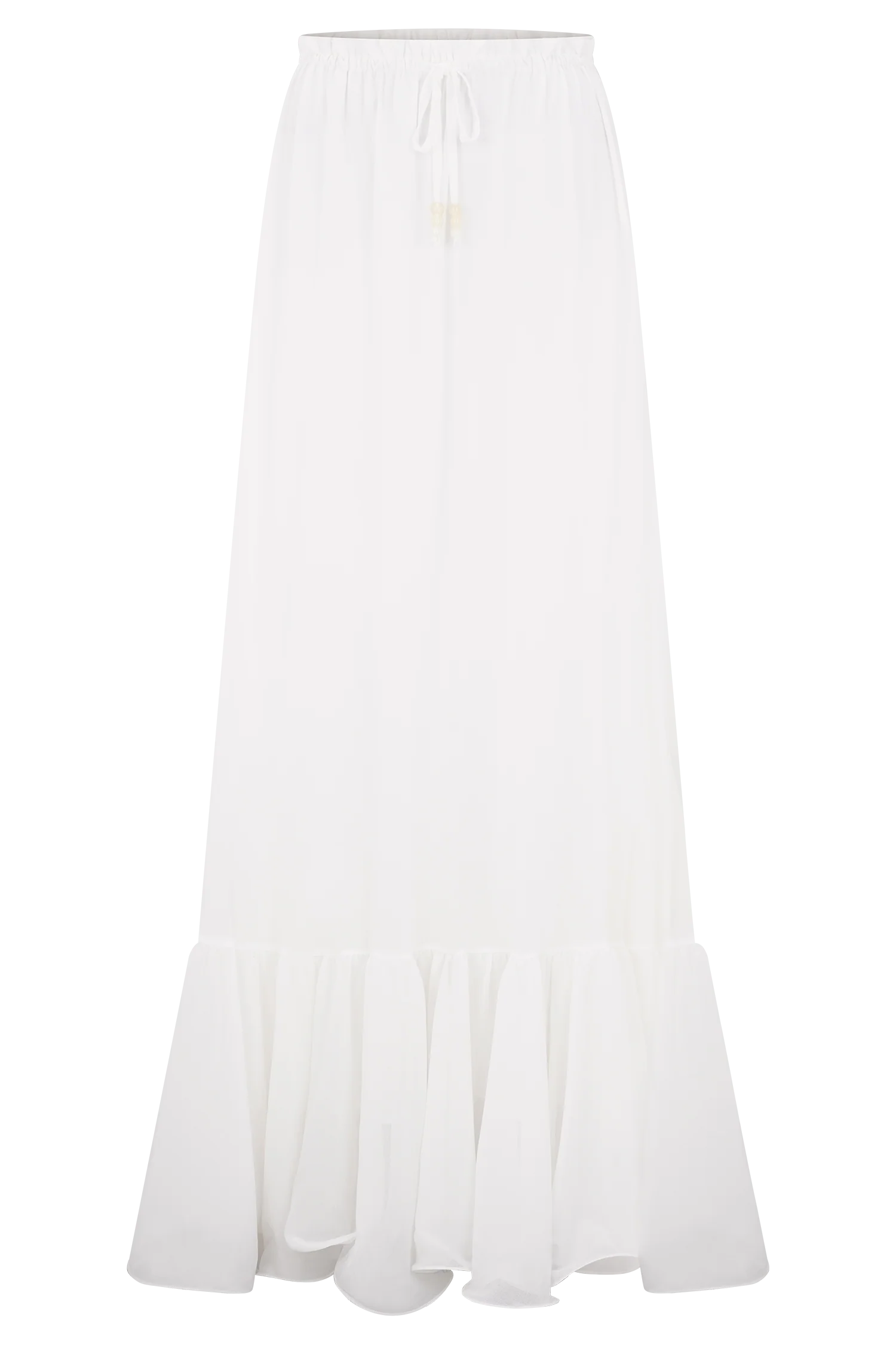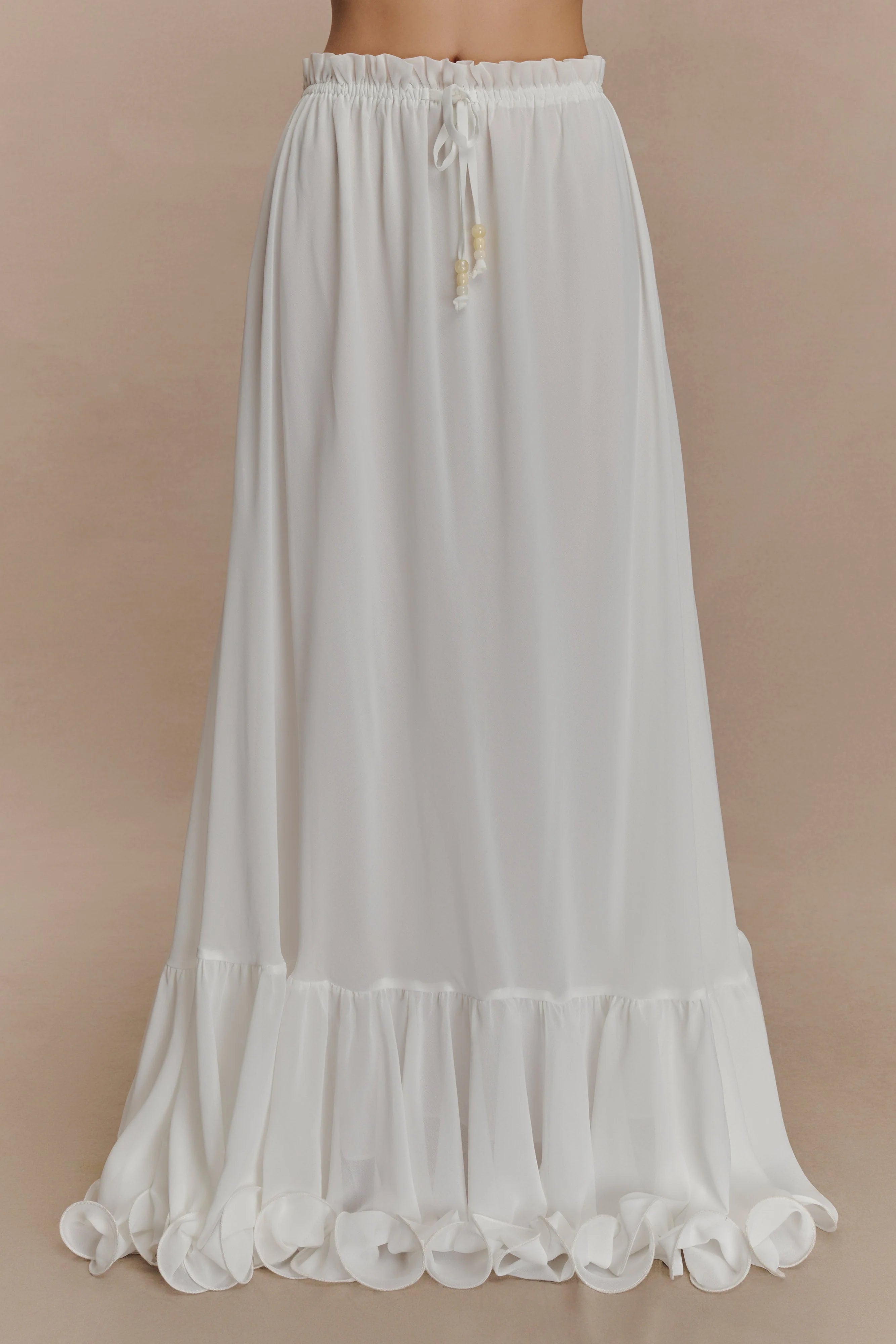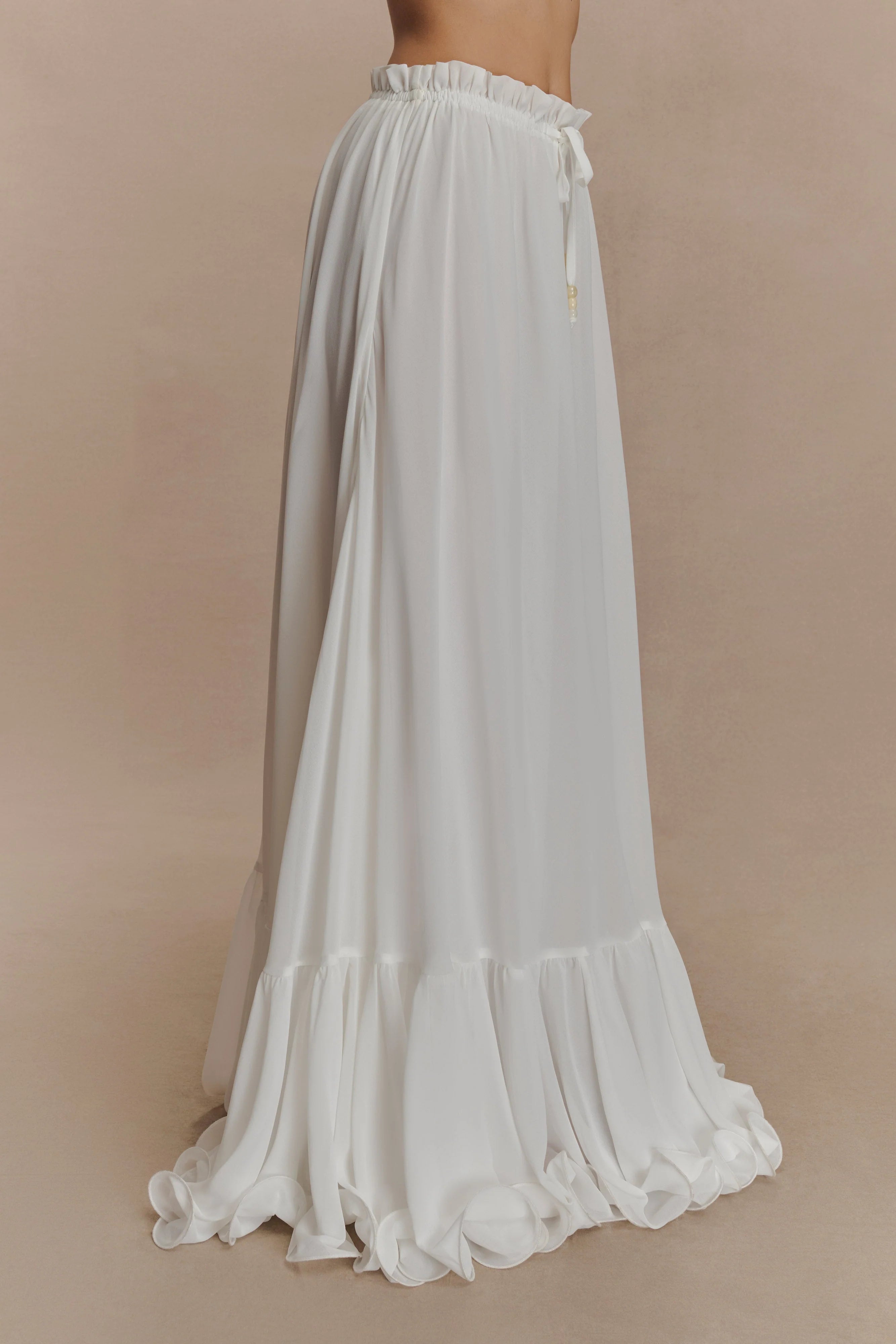 The CARLIE Chiffon Maxi Skirt brings effortless elegance to your warm-weather wardrobe. Designed with a relaxed fit and soft drape, this maxi skirt features a gathered lower tier for graceful movement and a self-tie front that cinches the waist just right. Lightweight and breezy, it’s the perfect pairing for your most romantic moments—whether you're wandering through coastal towns or dressing up for sunset dinners.
