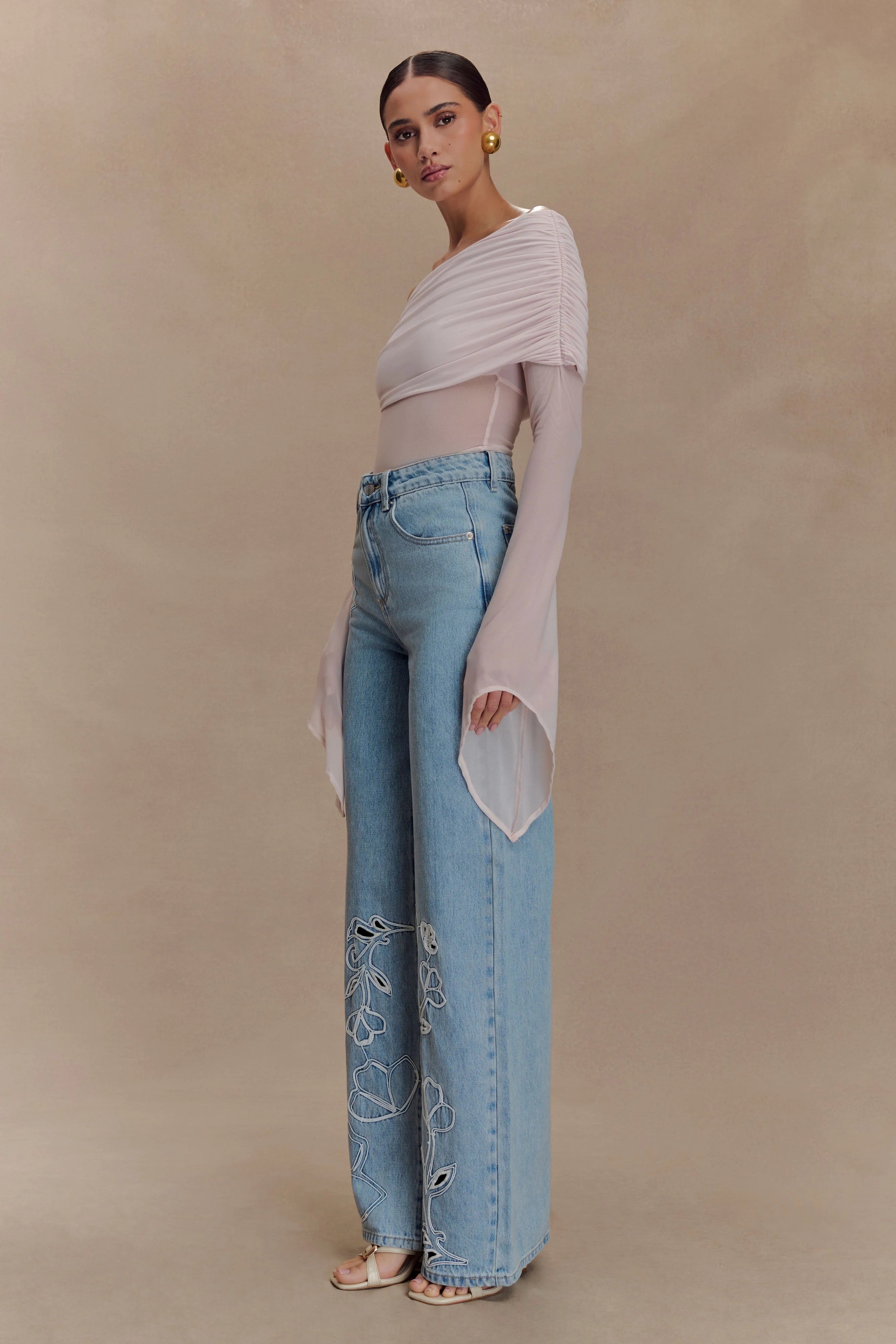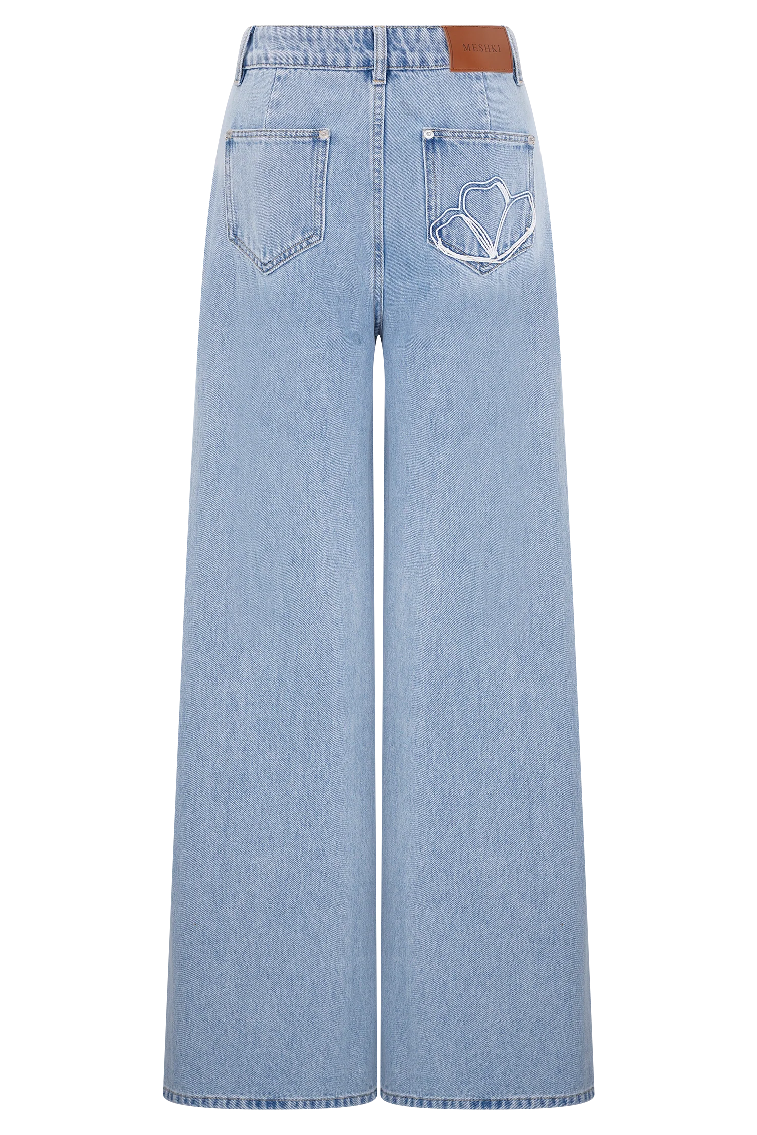 The CARMELLA Embroidered Straight Leg Jeans bring a soft statement to your summer denim edit. Designed with a high waist and wide leg silhouette, these jeans feature a fly front closure, classic pocket styling, and intricate embroidery with cut-out detailing that adds texture and a feminine edge. Perfect for pairing with breezy blouses or a structured corset, these jeans blend timeless denim with a touch of artisanal charm.