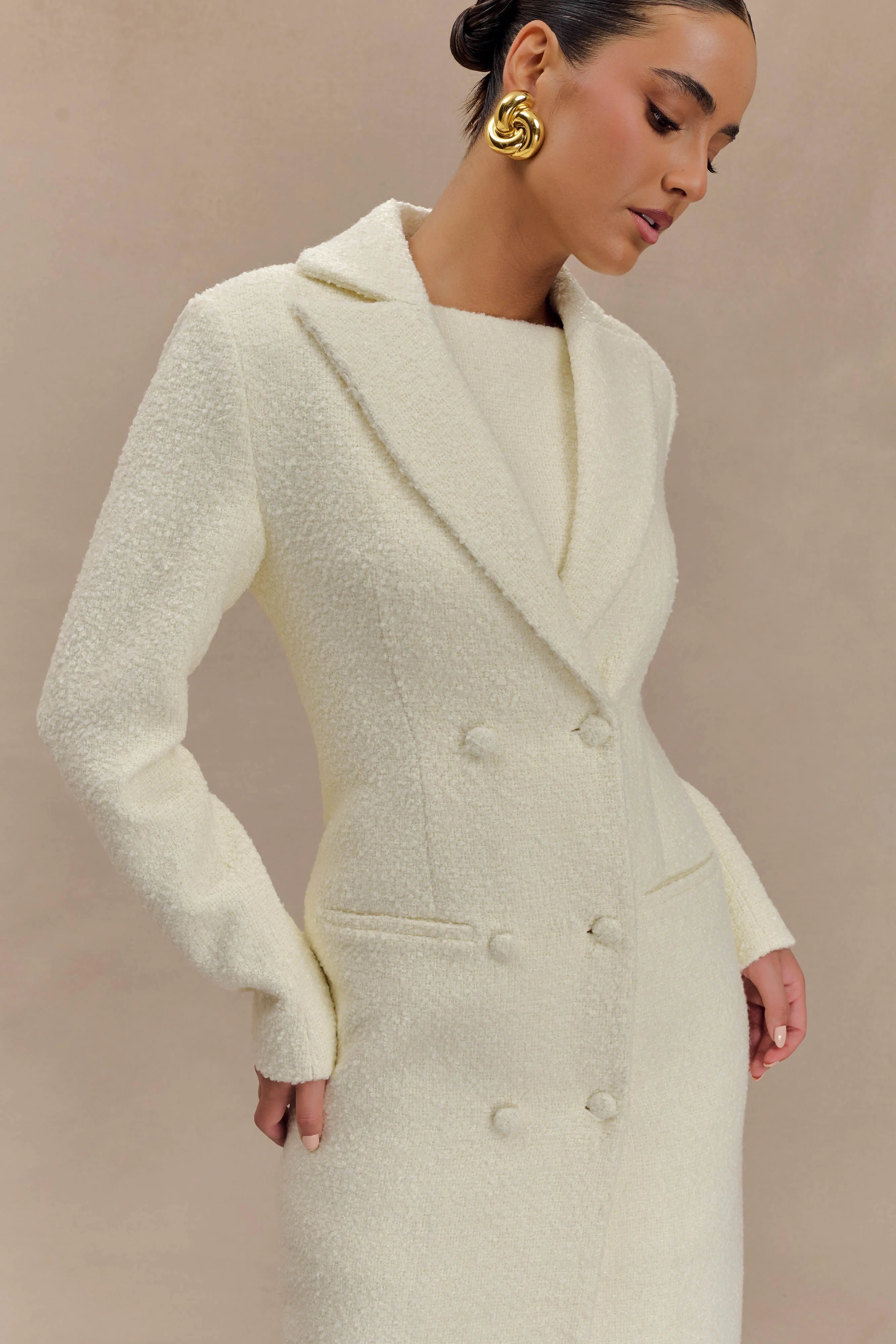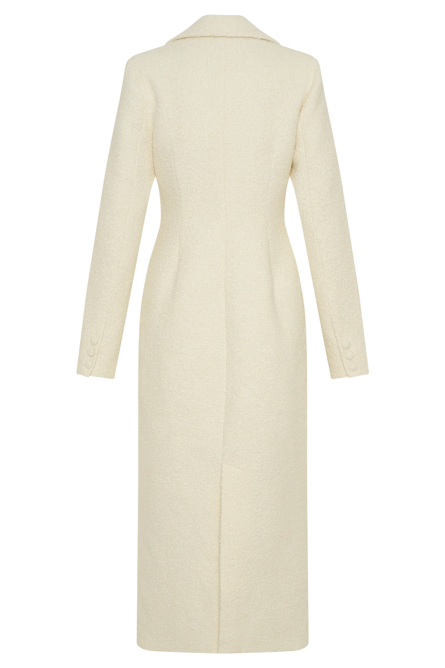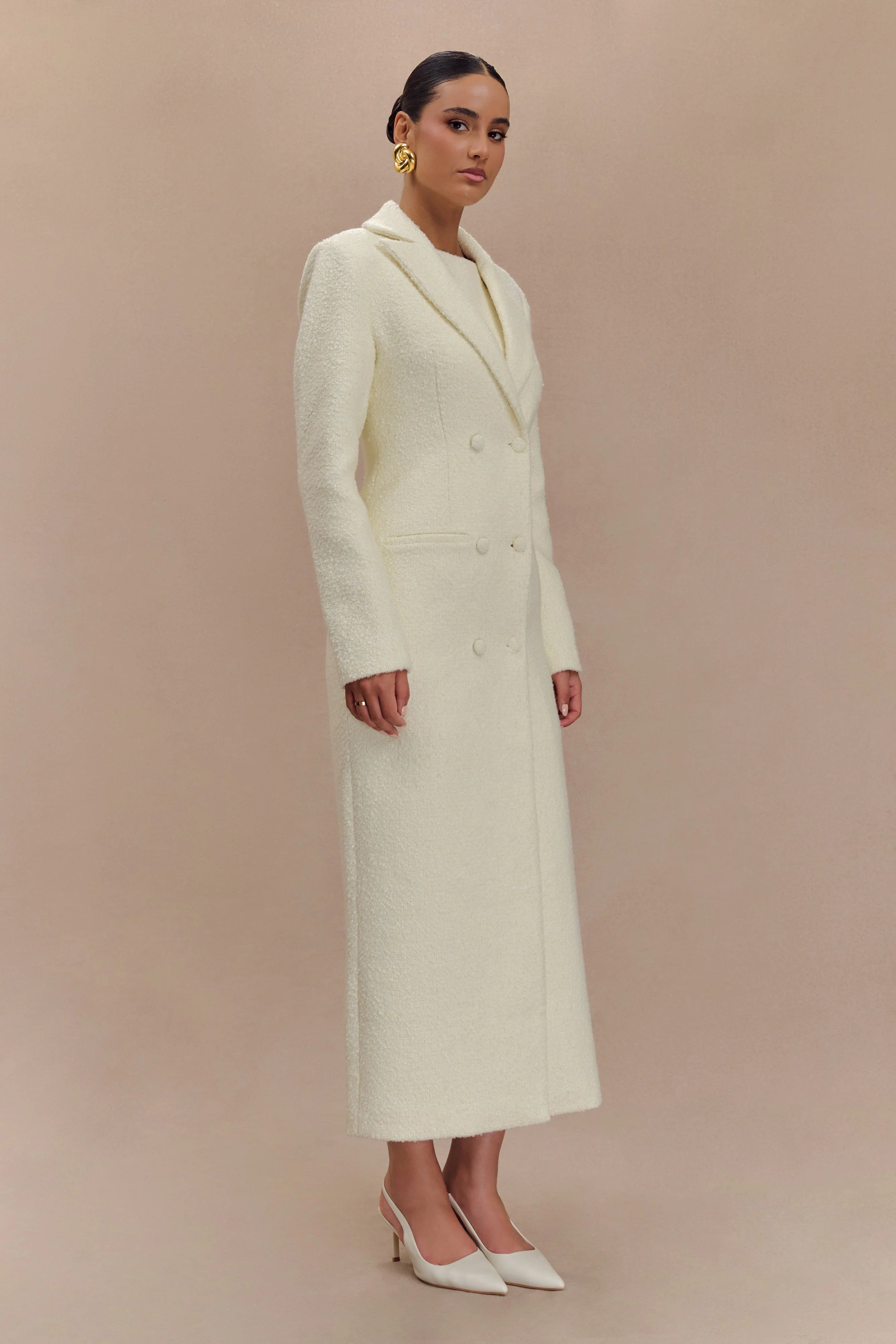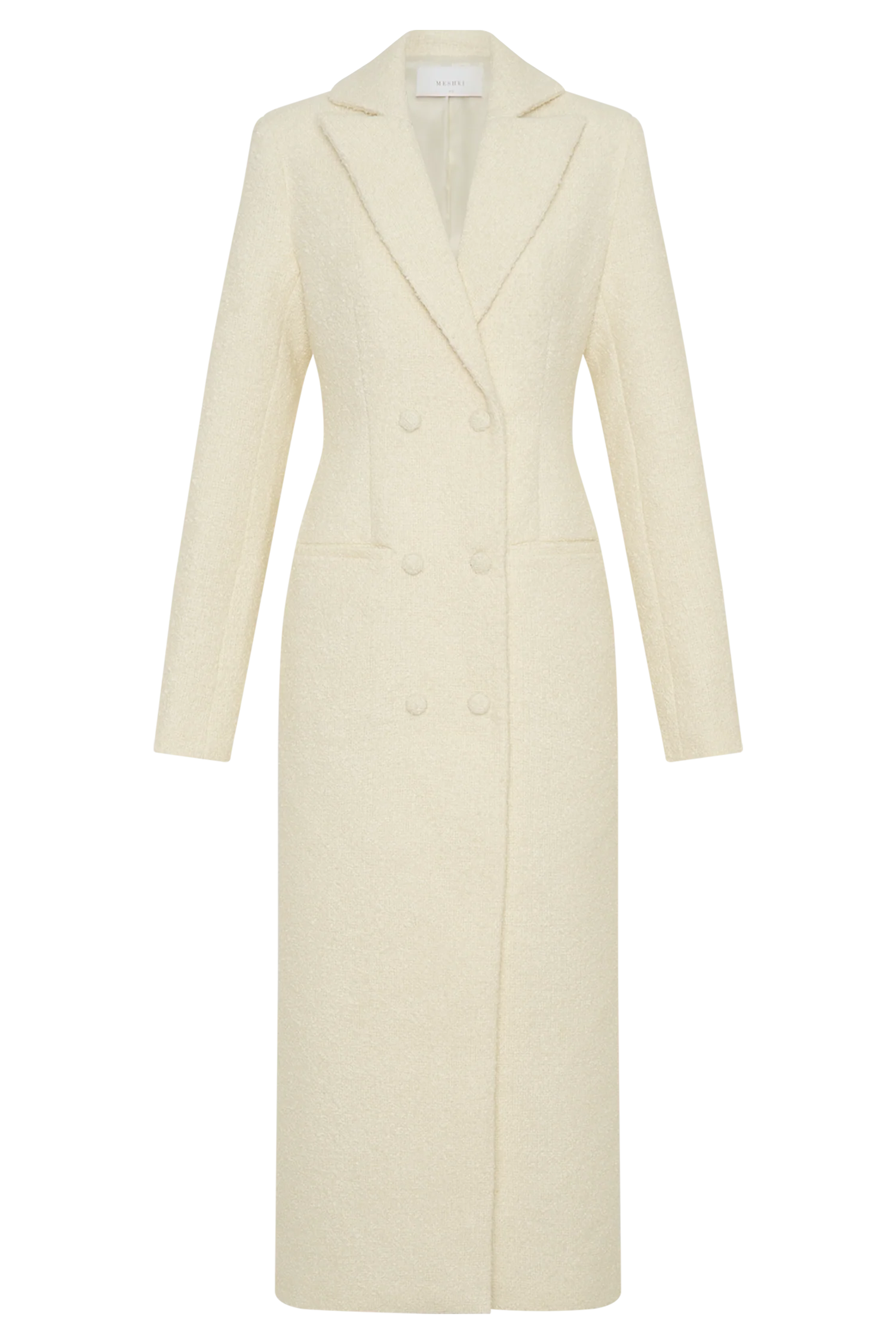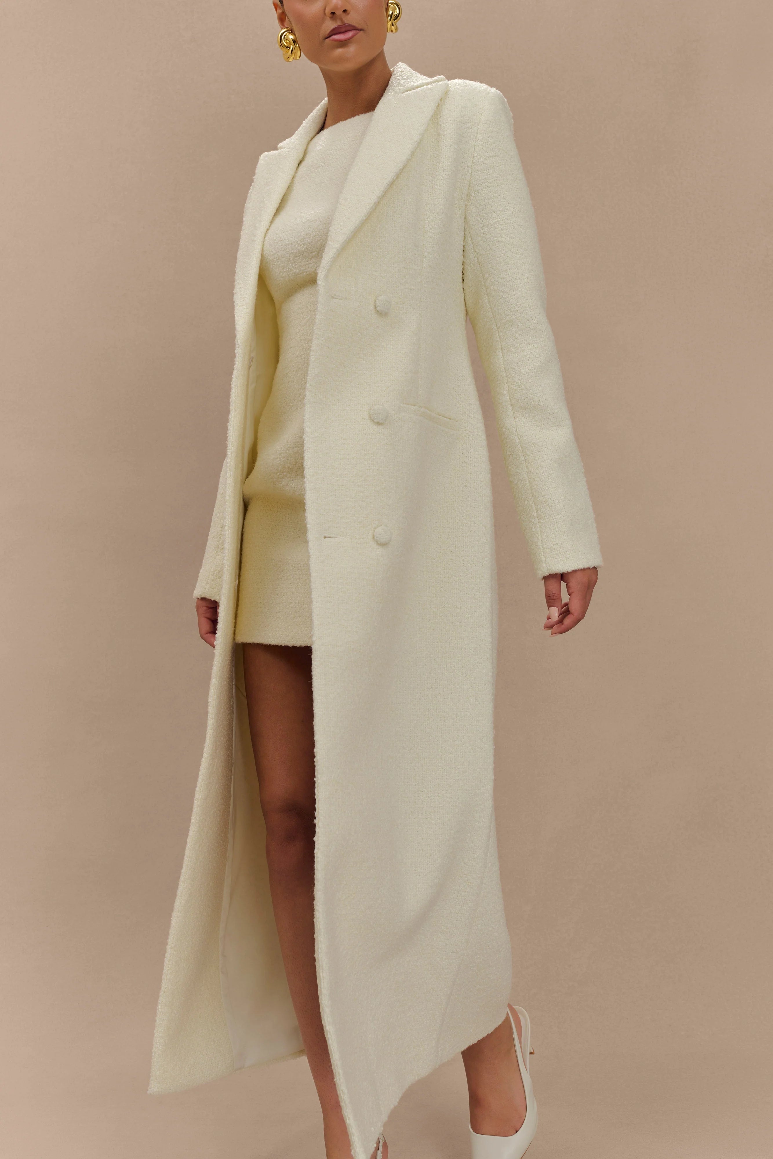 Elevate your outerwear game with the CARVER Boucle Coat, where timeless design meets modern elegance. This coat features a sophisticated V neckline paired with a classic collar and lapel, exuding an air of refined style. The double-breasted design enhances its tailored silhouette, while the long-line cut adds a touch of sophistication that flatters every figure. Crafted from luxurious boucle fabrication, this coat offers both warmth and texture, making it perfect for transitioning between seasons. Functional welt pockets provide practicality without sacrificing style, and the back vent ensures ease of movement.