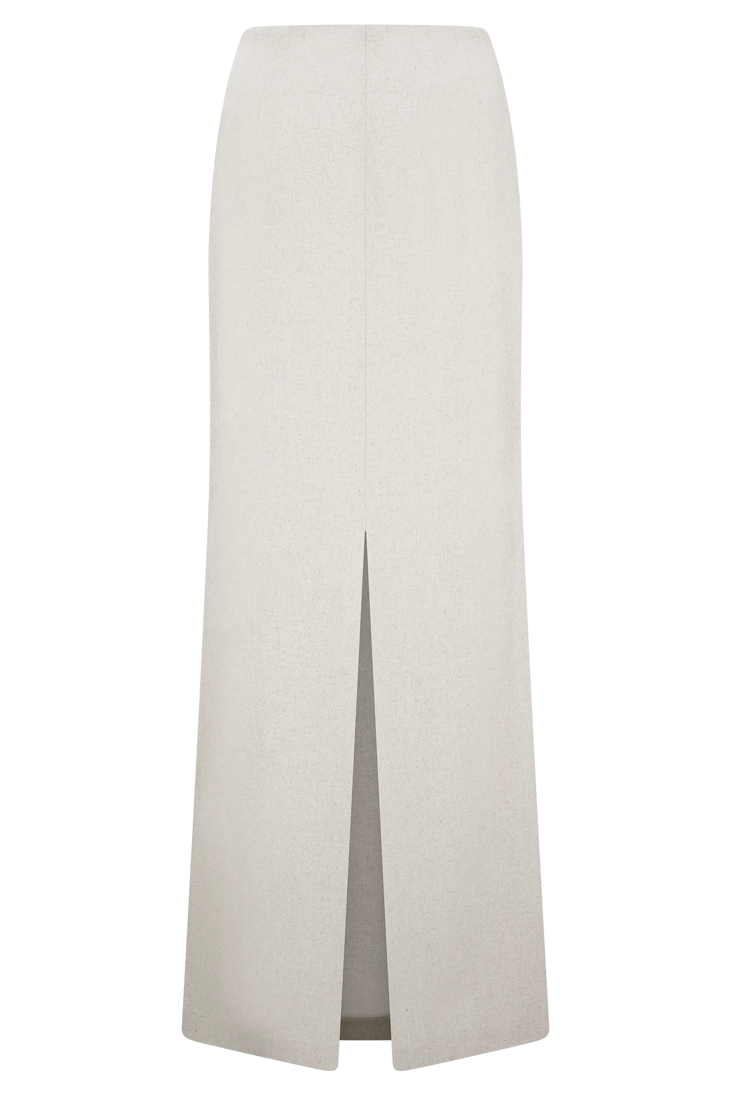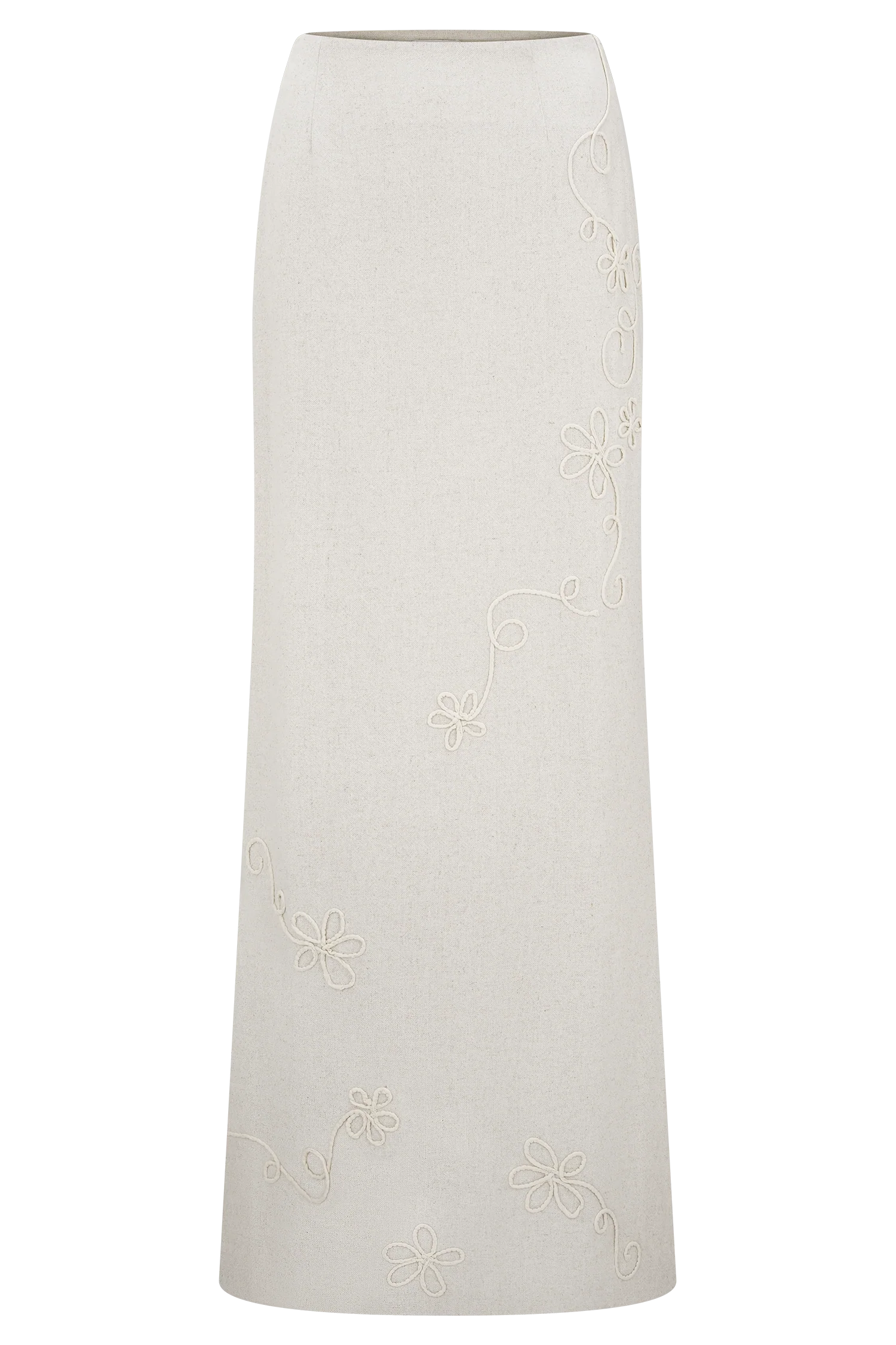 The CASEY Linen Embroidered Maxi Skirt brings effortless refinement to everyday dressing. Crafted in breathable linen with a delicate corded floral design, this mid-rise silhouette flatters with a subtle kick flare and centre back split for ease of movement. Finished with an invisible zip for a seamless fit, this skirt is your go-to for elevated moments in the sun.