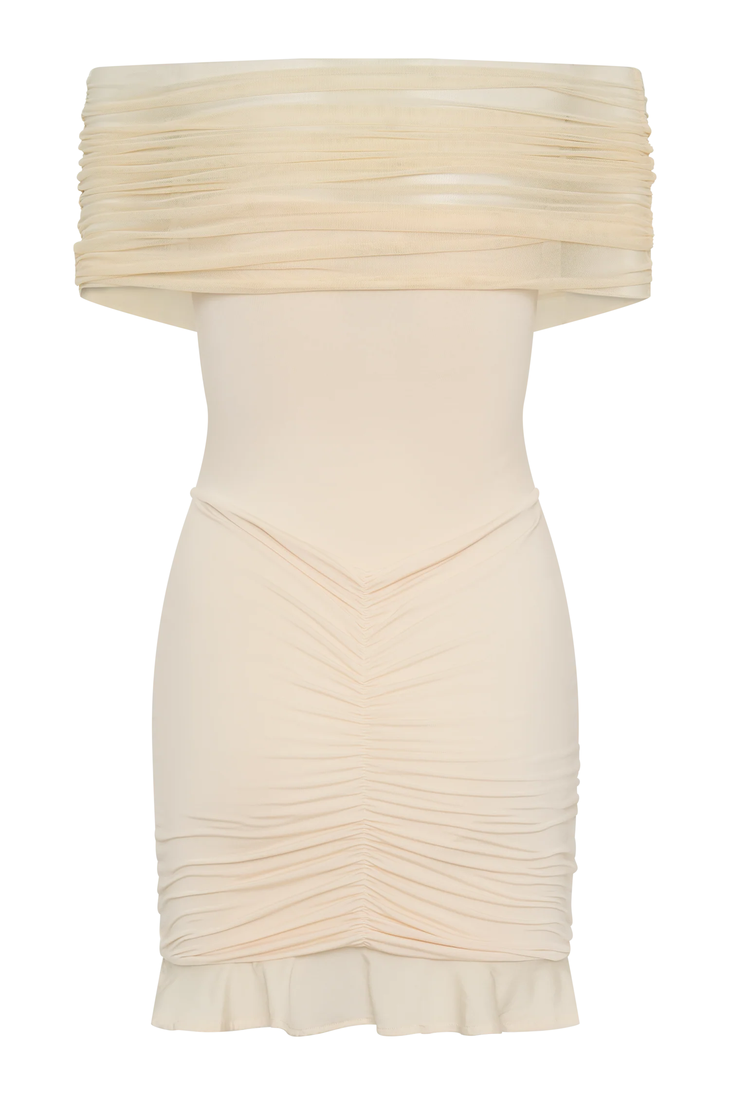 Embrace the magic of Stardust Nights in the CASPIAN Slinky and Mesh Off Shoulder Mini Dress, a stunning blend of sophistication and allure. Designed with a boat neckline and a strapless internal structure beneath a soft mesh overlay, this dress radiates elegance and drama. The ruching detail at the waist enhances your figure, ensuring a flattering, comfortable fit. A playful mesh hem frill adds a touch of whimsy, while the lined bodice provides added comfort and support. With its mini length and captivating design, this dress is the perfect choice for formal events or special occasions, offering a balance of grace and confidence.
