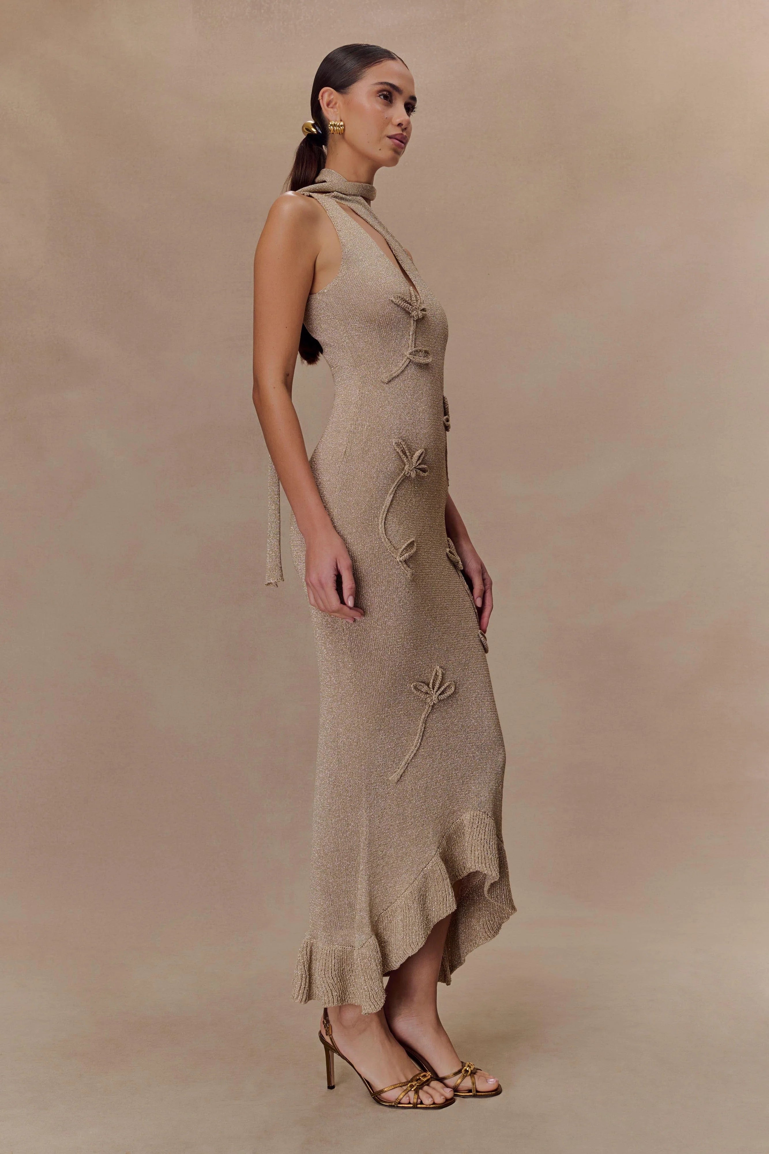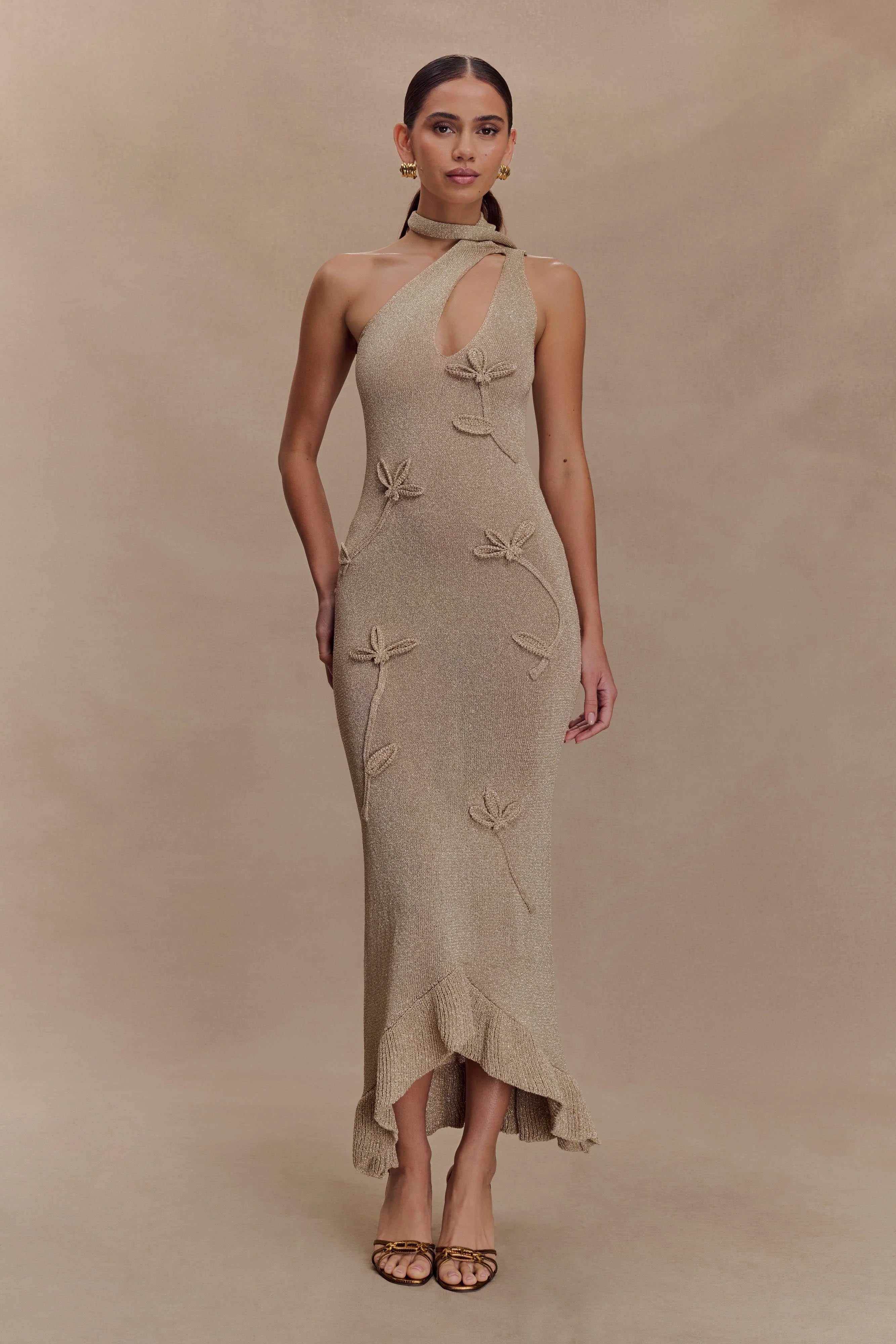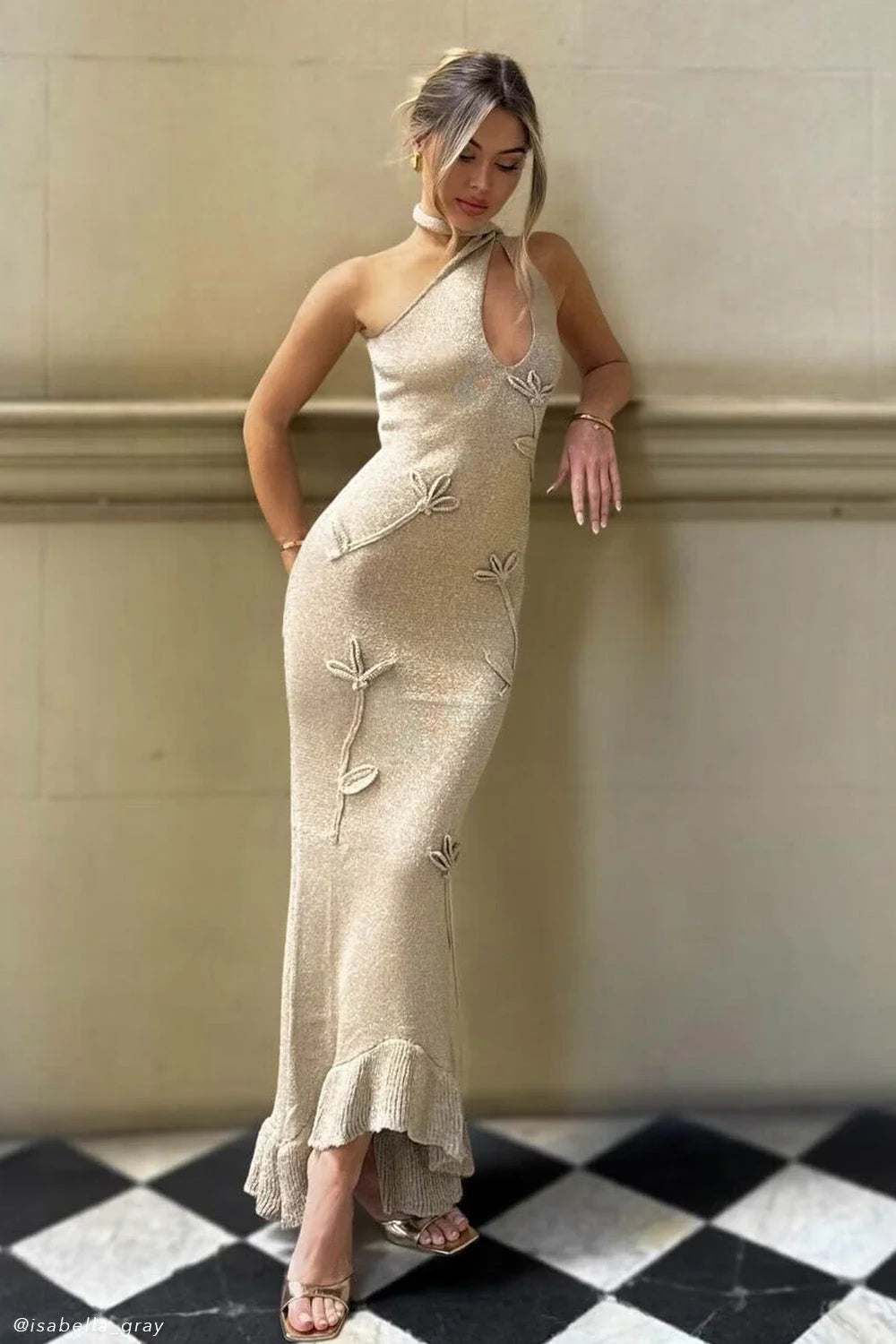 The CELESTINO Floral Metallic Knit Maxi Dress is made for sun-drenched celebrations and moonlit moments. Featuring an asymmetrical one-shoulder neckline with a statement wrap-around neck sash, this bodycon silhouette flatters with sculpted ease. The high-low hem adds graceful movement, finished with a ruffled edge and standout floral appliqué detailing. With a subtle metallic shimmer woven throughout, this dress is your ultimate occasion piece—from beachside dinners to golden hour events that call for something unforgettable.