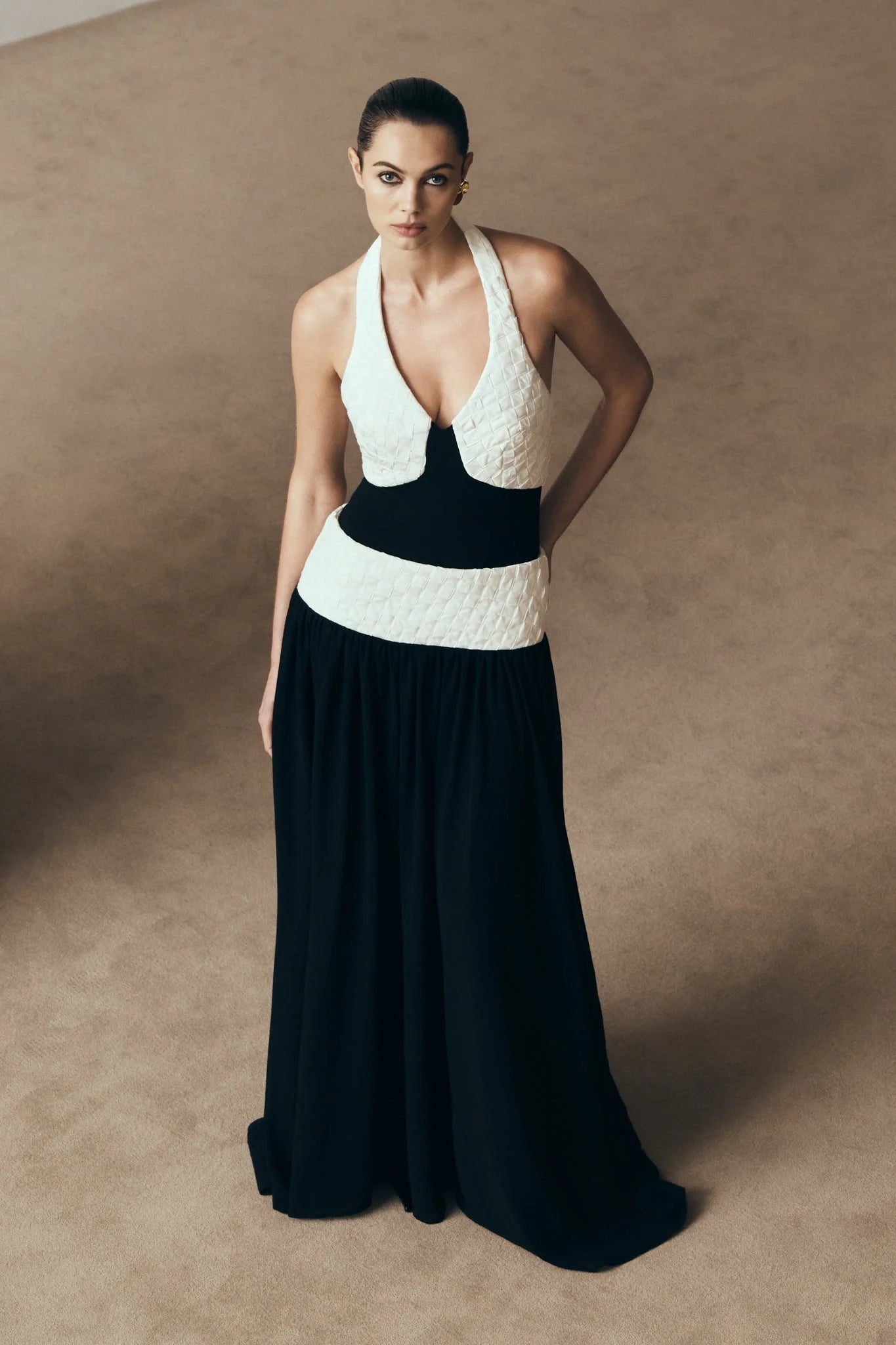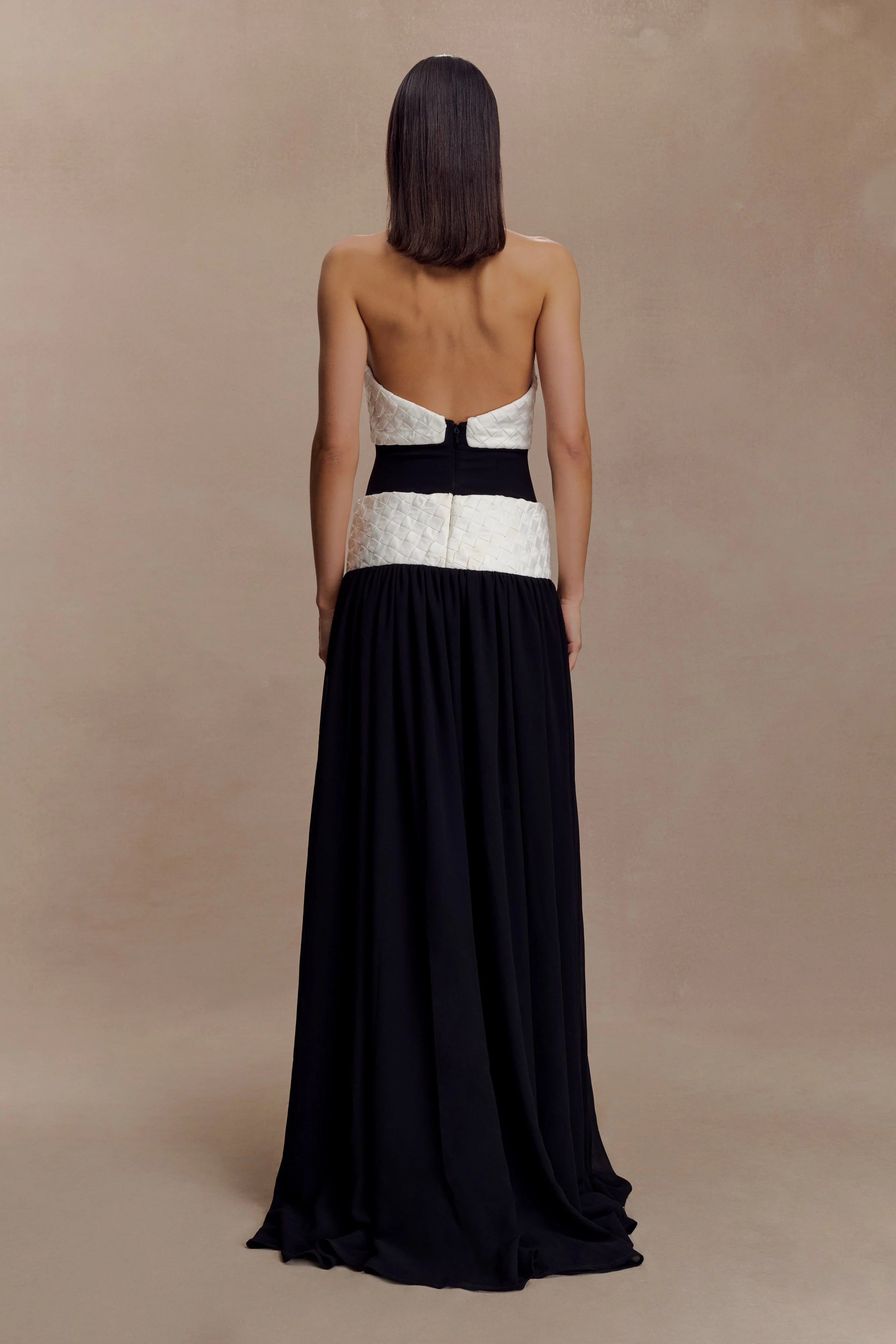 The CELINE Chiffon Maxi Dress is designed with airy movement and refined detailing. Featuring a halter neckline with a secure back button closure, it’s defined by woven bust and waist panels that add subtle texture to the silhouette. The flowing chiffon bodice and skirt fall into a maxi length, offering a relaxed yet graceful fit. Fully lined for comfort and finished with an invisible centre back zip, this dress is the epitome of effortless sophistication.
