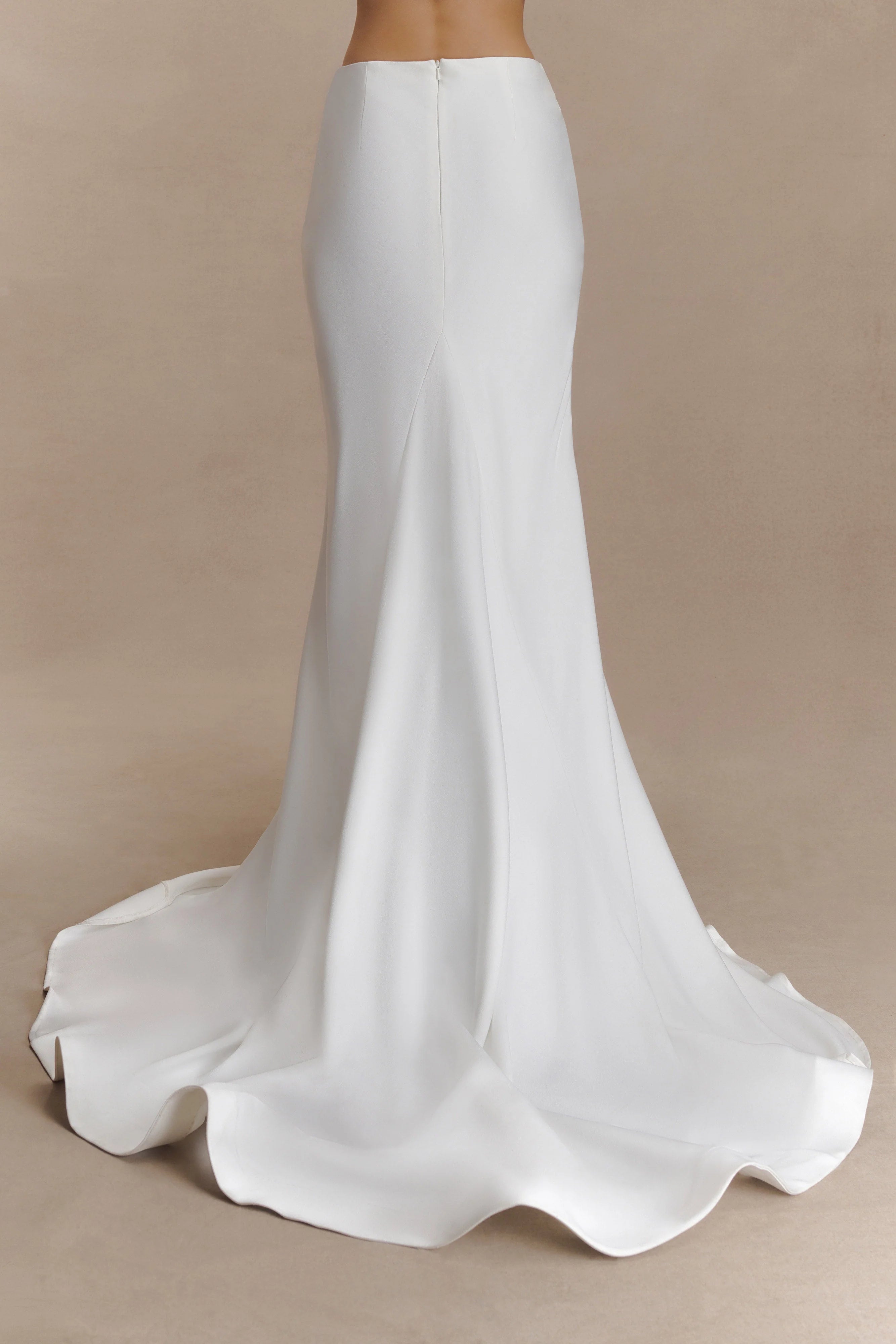 The CLARA Fishtail Maxi Skirt is designed to elongate and define. Sitting at a mid-rise waistline, it skims the hips before flaring into a dramatic fishtail silhouette with a sweeping back train. The invisible back zip ensures a smooth, seamless fit, while full lining offers comfort and structure. Perfect for pairing with corsets, structured tops, or fluid blouses, Clara is an elegant foundation for elevated evening dressing.