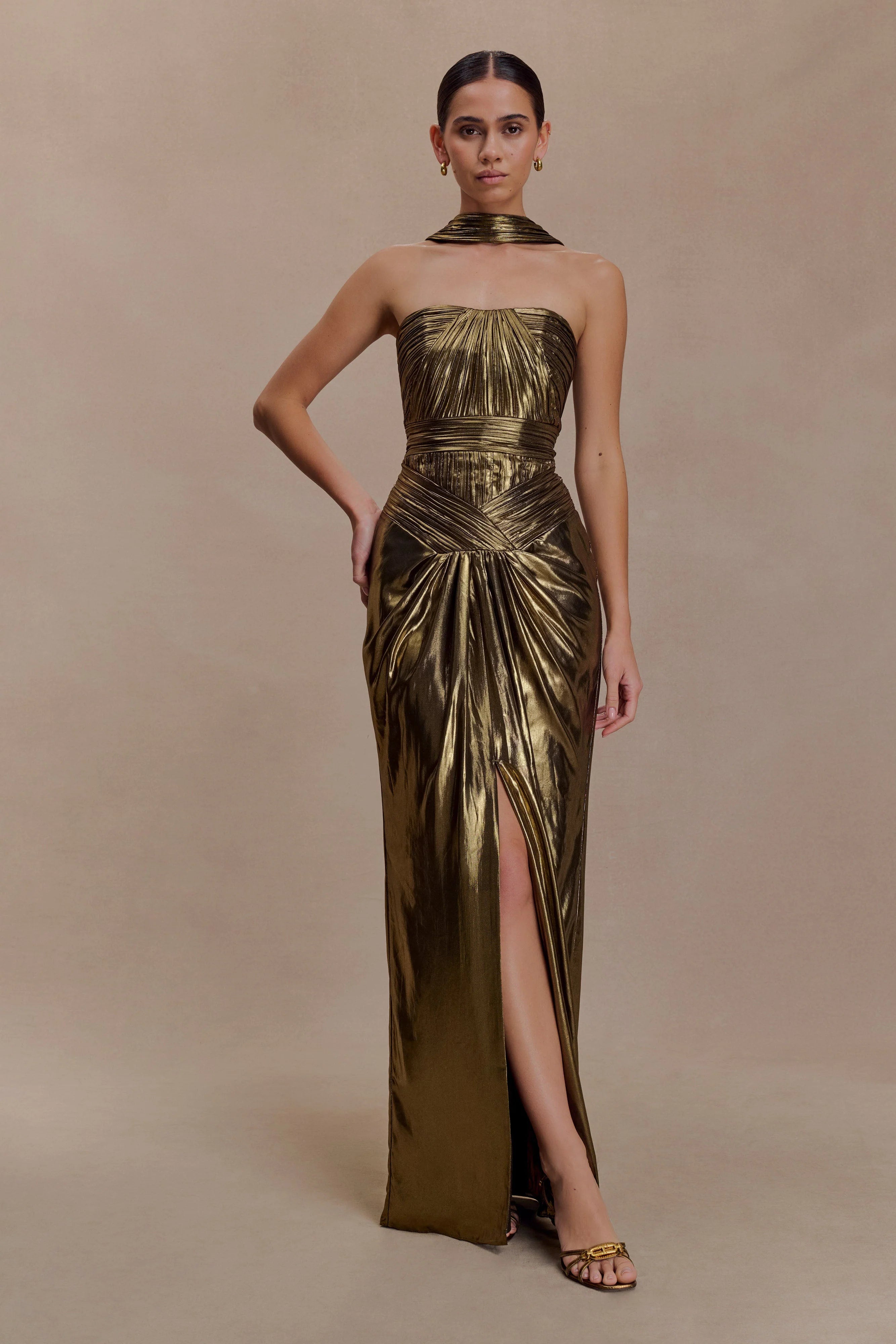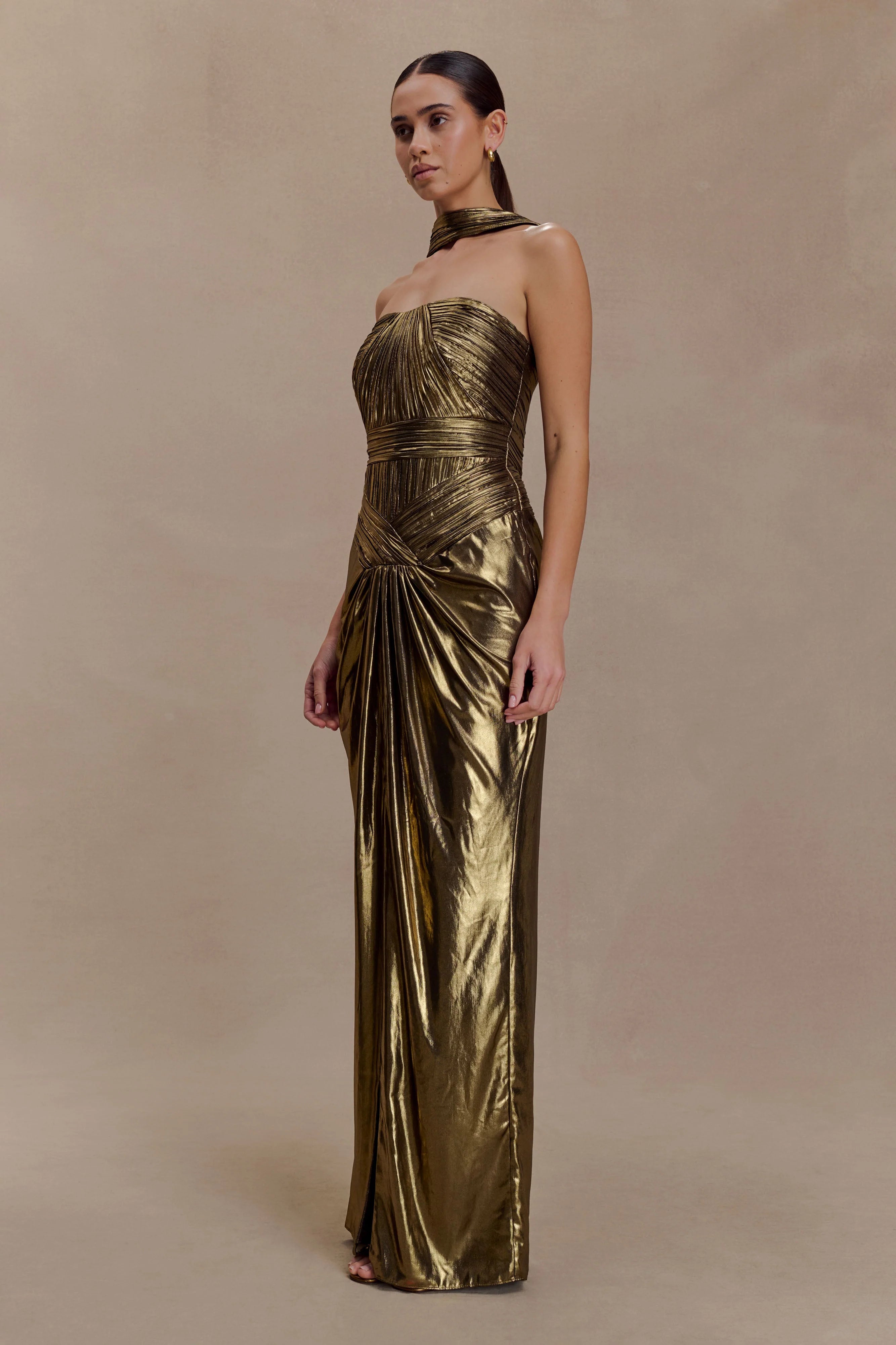 The CLEMENCE Plissé Maxi Dress captures refined movement through precision pleating and a soft draped finish. Designed with a straight neckline and detachable reverse halter strap, it offers versatility with subtle structure. Pleating and panel lines contour the bust and waist before flowing into a relaxed, bodycon silhouette. Finished with a centre front split for fluidity and ease, this dress is fully lined for a smooth fit—balancing sophistication with modern femininity.