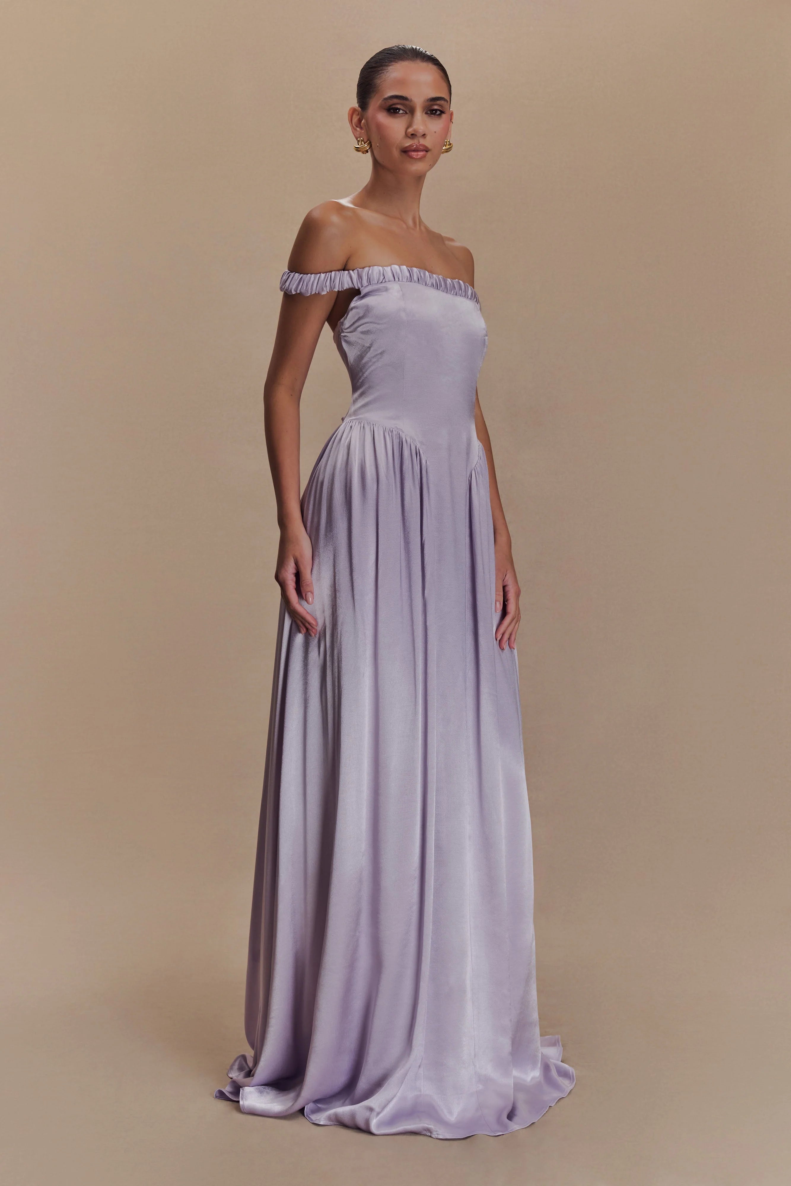 The COCO Dropped Waist Maxi Dress is a stunning blend of elegance and sophistication. Featuring an off-the-shoulder design with a ruched neckline detail, this dress highlights your décolletage while exuding timeless charm. The fitted bodice and front-and-back shaped waist detail create a flattering silhouette, flowing into a gathered skirt for added drama. With a maxi length, back zip closure, and full lining, this dress is crafted for both comfort and glamour, ensuring you’ll stand out at any special occasion.