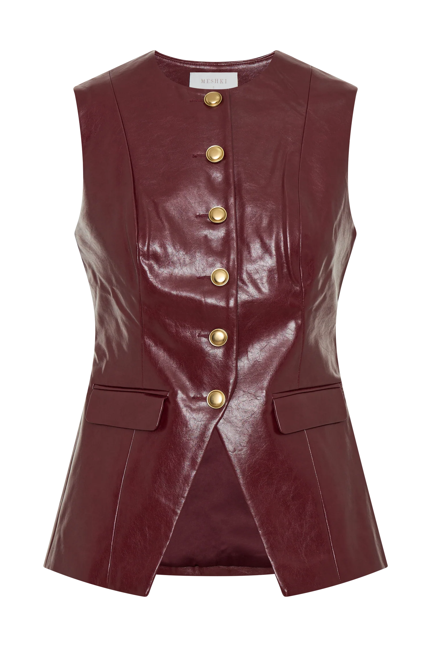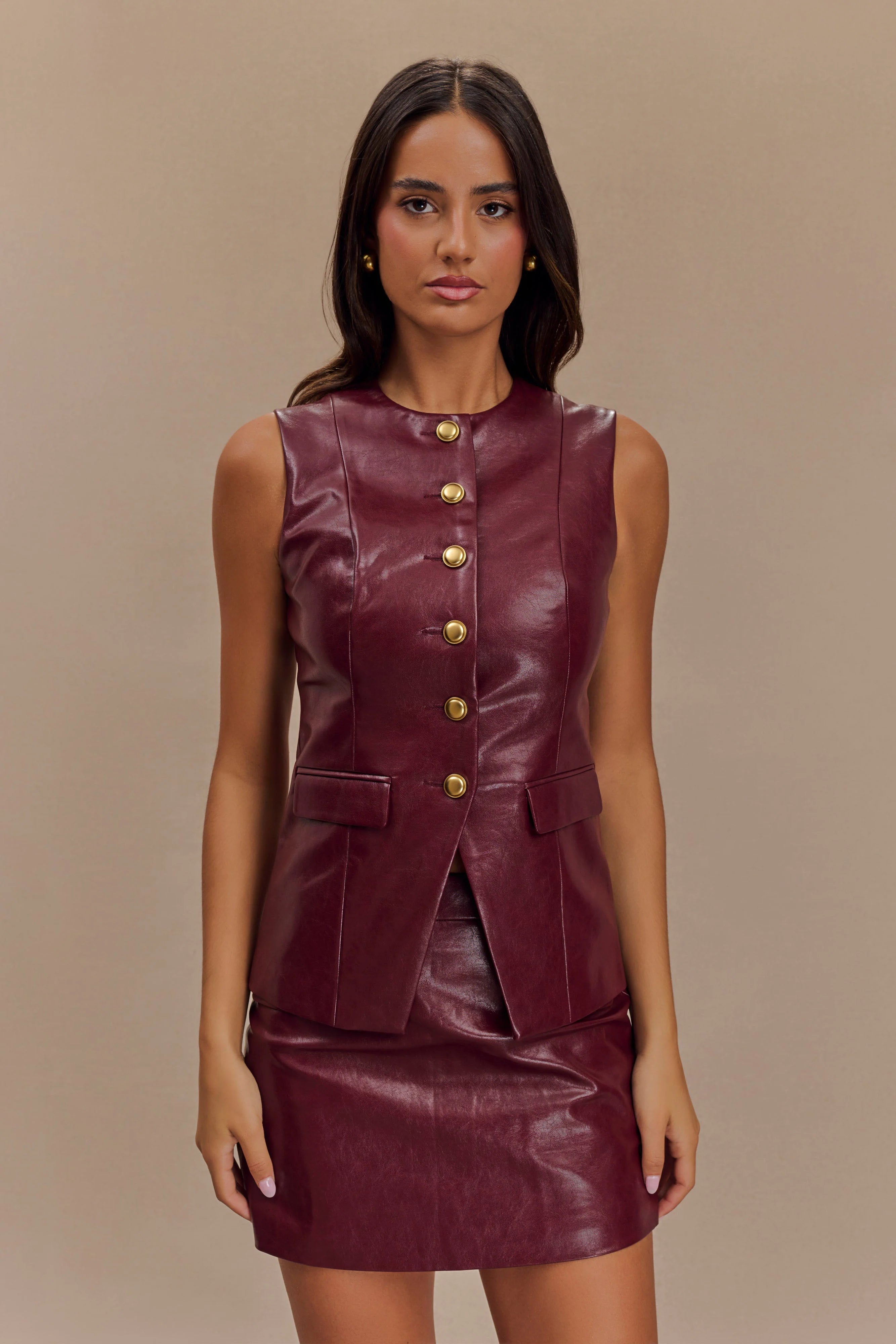 Introducing the CORALIA Faux Leather Sleeveless Vest—a striking addition to any modern wardrobe. With its sleek crew neckline and sleeveless, longline silhouette, this vest brings a refined touch of edge to any look. The button-front closure adds classic detail, while non-functional pockets enhance its structured design. Fully lined for comfort and crafted from luxurious PU fabrication, the Coralia vest is perfect for layering or styling solo as a statement piece. Pair it with the for an ensemble that exudes confidence and style.