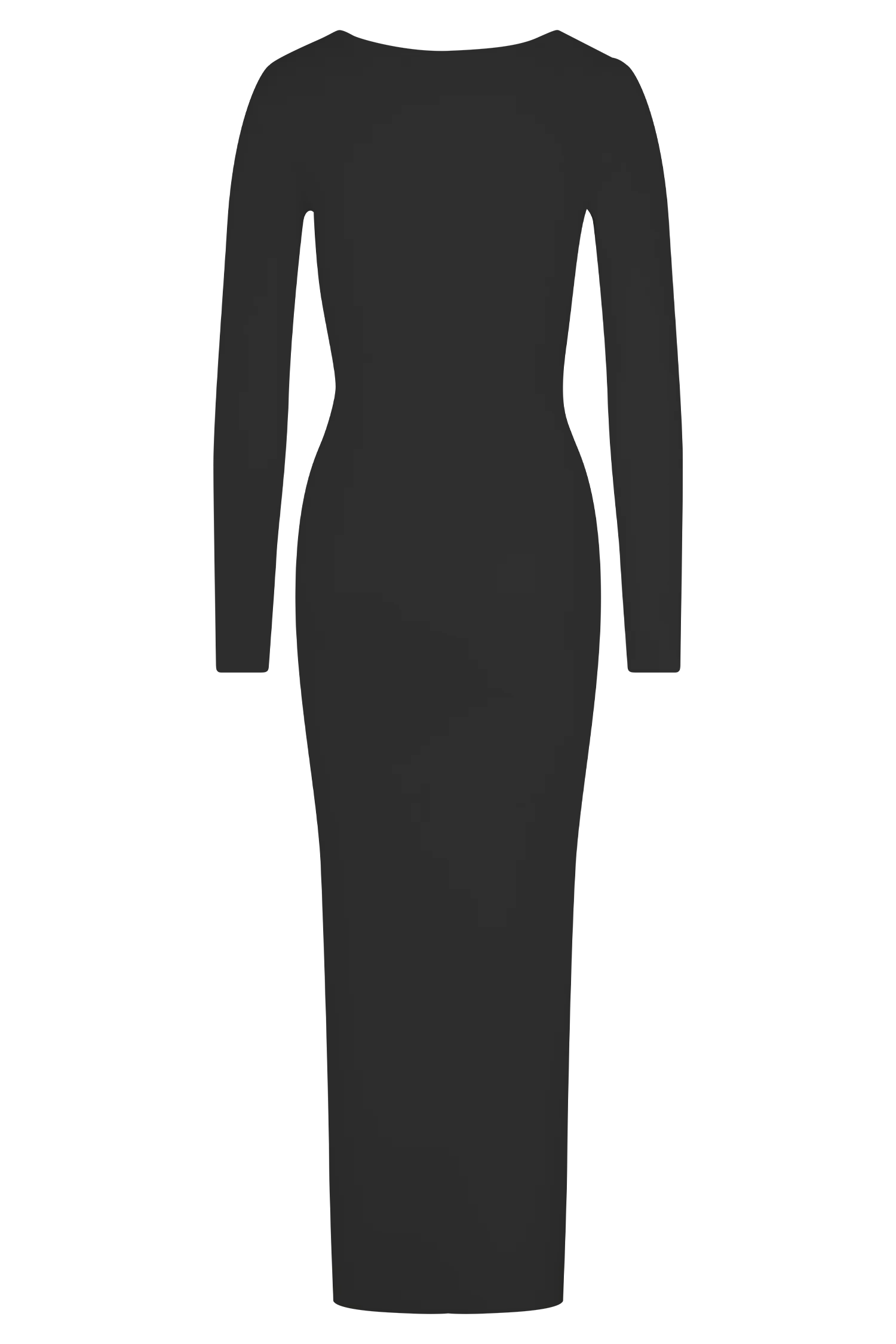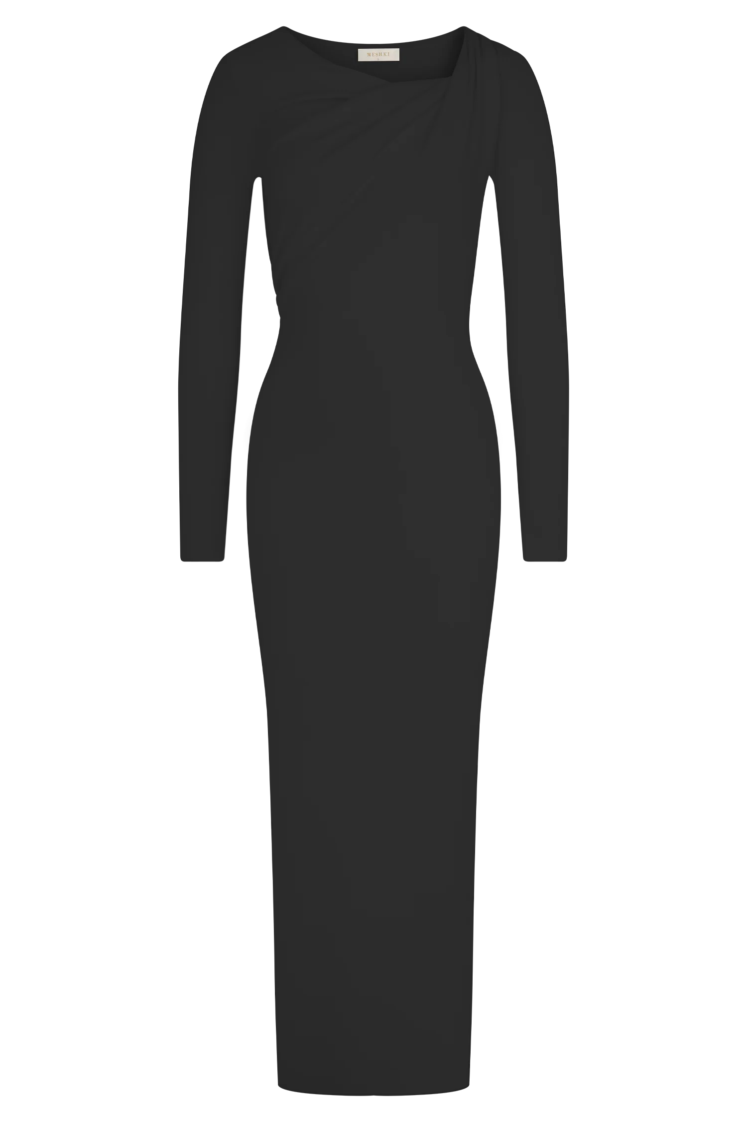 The CULVER Draped Twist Knit Maxi Dress is a refined statement of modern sophistication. Designed with a striking twisted neckline, this fitted silhouette effortlessly enhances your figure while offering a sleek, contemporary edge. The long sleeves balance the form-fitting design, while the midi length adds a touch of understated allure. Crafted from soft, unlined knit for a lightweight feel, this dress is perfect for both daytime polish and evening refinement.