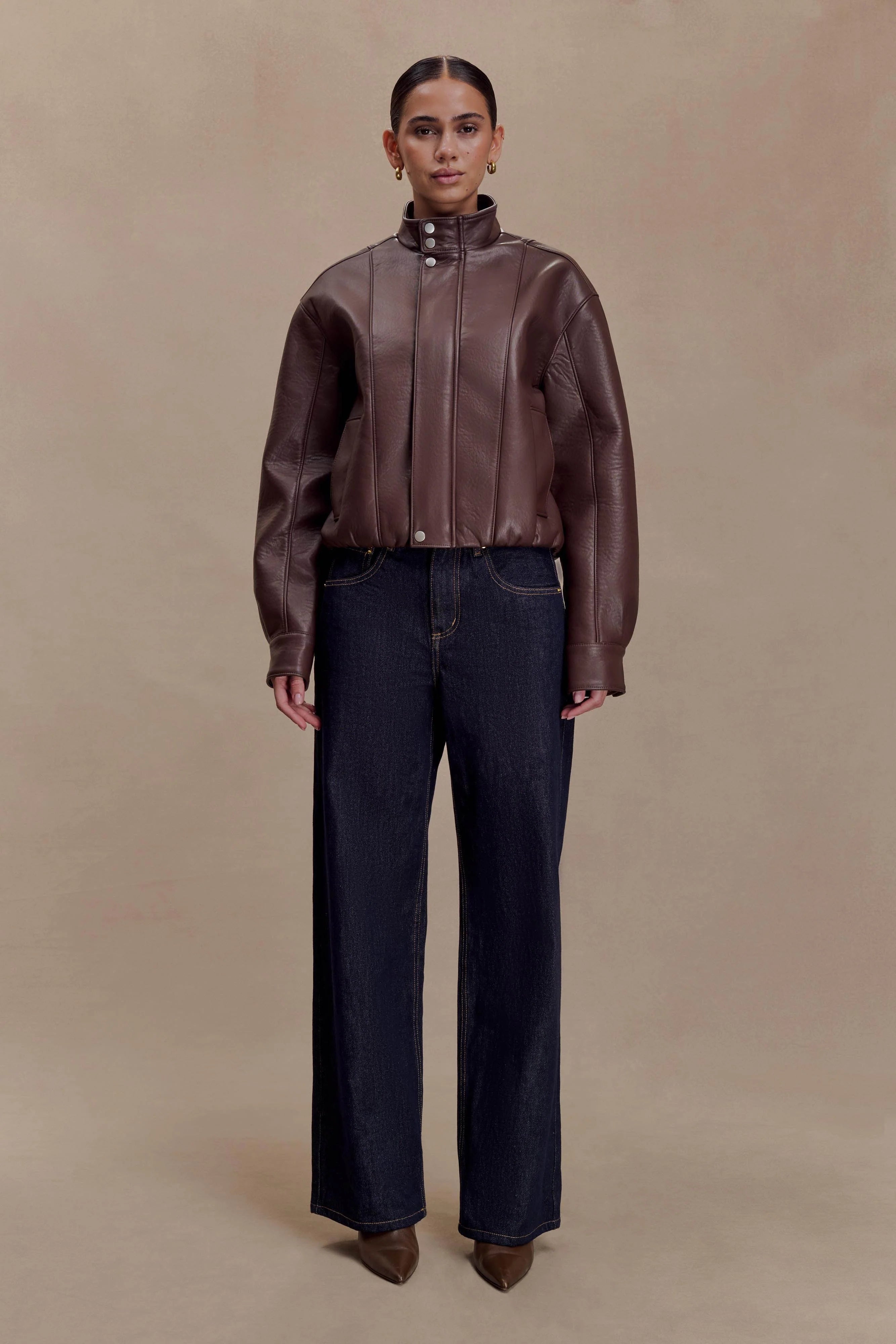 The CURTIS Faux Leather Bomber Jacket reimagines a wardrobe staple with a sleek, refined edge. Designed with a mandarin collar and front and back panel lines, it creates a clean, structured silhouette. The boxy fit adds a modern proportion, while a concealed front zipper placket and three snap buttons at the collar and hem ensure a polished finish. Fully lined for comfort and longevity, this jacket pairs effortlessly with both denim and tailoring for a timeless off-duty look.