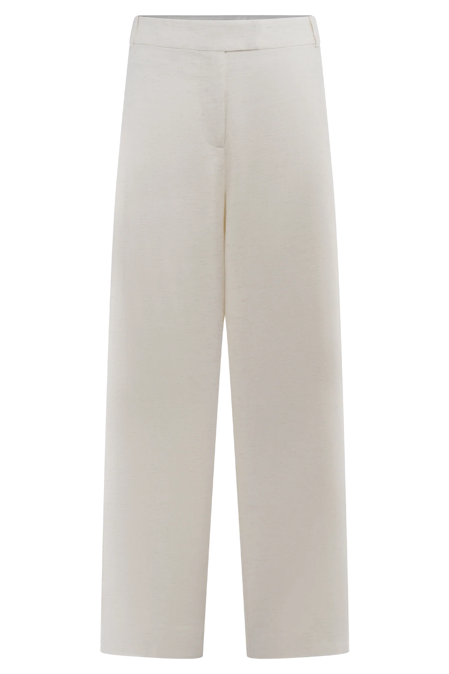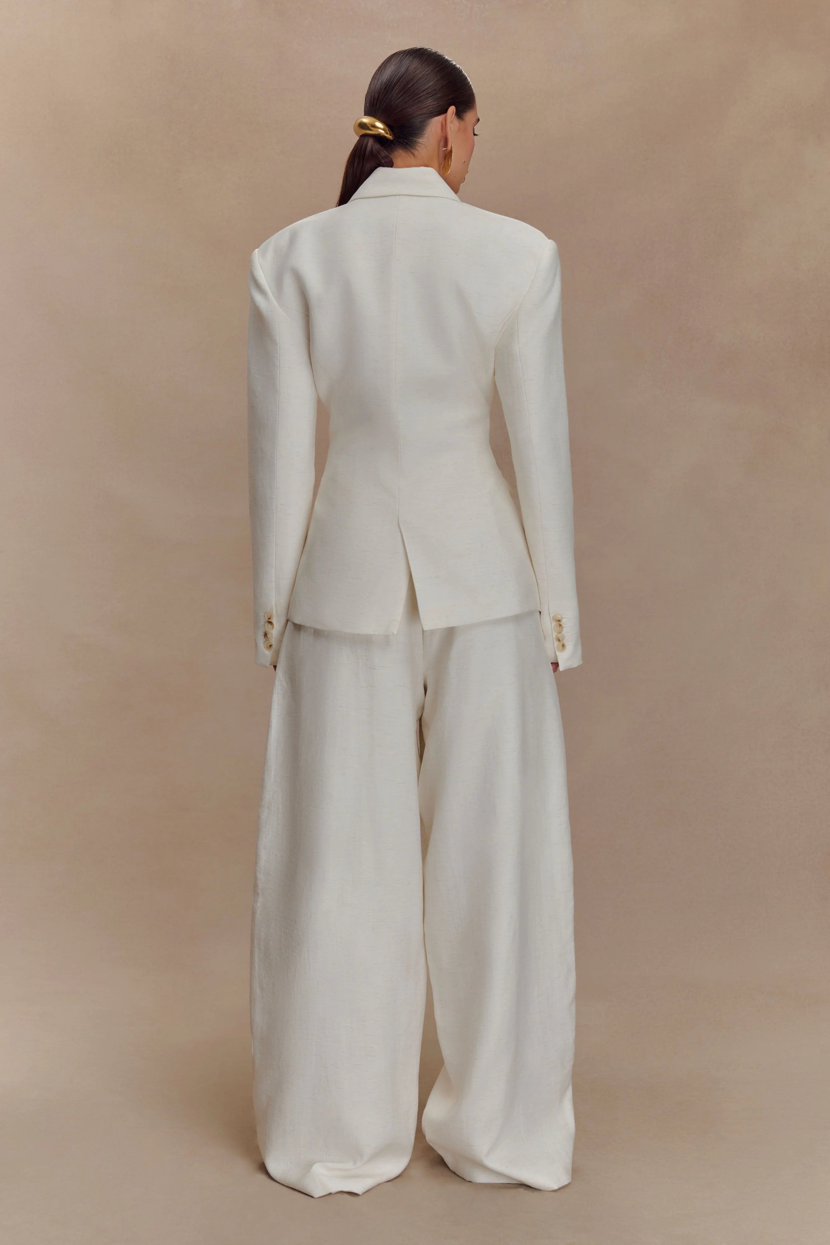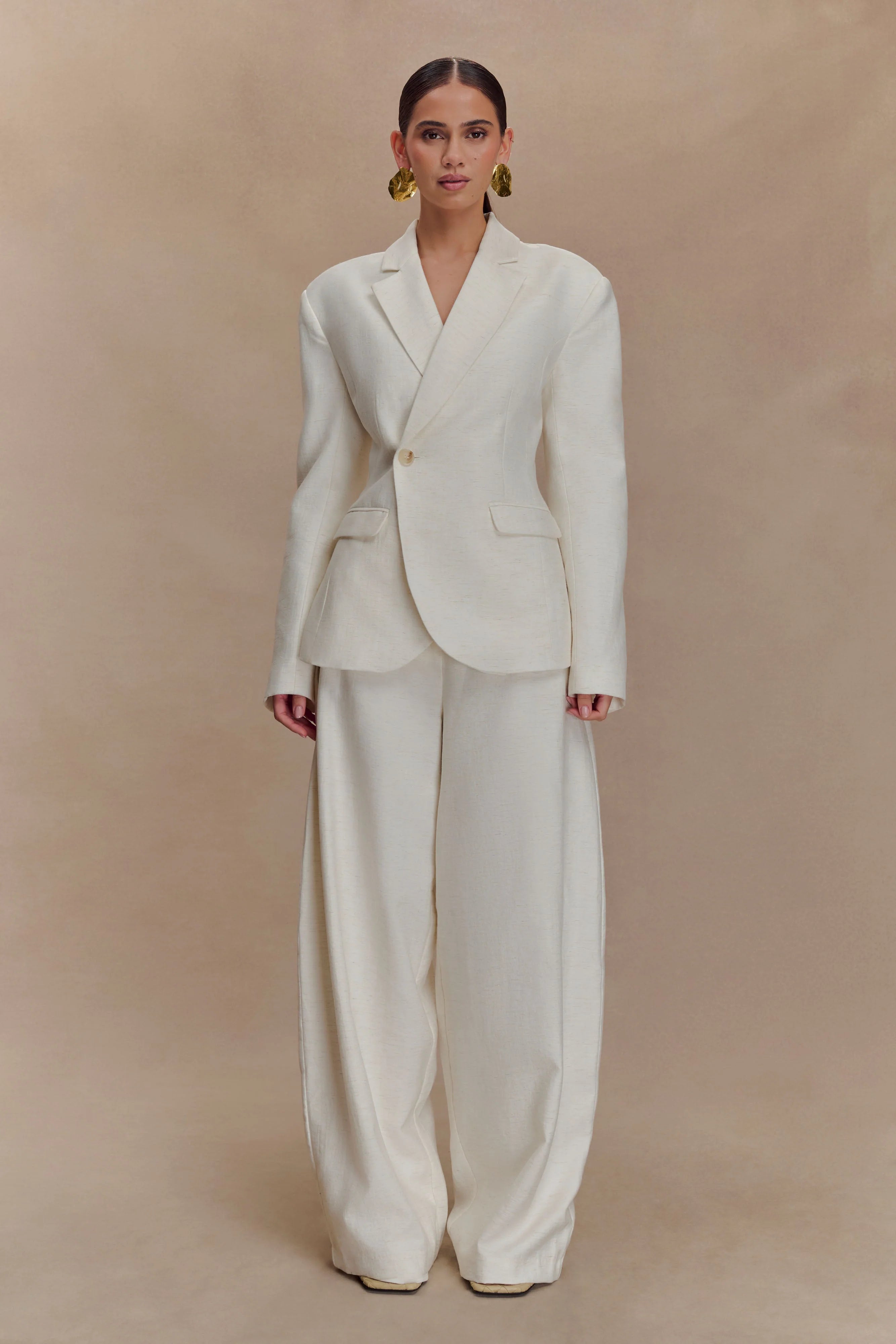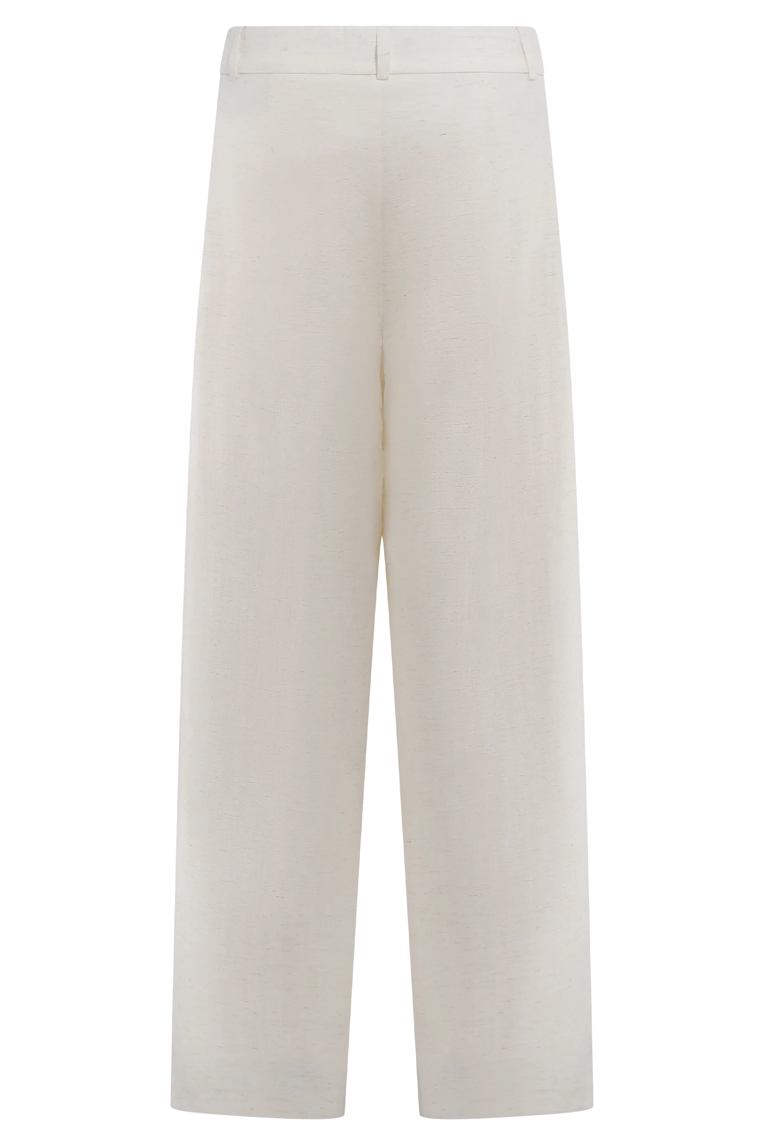 The CYRENE Linen Wide Leg Pants offer a modern take on timeless tailoring. Designed with a flattering high waist and a deep waistband, these full-length pants feature a barrel leg silhouette that brings volume and ease to everyday styling. Finished with belt loops, side pockets, and a clean hook-and-bar closure, these pants delivers comfort with a crisp, polished edge. Pair with the for a coordinated look that blends structured sophistication with effortless movement—perfect for city days and summer dressing.