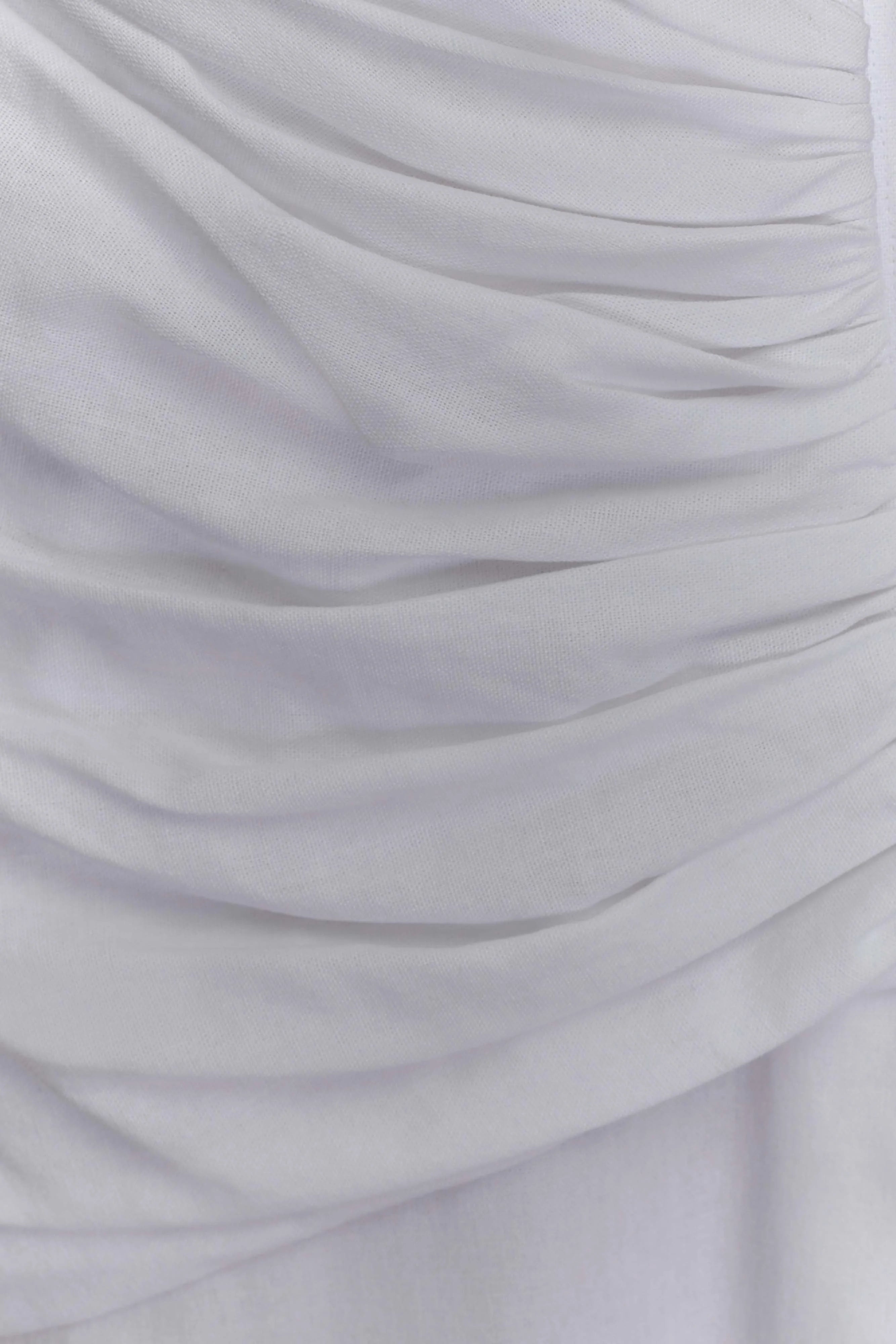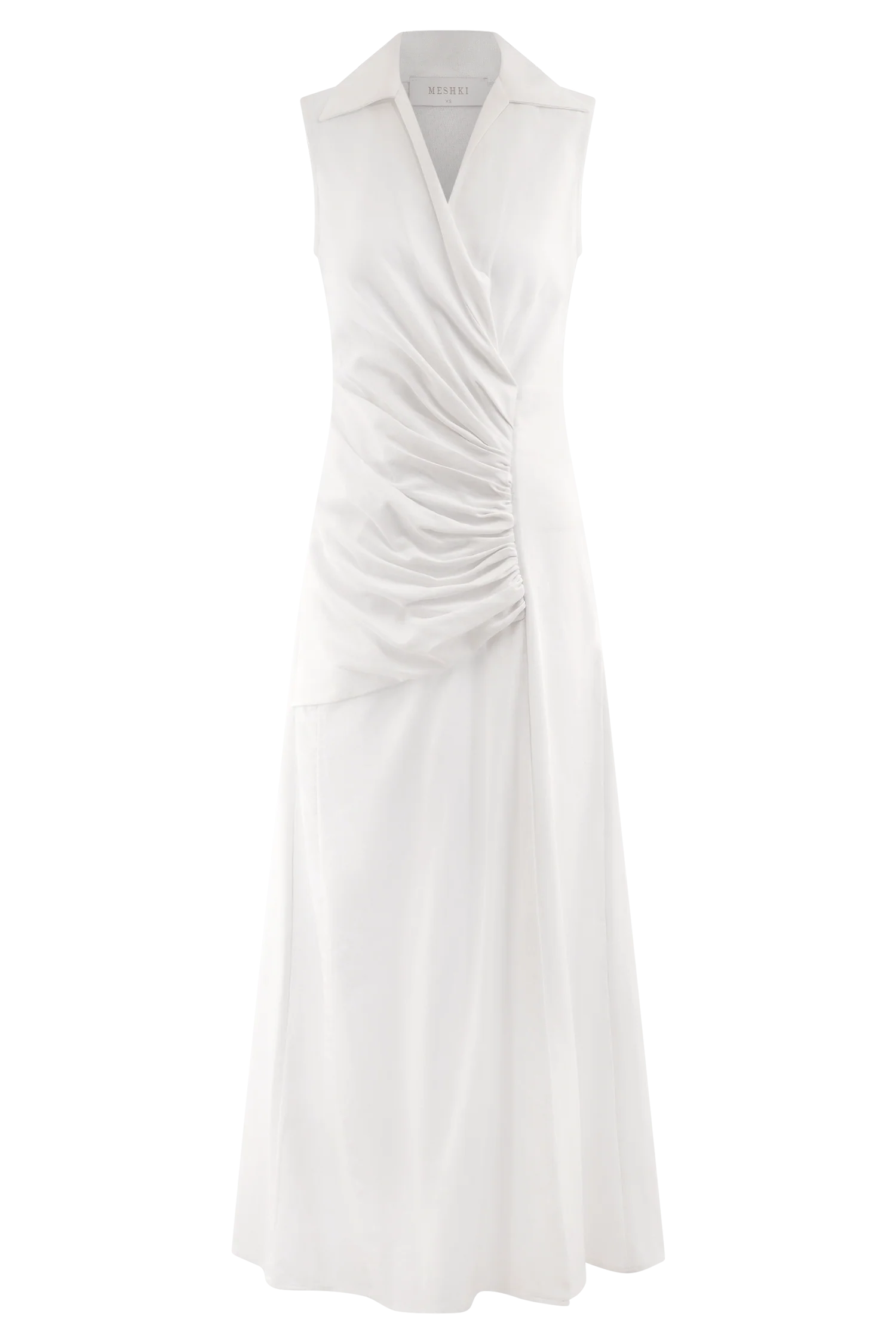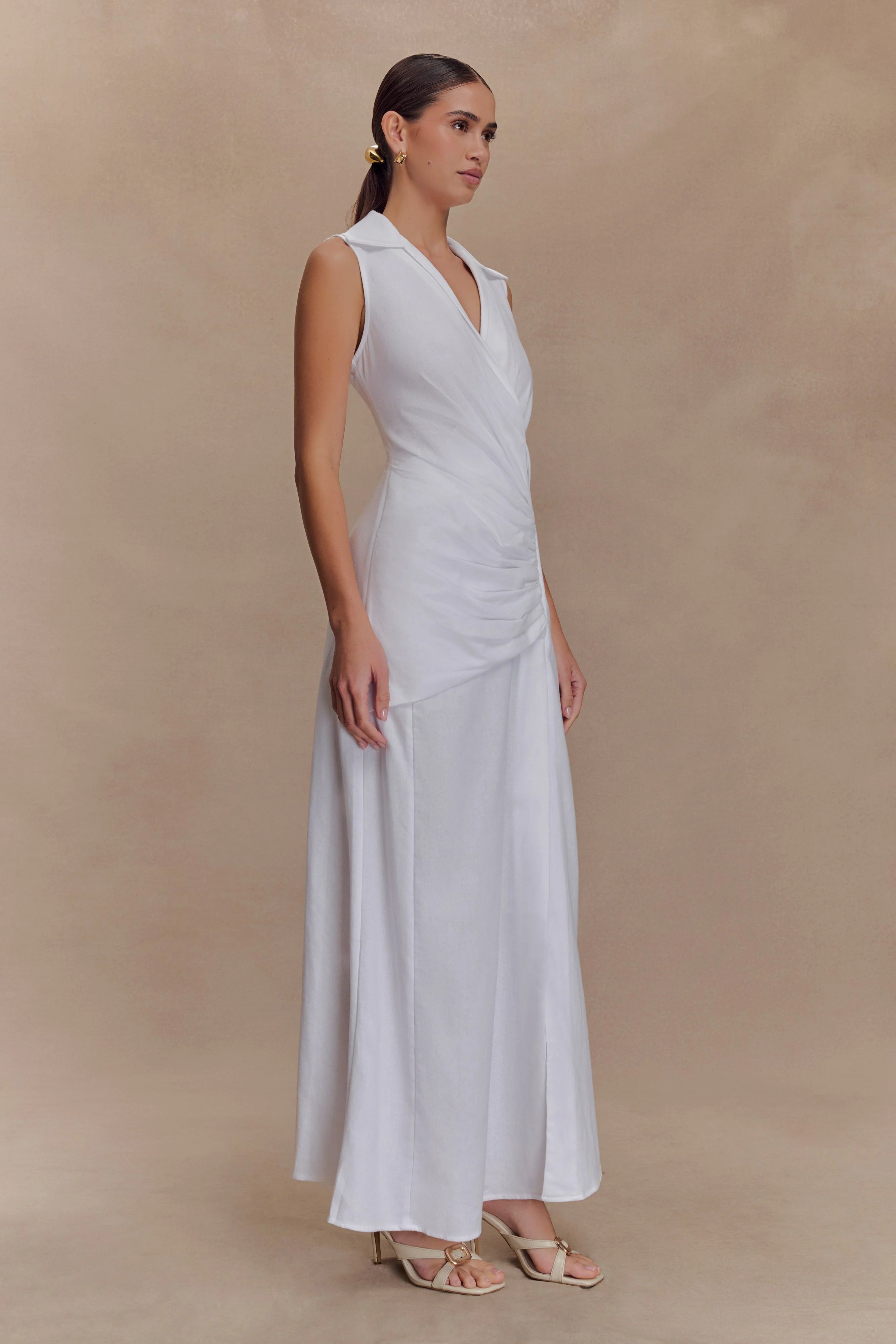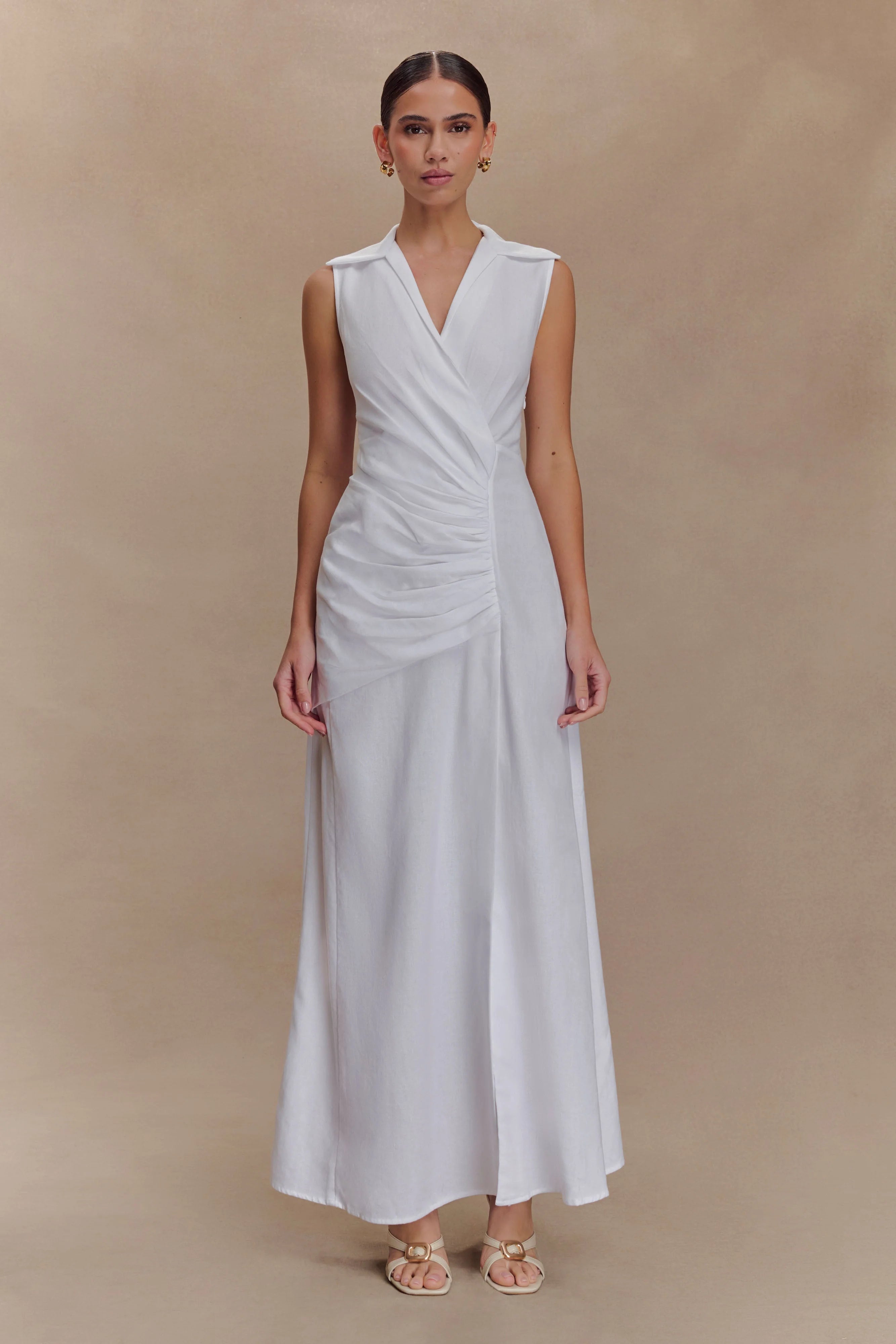 The DANTE Ruched Linen Midi Dress blends structured tailoring with effortless drape. Featuring a sharp collar, sleeveless cut, and an asymmetric placket, this linen midi is defined by its wrap front silhouette, softly gathered at the side seam to sculpt the waist. Back darts enhance the shape, while an invisible side zip ensures a seamless fit. Light, breathable, and elevated, this dress is perfect for warm-weather getaways, coastal dinners, or city strolls with a refined twist.