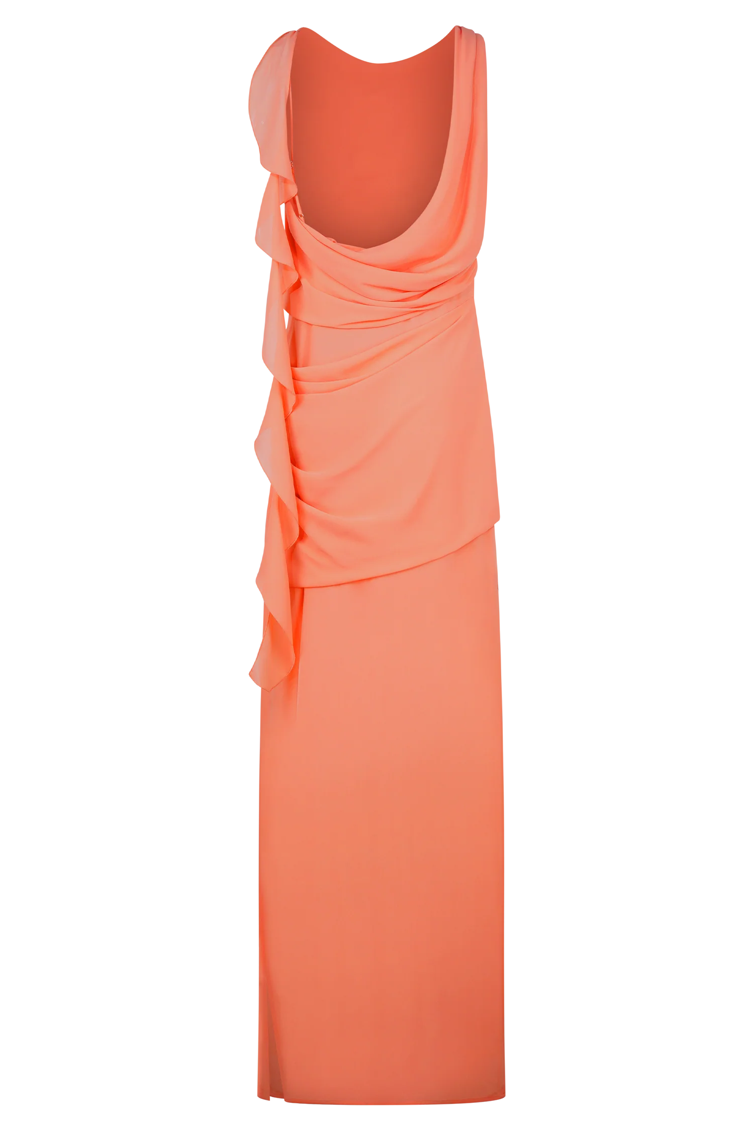 The DARIA Draped Chiffon Maxi Dress is a study in graceful movement and refined drama. Featuring a soft boat cowl neckline and a daring low back, this silhouette is elevated with a cascading drape from the back shoulder and layered chiffon overlays that float at the hip. Fully lined for a smooth fit and finished with an invisible side zip, this dress brings ethereal sophistication to any special occasion.